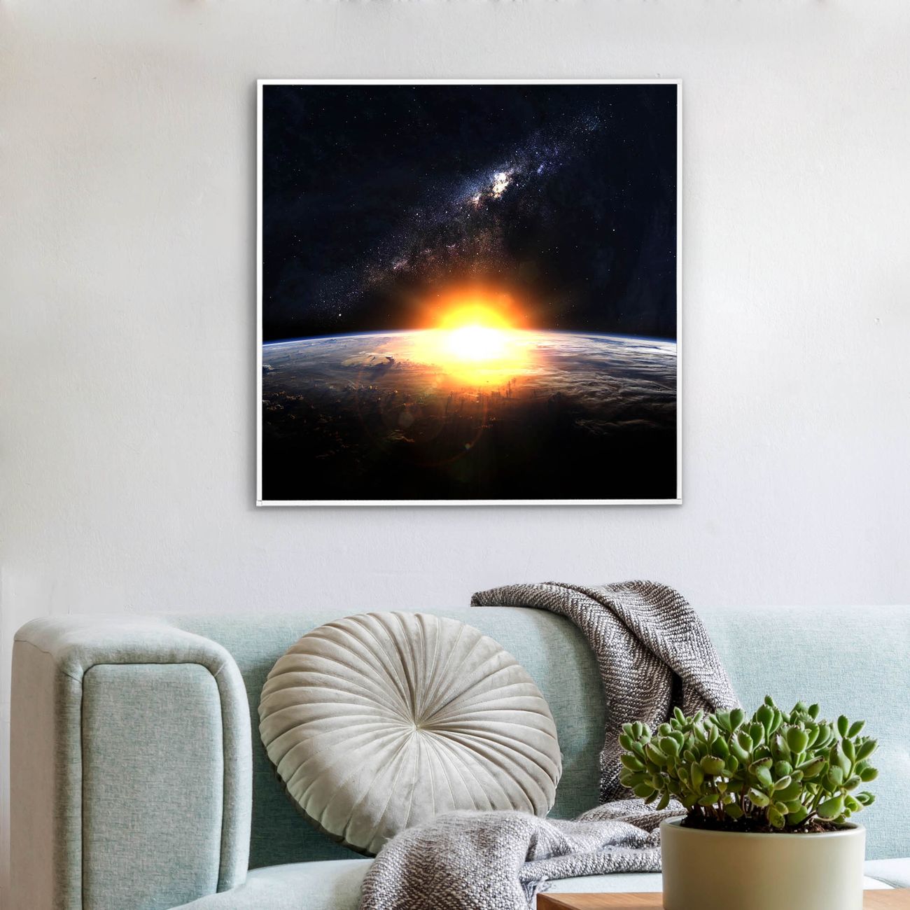 Mit der banjado smarten LED Wandleuchte mit Motiv Sonne im Weltall schaffen Sie in Ihren Räumen eine besondere Atmosphäre. Abends spendet die Wandlampe Licht und tagsüber haben Sie ein stimmungsvolles Wandbild. Die Leuchte besteht aus einem zeitlosen weißen Rahmen, in den das smarte WLAN LED Paneel sowie das Bild eingefasst wird. Die Montage ist denkbar einfach, Sie erhalten eine detaillierte Aufbauanleitung sowie Montagematerial. Eine angenehme Lichtquelle erhöht nachweislich das Wohlbefinden. Das Motiv der Leuchte lässt sich leicht wechseln, so können Sie Ihre Wohnräume individuell gestalten. Die Montage ist an der Wand oder an der Decke möglich.