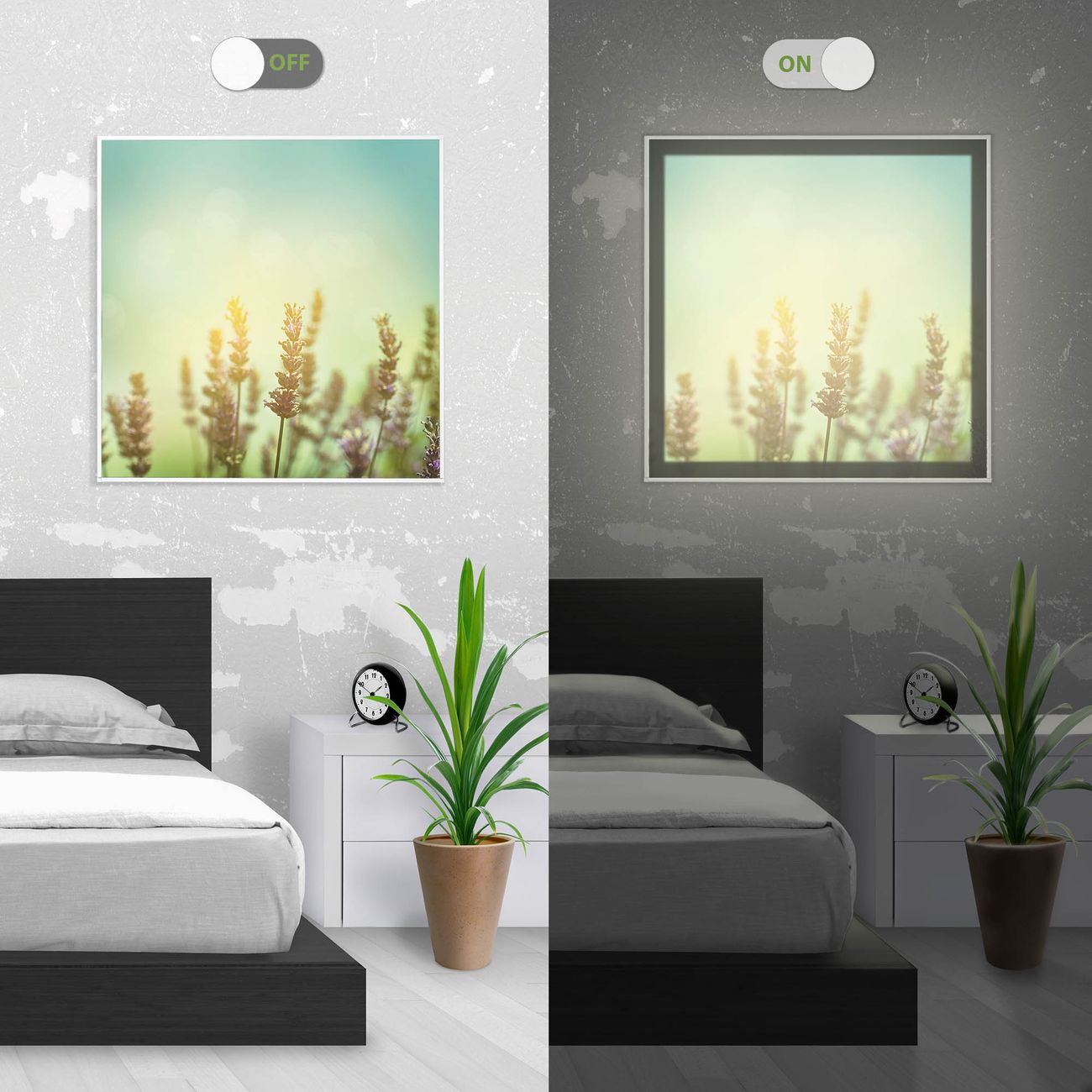 Mit der banjado smarten LED Wandleuchte mit Motiv Sonnenlavendel schaffen Sie in Ihren Räumen eine besondere Atmosphäre. Abends spendet die Wandlampe Licht und tagsüber haben Sie ein stimmungsvolles Wandbild. Die Leuchte besteht aus einem zeitlosen weißen Rahmen, in den das smarte WLAN LED Paneel sowie das Bild eingefasst wird. Die Montage ist denkbar einfach, Sie erhalten eine detaillierte Aufbauanleitung sowie Montagematerial. Eine angenehme Lichtquelle erhöht nachweislich das Wohlbefinden. Das Motiv der Leuchte lässt sich leicht wechseln, so können Sie Ihre Wohnräume individuell gestalten. Die Montage ist an der Wand oder an der Decke möglich.