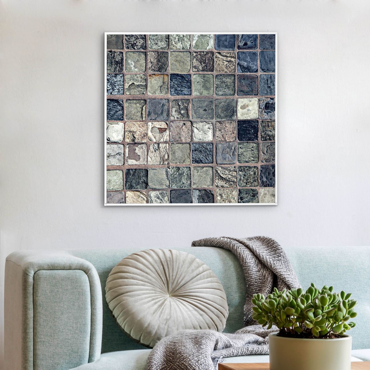 Mit der banjado smarten LED Wandleuchte mit Motiv Steinfliesen schaffen Sie in Ihren Räumen eine besondere Atmosphäre. Abends spendet die Wandlampe Licht und tagsüber haben Sie ein stimmungsvolles Wandbild. Die Leuchte besteht aus einem zeitlosen weißen Rahmen, in den das smarte WLAN LED Paneel sowie das Bild eingefasst wird. Die Montage ist denkbar einfach, Sie erhalten eine detaillierte Aufbauanleitung sowie Montagematerial. Eine angenehme Lichtquelle erhöht nachweislich das Wohlbefinden. Das Motiv der Leuchte lässt sich leicht wechseln, so können Sie Ihre Wohnräume individuell gestalten. Die Montage ist an der Wand oder an der Decke möglich.
