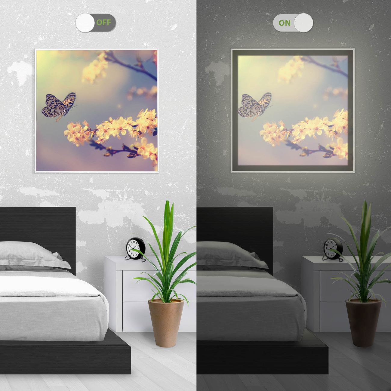 Im eingeschalteten Zustand wirft das Bild einen Schatten wie in der ersten Ansicht zu sehen.