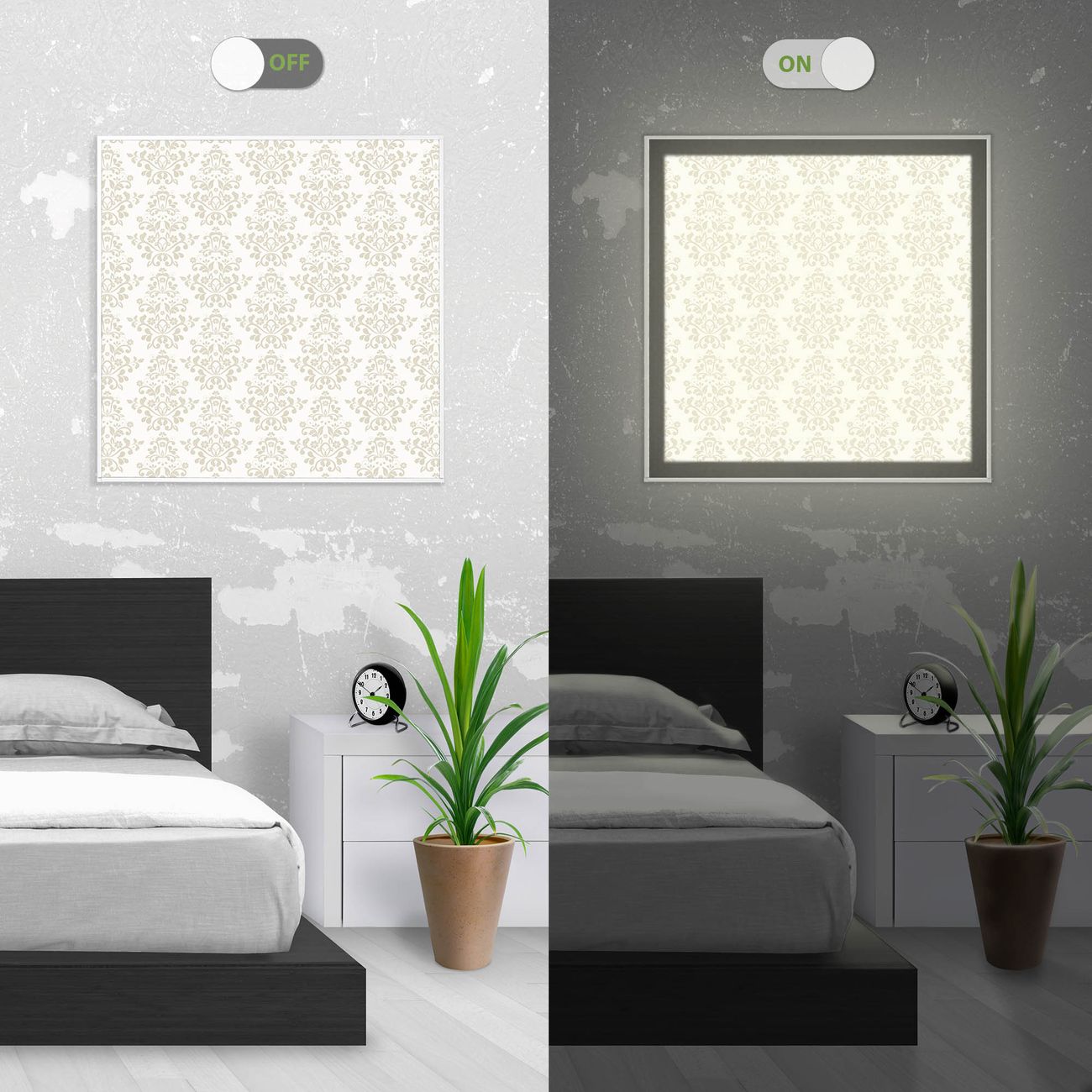 Im eingeschalteten Zustand wirft das Bild einen Schatten wie in der ersten Ansicht zu sehen.