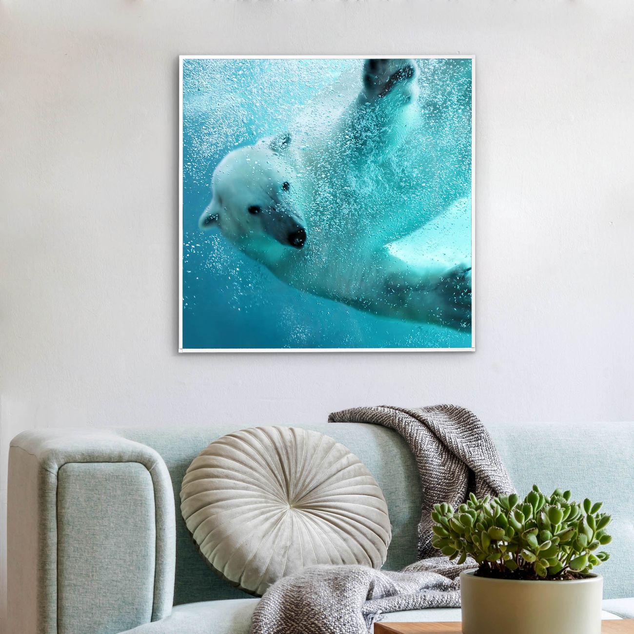 banjado LED Wandleuchte Sie erhalten hier eine stimmungsvolle Lichtquelle bestehend aus dem Set: Smart LED Panel mit Trafo, Motivscheibe (Motiv: Tauchender Eisbär) und Rahmen. Der Aufbau ist denkbar einfach, Sie erhalten eine detaillierte Aufbauanleitung. Die komplette Leuchte kann sowohl an der Wand angeschlossen werden als auch als Deckenleuchte. Die Gesamtgröße der Lampe ist 62,5 x 62,5 x 4,5cm (HxBxT). Das Set besteht aus: LED Panel mit Trafo, Rahmen und Motivbild zum Selbstaufbau.