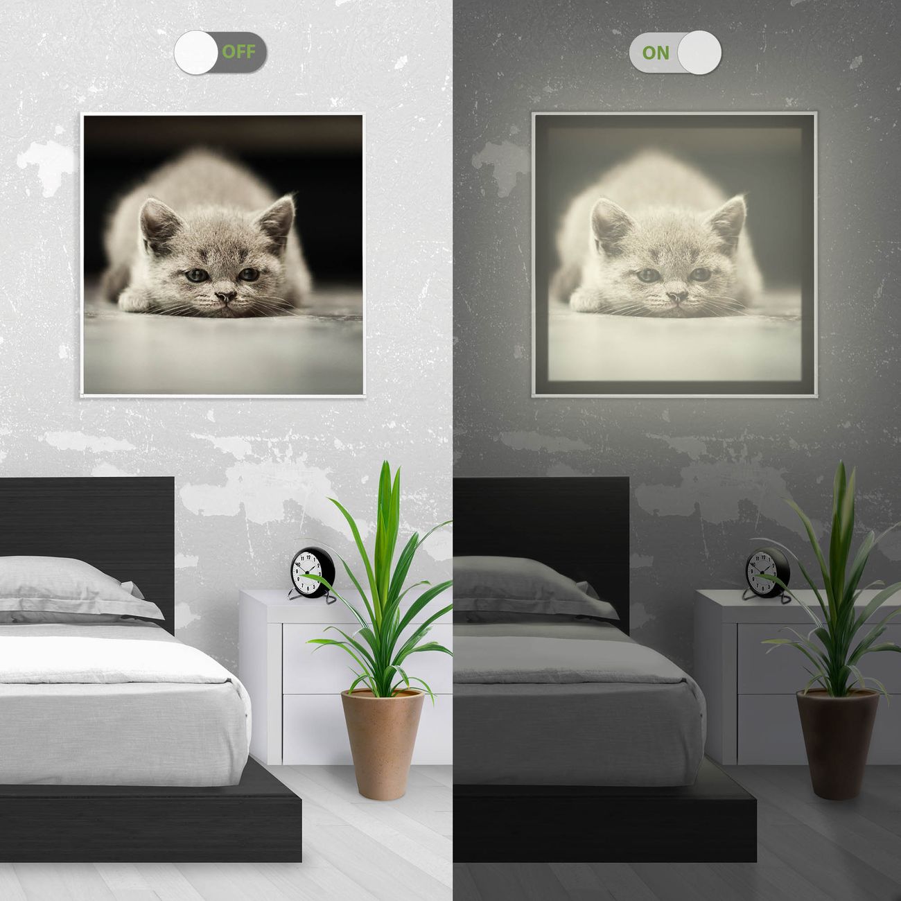 Im eingeschalteten Zustand wirft das Bild einen Schatten wie in der ersten Ansicht zu sehen.