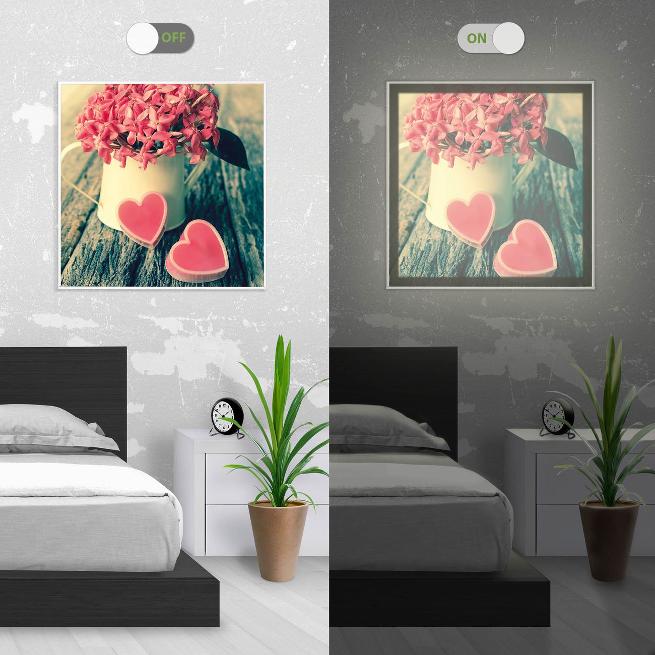 Im eingeschalteten Zustand wirft das Bild einen Schatten wie in der ersten Ansicht zu sehen.