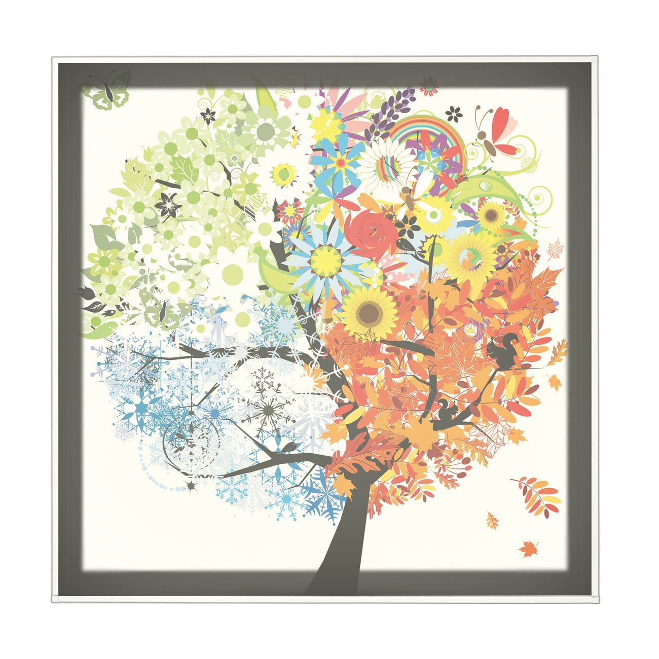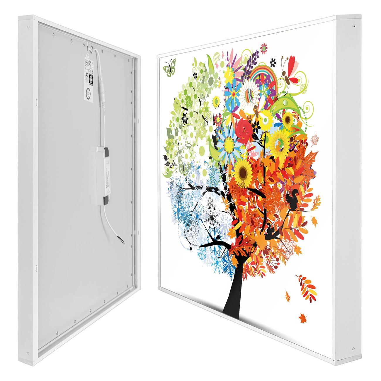 banjado LED Wandleuchte Sie erhalten hier eine stimmungsvolle Lichtquelle bestehend aus dem Set: Smart LED Panel mit Trafo, Motivscheibe (Motiv: Vier Jahreszeiten) und Rahmen. Der Aufbau ist denkbar einfach, Sie erhalten eine detaillierte Aufbauanleitung. Die komplette Leuchte kann sowohl an der Wand angeschlossen werden als auch als Deckenleuchte. Die Gesamtgröße der Lampe ist 62,5 x 62,5 x 4,5cm (HxBxT). Das Set besteht aus: LED Panel mit Trafo, Rahmen und Motivbild zum Selbstaufbau.