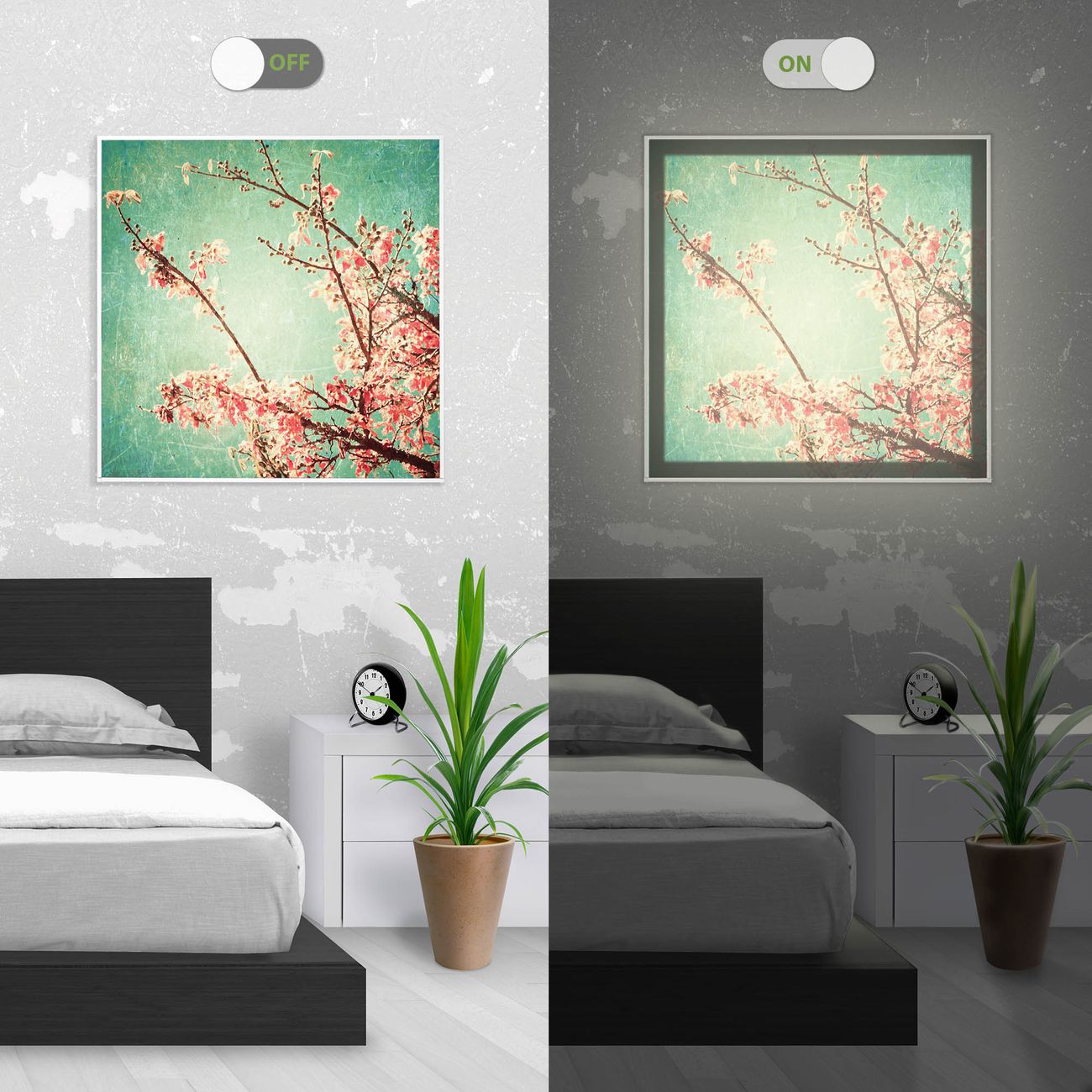 Im eingeschalteten Zustand wirft das Bild einen Schatten wie in der ersten Ansicht zu sehen.