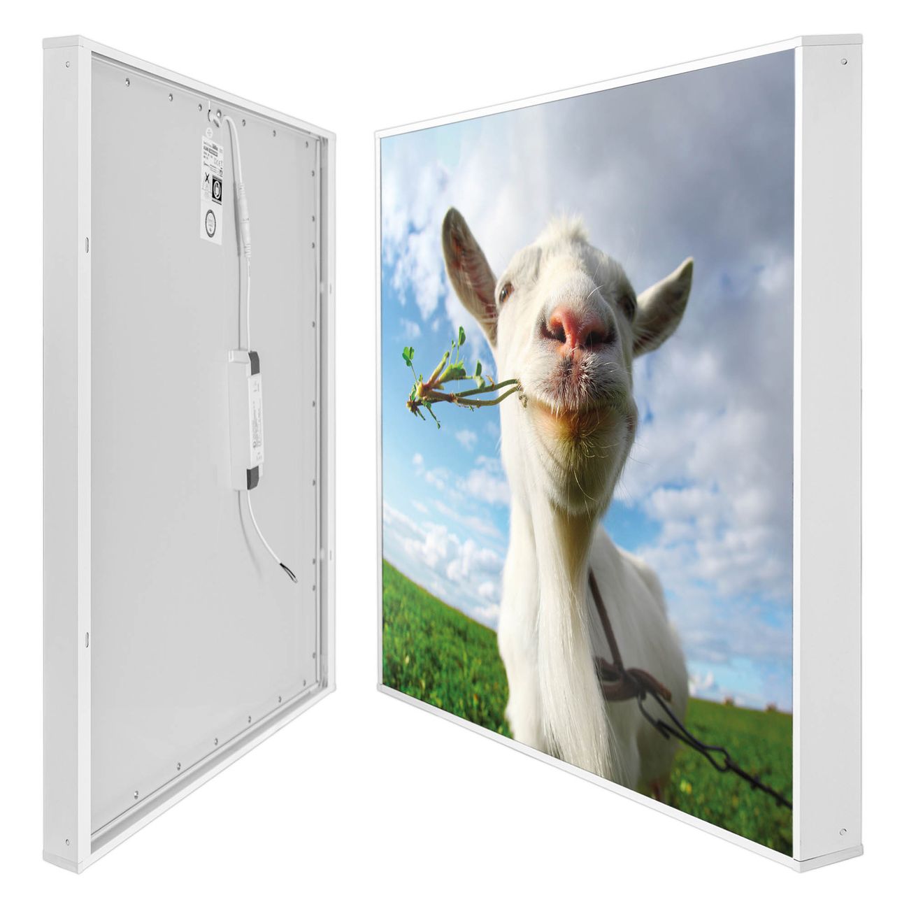 banjado LED Wandleuchte Sie erhalten hier eine stimmungsvolle Lichtquelle bestehend aus dem Set: Smart LED Panel mit Trafo, Motivscheibe (Motiv: Ziege 2) und Rahmen. Der Aufbau ist denkbar einfach, Sie erhalten eine detaillierte Aufbauanleitung. Die komplette Leuchte kann sowohl an der Wand angeschlossen werden als auch als Deckenleuchte. Die Gesamtgröße der Lampe ist 62,5 x 62,5 x 4,5cm (HxBxT). Das Set besteht aus: LED Panel mit Trafo, Rahmen und Motivbild zum Selbstaufbau.