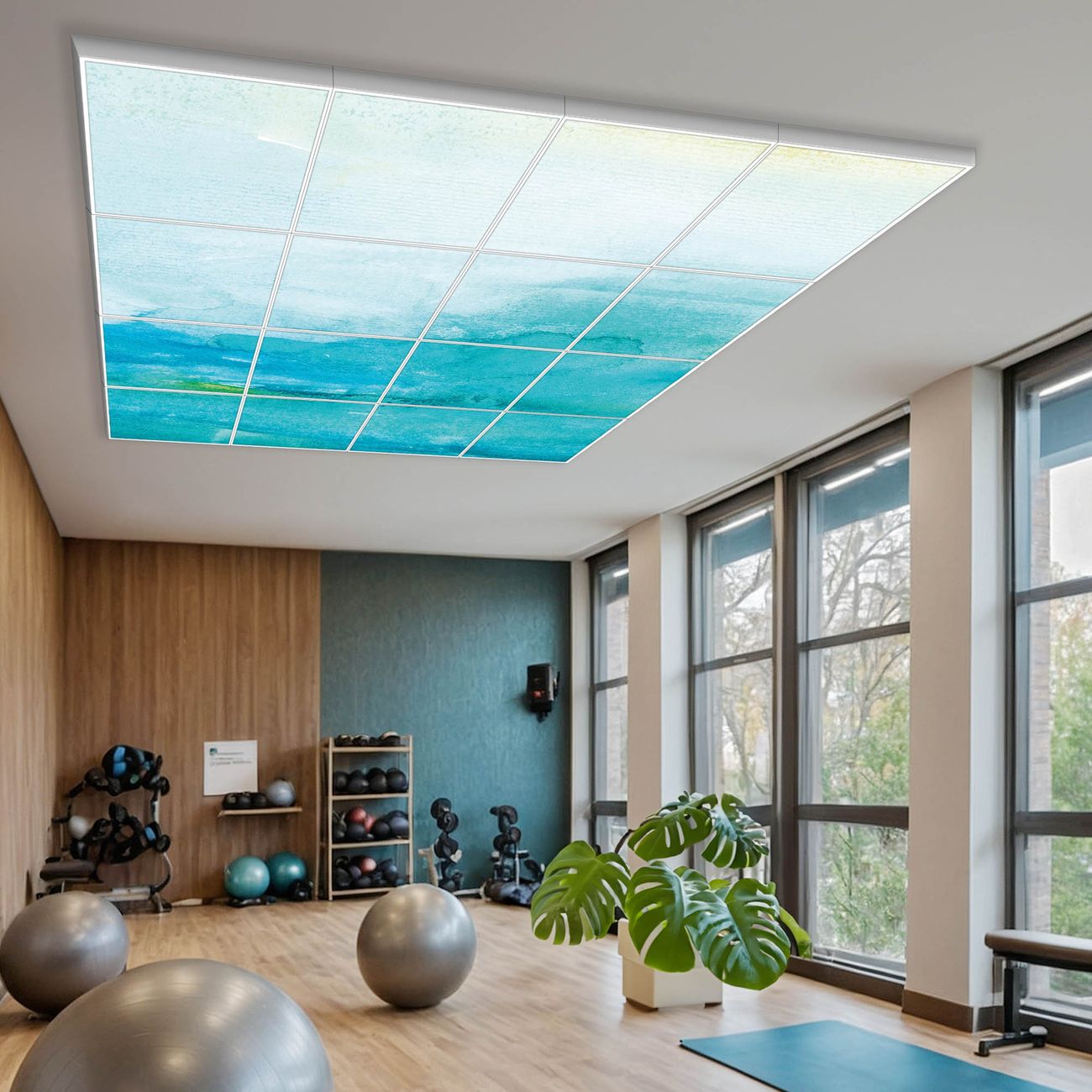 Entdecken Sie unsere vielseitigen Lichtdecken, hier in der Größe 248 x 248cm mit dem Motiv Motiv Aquarell Blau - Ihre Beleuchtungslösung für jede Umgebung Beleuchten Sie Ihren Raum nicht nur, sondern schaffen Sie Atmosphäre! Die banjado Lichtdecke verwandelt jeden Ort, ob zu Hause, in Praxen, Büros oder Studios in eine Wohlfühloase. Unsere einzelnen Elemente haben eine genormte Einheitsgröße von 62 x 62cm und können somit in jede gängige Rasterdecken verbaut werden. So finden Sie Ihre passende Ausführung: Gern helfen wir Ihnen, die passende Ausführung zu wählen. Hierfür muss die aktuelle Gegebenheit Ihrer Decke oder Wand beachtet werden. Haben Sie bereits eine Rasterdecke (auch Odenwalddecke genannt)? Hier bestellen Sie lediglich das Motiv + Beleuchtungspanel, denn beides wird in die bereits vorhandene Decke eingelegt. Haben Sie eine glatte Decke mit Lichtauslass oder möchten die Lichtdecke an der Wand befestigen? Hier bestellen Sie bitte Motiv + Beleuchtungspanel + Deckenbefestigung, eine Aufbauanleitung liegt immer bei. Die Lichtdecke kann sowohl an der Decke als auch an der Wand montiert werden, perfekt für kreative Lichtakzente oder alternative Beleuchtungslösungen. Haben Sie bereits eine Lichtdecke und möchten nur das Motiv wechseln? Hier bestellen Sie bitte nur Motiv, der Wechsel ist denkbar einfach. Der Aufbau Ihrer banjado Lichtdecke gestaltet sich unkompliziert, dank einer verständlichen Anleitung, die Ihnen Schritt für Schritt durch den Montageprozess hilft. Für die endgültige Installation und den sicheren Anschluss empfehlen wir die Hinzuziehung eines Fachmanns, um die optimale Funktion und Sicherheit Ihrer Beleuchtung zu gewährleisten. Falls Sie einen Fachmann für die Installation benötigen, geben Sie uns gern Bescheid, wir vermitteln Ihnen gern einen geeigneten Ansprechpartner aus Ihrer Nähe. Steuerung: Steigern Sie Ihr Beleuchtungserlebnis mit der nahtlosen Integration in Ihr Smart Home. Durch die Kompatibilität mit der SmartLife App, Alexa und Google Assistant wird Ihr Smartphone zur zentralen Steuerungseinheit. Ihr Handy fungiert hierbei sozusagen als Fernbedienung. Legen Sie individuelle Lichtszenen in der App fest, die bei Aktivierung über den Wand-Ein-/Ausschalter immer wieder abgerufen werden können ohne Handy. Mit der Szenenfunktion in der Smart App können Sie die Beleuchtung personalisieren und steuern, sodass sie auf Ihre individuellen Bedürfnisse, Tagesrhythmus und Stimmung zugeschnitten ist. Beispielsweise können Sie sich in der Morgendämmerung durch ein sanftes Licht wecken lassen oder das Licht der Praxis werktags um 7 Uhr automatisch einschalten lassen. Dieses kann dann natürlich auch zu einer bestimmten Zeit automatisch ausgeschaltet werden. Motivwahl: Diese einzigartige Lichtdecke zeichnet sich durch ihre Fähigkeit aus, die Lichtfarbe je nach gewähltem Motiv anzupassen - ein Baum wirft ein sanftes grünes Licht, während eine Wolkendecke Ihren Raum in ein beruhigendes blaues Leuchten hüllt. Berücksichtigen Sie dies bitte bei Ihrer Motivauswahl. Sie können das Motiv jederzeit ohne großen Aufwand austauschen, ob nach Jahreszeit oder anderem Anlass, unsere Auswahl lässt kaum Wünsche offen. Wir fertigen Ihnen gern eine personalisierte Lichtdecke mit einem eigenen Motiv oder Logo oder Foto, schreiben Sie uns jederzeit an. Technische Daten: Das Motiv ist auf einer 4mm starken Acrylglas Scheibe aufgebracht, das Gesamtgewicht Ihrer Ausführung beträgt 78,9kg. Die Farbtemperatur lässt sich frei einstellen von 3000 bis 6000 Kelvin, damit können Sie stufenlos zwischen warmweiß, neutralweiß und kaltweiß wählen. Die Gesamtleistung bei Ihrer gewählten Ausführung beträgt 640W. Der Lichtstrom beträgt 3600 Lumen, die Nennspannung 230 V. Die Lichtdecke ist mit Schutzart IP20 für den Innenbereich konzipiert und sollte nicht im Nassbereich verwendet werden.