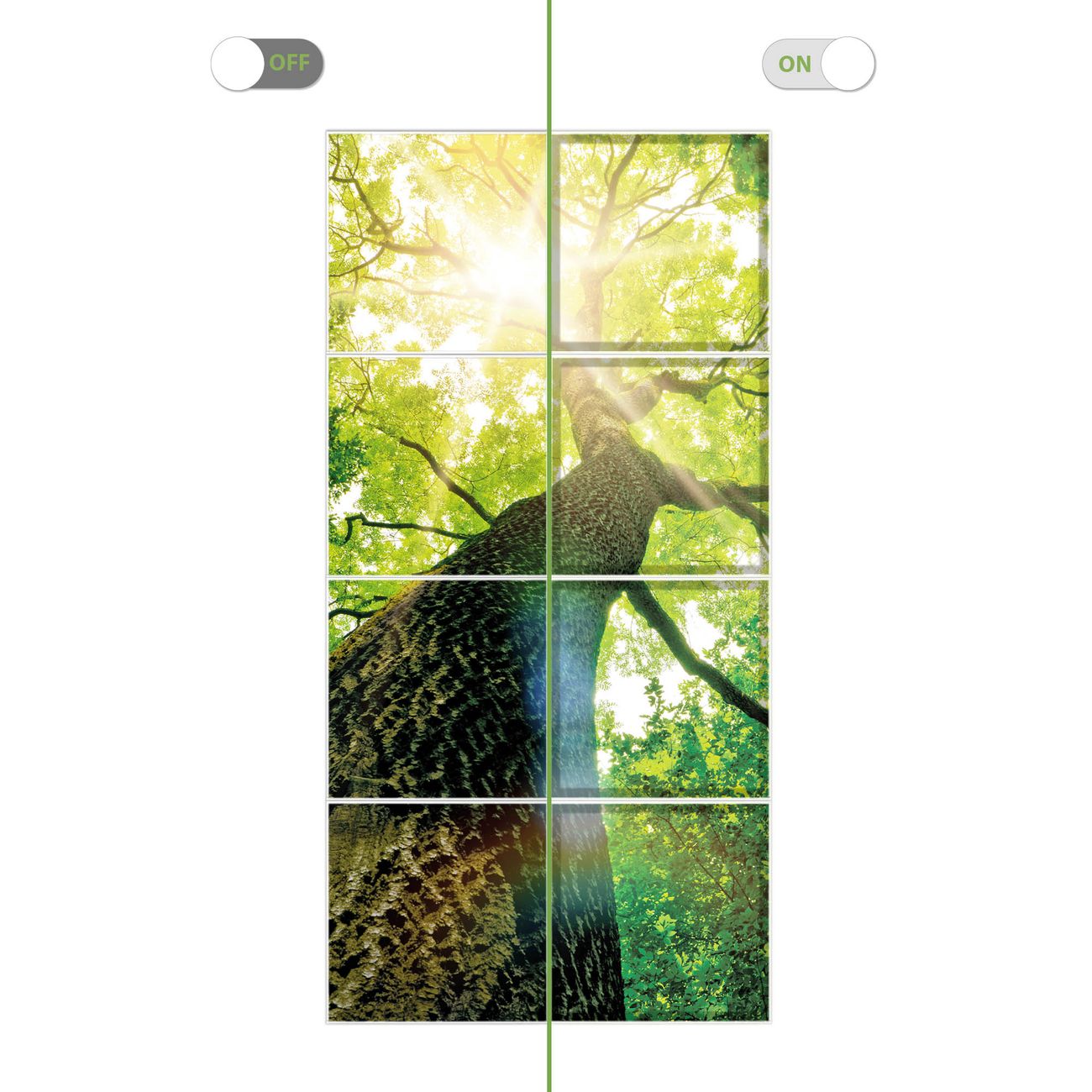 Entdecken Sie unsere vielseitigen Lichtdecken, hier in der Größe 124 x 248cm mit dem Motiv Motiv Baumkrone - Ihre Beleuchtungslösung für jede Umgebung Beleuchten Sie Ihren Raum nicht nur, sondern schaffen Sie Atmosphäre! Die banjado Lichtdecke verwandelt jeden Ort, ob zu Hause, in Praxen, Büros oder Studios in eine Wohlfühloase. Unsere einzelnen Elemente haben eine genormte Einheitsgröße von 62 x 62cm und können somit in jede gängige Rasterdecken verbaut werden. So finden Sie Ihre passende Ausführung: Gern helfen wir Ihnen, die passende Ausführung zu wählen. Hierfür muss die aktuelle Gegebenheit Ihrer Decke oder Wand beachtet werden. Haben Sie bereits eine Rasterdecke (auch Odenwalddecke genannt)? Hier bestellen Sie lediglich das Motiv + Beleuchtungspanel, denn beides wird in die bereits vorhandene Decke eingelegt. Haben Sie eine glatte Decke mit Lichtauslass oder möchten die Lichtdecke an der Wand befestigen? Hier bestellen Sie bitte Motiv + Beleuchtungspanel + Deckenbefestigung, eine Aufbauanleitung liegt immer bei. Die Lichtdecke kann sowohl an der Decke als auch an der Wand montiert werden, perfekt für kreative Lichtakzente oder alternative Beleuchtungslösungen. Haben Sie bereits eine Lichtdecke und möchten nur das Motiv wechseln? Hier bestellen Sie bitte nur Motiv, der Wechsel ist denkbar einfach. Der Aufbau Ihrer banjado Lichtdecke gestaltet sich unkompliziert, dank einer verständlichen Anleitung, die Ihnen Schritt für Schritt durch den Montageprozess hilft. Für die endgültige Installation und den sicheren Anschluss empfehlen wir die Hinzuziehung eines Fachmanns, um die optimale Funktion und Sicherheit Ihrer Beleuchtung zu gewährleisten. Falls Sie einen Fachmann für die Installation benötigen, geben Sie uns gern Bescheid, wir vermitteln Ihnen gern einen geeigneten Ansprechpartner aus Ihrer Nähe. Steuerung: Steigern Sie Ihr Beleuchtungserlebnis mit der nahtlosen Integration in Ihr Smart Home. Durch die Kompatibilität mit der SmartLife App, Alexa und Google Assistant wird Ihr Smartphone zur zentralen Steuerungseinheit. Ihr Handy fungiert hierbei sozusagen als Fernbedienung. Legen Sie individuelle Lichtszenen in der App fest, die bei Aktivierung über den Wand-Ein-/Ausschalter immer wieder abgerufen werden können ohne Handy. Mit der Szenenfunktion in der Smart App können Sie die Beleuchtung personalisieren und steuern, sodass sie auf Ihre individuellen Bedürfnisse, Tagesrhythmus und Stimmung zugeschnitten ist. Beispielsweise können Sie sich in der Morgendämmerung durch ein sanftes Licht wecken lassen oder das Licht der Praxis werktags um 7 Uhr automatisch einschalten lassen. Dieses kann dann natürlich auch zu einer bestimmten Zeit automatisch ausgeschaltet werden. Motivwahl: Diese einzigartige Lichtdecke zeichnet sich durch ihre Fähigkeit aus, die Lichtfarbe je nach gewähltem Motiv anzupassen - ein Baum wirft ein sanftes grünes Licht, während eine Wolkendecke Ihren Raum in ein beruhigendes blaues Leuchten hüllt. Berücksichtigen Sie dies bitte bei Ihrer Motivauswahl. Sie können das Motiv jederzeit ohne großen Aufwand austauschen, ob nach Jahreszeit oder anderem Anlass, unsere Auswahl lässt kaum Wünsche offen. Wir fertigen Ihnen gern eine personalisierte Lichtdecke mit einem eigenen Motiv oder Logo oder Foto, schreiben Sie uns jederzeit an. Technische Daten: Das Motiv ist auf einer 4mm starken Acrylglas Scheibe aufgebracht, das Gesamtgewicht Ihrer Ausführung beträgt 35,4kg. Die Farbtemperatur lässt sich frei einstellen von 3000 bis 6000 Kelvin, damit können Sie stufenlos zwischen warmweiß, neutralweiß und kaltweiß wählen. Die Gesamtleistung bei Ihrer gewählten Ausführung beträgt 320W. Der Lichtstrom beträgt 3600 Lumen, die Nennspannung 230 V. Die Lichtdecke ist mit Schutzart IP20 für den Innenbereich konzipiert und sollte nicht im Nassbereich verwendet werden.