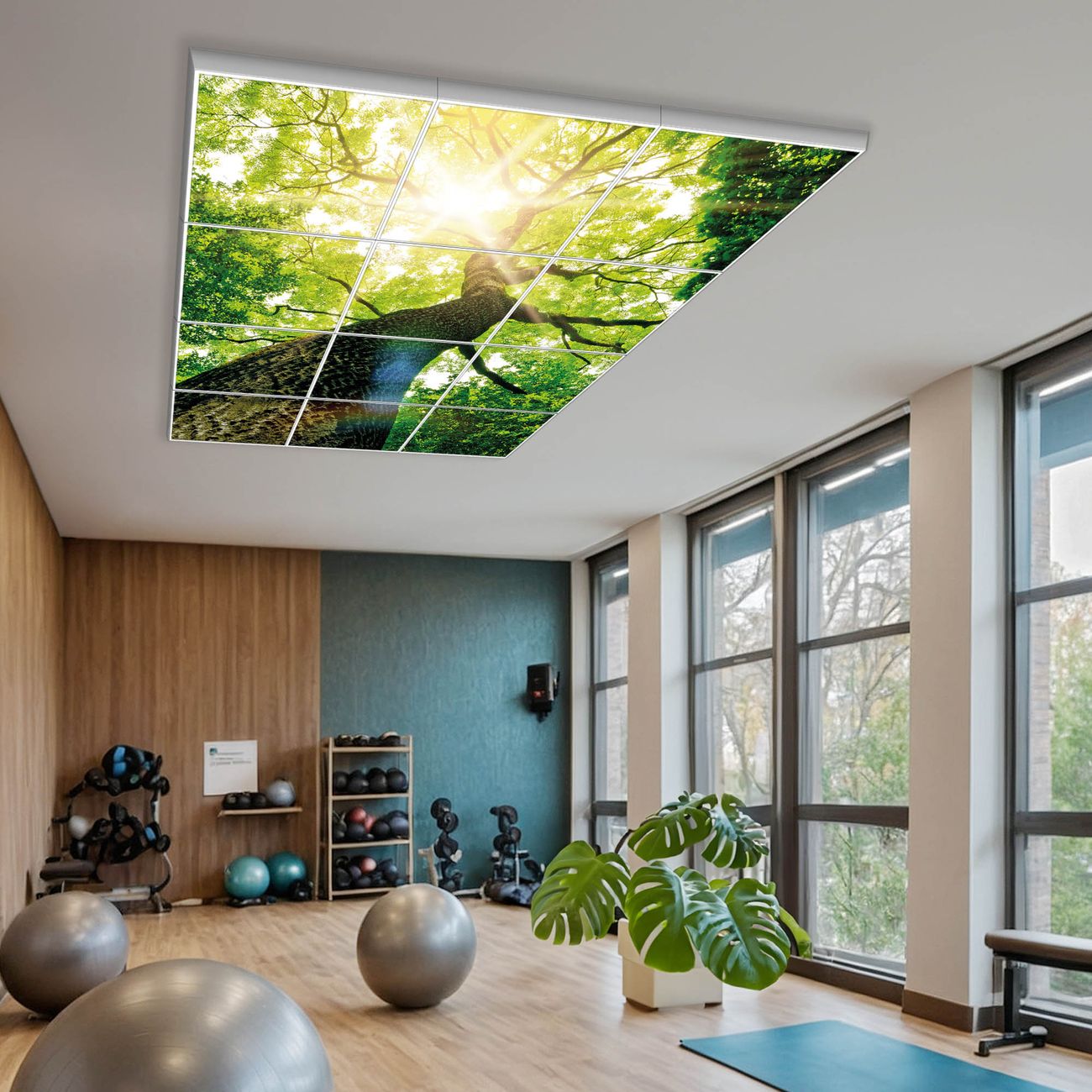 Entdecken Sie unsere vielseitigen Lichtdecken, hier in der Größe 186 x 248cm mit dem Motiv Motiv Baumkrone - Ihre Beleuchtungslösung für jede Umgebung Beleuchten Sie Ihren Raum nicht nur, sondern schaffen Sie Atmosphäre! Die banjado Lichtdecke verwandelt jeden Ort, ob zu Hause, in Praxen, Büros oder Studios in eine Wohlfühloase. Unsere einzelnen Elemente haben eine genormte Einheitsgröße von 62 x 62cm und können somit in jede gängige Rasterdecken verbaut werden. So finden Sie Ihre passende Ausführung: Gern helfen wir Ihnen, die passende Ausführung zu wählen. Hierfür muss die aktuelle Gegebenheit Ihrer Decke oder Wand beachtet werden. Haben Sie bereits eine Rasterdecke (auch Odenwalddecke genannt)? Hier bestellen Sie lediglich das Motiv + Beleuchtungspanel, denn beides wird in die bereits vorhandene Decke eingelegt. Haben Sie eine glatte Decke mit Lichtauslass oder möchten die Lichtdecke an der Wand befestigen? Hier bestellen Sie bitte Motiv + Beleuchtungspanel + Deckenbefestigung, eine Aufbauanleitung liegt immer bei. Die Lichtdecke kann sowohl an der Decke als auch an der Wand montiert werden, perfekt für kreative Lichtakzente oder alternative Beleuchtungslösungen. Haben Sie bereits eine Lichtdecke und möchten nur das Motiv wechseln? Hier bestellen Sie bitte nur Motiv, der Wechsel ist denkbar einfach. Der Aufbau Ihrer banjado Lichtdecke gestaltet sich unkompliziert, dank einer verständlichen Anleitung, die Ihnen Schritt für Schritt durch den Montageprozess hilft. Für die endgültige Installation und den sicheren Anschluss empfehlen wir die Hinzuziehung eines Fachmanns, um die optimale Funktion und Sicherheit Ihrer Beleuchtung zu gewährleisten. Falls Sie einen Fachmann für die Installation benötigen, geben Sie uns gern Bescheid, wir vermitteln Ihnen gern einen geeigneten Ansprechpartner aus Ihrer Nähe. Steuerung: Steigern Sie Ihr Beleuchtungserlebnis mit der nahtlosen Integration in Ihr Smart Home. Durch die Kompatibilität mit der SmartLife App, Alexa und Google Assistant wird Ihr Smartphone zur zentralen Steuerungseinheit. Ihr Handy fungiert hierbei sozusagen als Fernbedienung. Legen Sie individuelle Lichtszenen in der App fest, die bei Aktivierung über den Wand-Ein-/Ausschalter immer wieder abgerufen werden können ohne Handy. Mit der Szenenfunktion in der Smart App können Sie die Beleuchtung personalisieren und steuern, sodass sie auf Ihre individuellen Bedürfnisse, Tagesrhythmus und Stimmung zugeschnitten ist. Beispielsweise können Sie sich in der Morgendämmerung durch ein sanftes Licht wecken lassen oder das Licht der Praxis werktags um 7 Uhr automatisch einschalten lassen. Dieses kann dann natürlich auch zu einer bestimmten Zeit automatisch ausgeschaltet werden. Motivwahl: Diese einzigartige Lichtdecke zeichnet sich durch ihre Fähigkeit aus, die Lichtfarbe je nach gewähltem Motiv anzupassen - ein Baum wirft ein sanftes grünes Licht, während eine Wolkendecke Ihren Raum in ein beruhigendes blaues Leuchten hüllt. Berücksichtigen Sie dies bitte bei Ihrer Motivauswahl. Sie können das Motiv jederzeit ohne großen Aufwand austauschen, ob nach Jahreszeit oder anderem Anlass, unsere Auswahl lässt kaum Wünsche offen. Wir fertigen Ihnen gern eine personalisierte Lichtdecke mit einem eigenen Motiv oder Logo oder Foto, schreiben Sie uns jederzeit an. Technische Daten: Das Motiv ist auf einer 4mm starken Acrylglas Scheibe aufgebracht, das Gesamtgewicht Ihrer Ausführung beträgt 59,1kg. Die Farbtemperatur lässt sich frei einstellen von 3000 bis 6000 Kelvin, damit können Sie stufenlos zwischen warmweiß, neutralweiß und kaltweiß wählen. Die Gesamtleistung bei Ihrer gewählten Ausführung beträgt 480W. Der Lichtstrom beträgt 3600 Lumen, die Nennspannung 230 V. Die Lichtdecke ist mit Schutzart IP20 für den Innenbereich konzipiert und sollte nicht im Nassbereich verwendet werden.