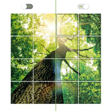 Entdecken Sie unsere vielseitigen Lichtdecken, hier in der Größe 248 x 248cm mit dem Motiv Motiv Baumkrone - Ihre Beleuchtungslösung für jede Umgebung Beleuchten Sie Ihren Raum nicht nur, sondern schaffen Sie Atmosphäre! Die banjado Lichtdecke verwandelt jeden Ort, ob zu Hause, in Praxen, Büros oder Studios in eine Wohlfühloase. Unsere einzelnen Elemente haben eine genormte Einheitsgröße von 62 x 62cm und können somit in jede gängige Rasterdecken verbaut werden. So finden Sie Ihre passende Ausführung: Gern helfen wir Ihnen, die passende Ausführung zu wählen. Hierfür muss die aktuelle Gegebenheit Ihrer Decke oder Wand beachtet werden. Haben Sie bereits eine Rasterdecke (auch Odenwalddecke genannt)? Hier bestellen Sie lediglich das Motiv + Beleuchtungspanel, denn beides wird in die bereits vorhandene Decke eingelegt. Haben Sie eine glatte Decke mit Lichtauslass oder möchten die Lichtdecke an der Wand befestigen? Hier bestellen Sie bitte Motiv + Beleuchtungspanel + Deckenbefestigung, eine Aufbauanleitung liegt immer bei. Die Lichtdecke kann sowohl an der Decke als auch an der Wand montiert werden, perfekt für kreative Lichtakzente oder alternative Beleuchtungslösungen. Haben Sie bereits eine Lichtdecke und möchten nur das Motiv wechseln? Hier bestellen Sie bitte nur Motiv, der Wechsel ist denkbar einfach. Der Aufbau Ihrer banjado Lichtdecke gestaltet sich unkompliziert, dank einer verständlichen Anleitung, die Ihnen Schritt für Schritt durch den Montageprozess hilft. Für die endgültige Installation und den sicheren Anschluss empfehlen wir die Hinzuziehung eines Fachmanns, um die optimale Funktion und Sicherheit Ihrer Beleuchtung zu gewährleisten. Falls Sie einen Fachmann für die Installation benötigen, geben Sie uns gern Bescheid, wir vermitteln Ihnen gern einen geeigneten Ansprechpartner aus Ihrer Nähe. Steuerung: Steigern Sie Ihr Beleuchtungserlebnis mit der nahtlosen Integration in Ihr Smart Home. Durch die Kompatibilität mit der SmartLife App, Alexa und Google Assistant wird Ihr Smartphone zur zentralen Steuerungseinheit. Ihr Handy fungiert hierbei sozusagen als Fernbedienung. Legen Sie individuelle Lichtszenen in der App fest, die bei Aktivierung über den Wand-Ein-/Ausschalter immer wieder abgerufen werden können ohne Handy. Mit der Szenenfunktion in der Smart App können Sie die Beleuchtung personalisieren und steuern, sodass sie auf Ihre individuellen Bedürfnisse, Tagesrhythmus und Stimmung zugeschnitten ist. Beispielsweise können Sie sich in der Morgendämmerung durch ein sanftes Licht wecken lassen oder das Licht der Praxis werktags um 7 Uhr automatisch einschalten lassen. Dieses kann dann natürlich auch zu einer bestimmten Zeit automatisch ausgeschaltet werden. Motivwahl: Diese einzigartige Lichtdecke zeichnet sich durch ihre Fähigkeit aus, die Lichtfarbe je nach gewähltem Motiv anzupassen - ein Baum wirft ein sanftes grünes Licht, während eine Wolkendecke Ihren Raum in ein beruhigendes blaues Leuchten hüllt. Berücksichtigen Sie dies bitte bei Ihrer Motivauswahl. Sie können das Motiv jederzeit ohne großen Aufwand austauschen, ob nach Jahreszeit oder anderem Anlass, unsere Auswahl lässt kaum Wünsche offen. Wir fertigen Ihnen gern eine personalisierte Lichtdecke mit einem eigenen Motiv oder Logo oder Foto, schreiben Sie uns jederzeit an. Technische Daten: Das Motiv ist auf einer 4mm starken Acrylglas Scheibe aufgebracht, das Gesamtgewicht Ihrer Ausführung beträgt 70,9kg. Die Farbtemperatur lässt sich frei einstellen von 3000 bis 6000 Kelvin, damit können Sie stufenlos zwischen warmweiß, neutralweiß und kaltweiß wählen. Die Gesamtleistung bei Ihrer gewählten Ausführung beträgt 640W. Der Lichtstrom beträgt 3600 Lumen, die Nennspannung 230 V. Die Lichtdecke ist mit Schutzart IP20 für den Innenbereich konzipiert und sollte nicht im Nassbereich verwendet werden.