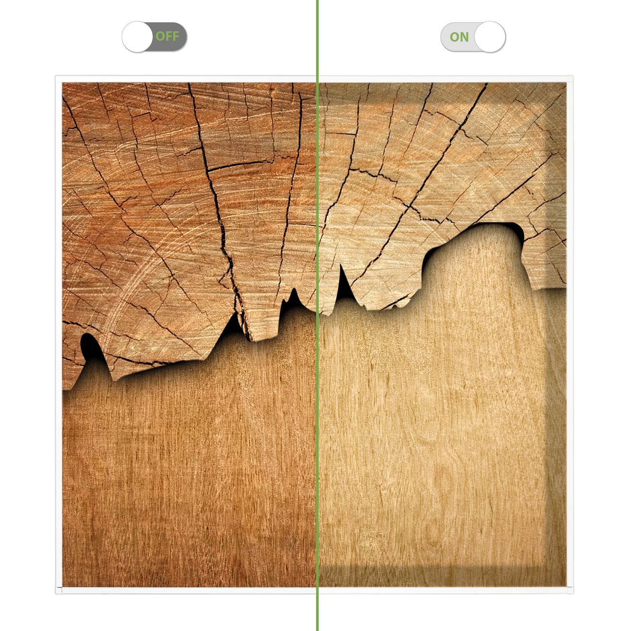 Motiv Baumscheibe Nr. 12148 Größe: 62,5x62,5x4,5cm BxHxT Gewicht: ca. 4,85 kg Material: Acylglas, Metall, hochwertig bedruckte Premiumfolie Druck: farbbrilliant, hochauflösend Stärke Glas: 4mm Acylglas Einzelelement: 62,5x62,5cm groß (mit Rahmen) Dimmbar: JA LED Paneel: 40W, 230V, 3600lm, 4000K neutralweiß Steuerung: SmartApp / Alexa / Google Assistent oder ähnliche