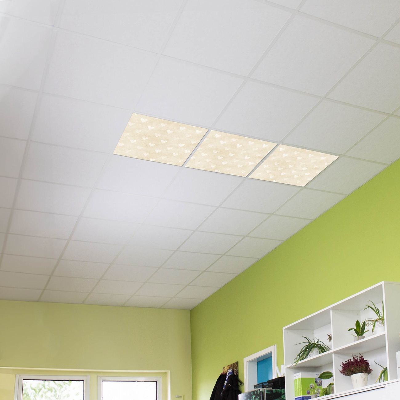 Entdecken Sie unsere vielseitigen Lichtdecken, hier in der Größe 186 x 62cm mit dem Motiv Motiv Beige Herzen - Ihre Beleuchtungslösung für jede Umgebung Beleuchten Sie Ihren Raum nicht nur, sondern schaffen Sie Atmosphäre! Die banjado Lichtdecke verwandelt jeden Ort, ob zu Hause, in Praxen, Büros oder Studios in eine Wohlfühloase. Unsere einzelnen Elemente haben eine genormte Einheitsgröße von 62 x 62cm und können somit in jede gängige Rasterdecken verbaut werden. So finden Sie Ihre passende Ausführung: Gern helfen wir Ihnen, die passende Ausführung zu wählen. Hierfür muss die aktuelle Gegebenheit Ihrer Decke oder Wand beachtet werden. Haben Sie bereits eine Rasterdecke (auch Odenwalddecke genannt)? Hier bestellen Sie lediglich das Motiv + Beleuchtungspanel, denn beides wird in die bereits vorhandene Decke eingelegt. Haben Sie eine glatte Decke mit Lichtauslass oder möchten die Lichtdecke an der Wand befestigen? Hier bestellen Sie bitte Motiv + Beleuchtungspanel + Deckenbefestigung, eine Aufbauanleitung liegt immer bei. Die Lichtdecke kann sowohl an der Decke als auch an der Wand montiert werden, perfekt für kreative Lichtakzente oder alternative Beleuchtungslösungen. Haben Sie bereits eine Lichtdecke und möchten nur das Motiv wechseln? Hier bestellen Sie bitte nur Motiv, der Wechsel ist denkbar einfach. Der Aufbau Ihrer banjado Lichtdecke gestaltet sich unkompliziert, dank einer verständlichen Anleitung, die Ihnen Schritt für Schritt durch den Montageprozess hilft. Für die endgültige Installation und den sicheren Anschluss empfehlen wir die Hinzuziehung eines Fachmanns, um die optimale Funktion und Sicherheit Ihrer Beleuchtung zu gewährleisten. Falls Sie einen Fachmann für die Installation benötigen, geben Sie uns gern Bescheid, wir vermitteln Ihnen gern einen geeigneten Ansprechpartner aus Ihrer Nähe. Steuerung: Steigern Sie Ihr Beleuchtungserlebnis mit der nahtlosen Integration in Ihr Smart Home. Durch die Kompatibilität mit der SmartLife App, Alexa und Google Assistant wird Ihr Smartphone zur zentralen Steuerungseinheit. Ihr Handy fungiert hierbei sozusagen als Fernbedienung. Legen Sie individuelle Lichtszenen in der App fest, die bei Aktivierung über den Wand-Ein-/Ausschalter immer wieder abgerufen werden können ohne Handy. Mit der Szenenfunktion in der Smart App können Sie die Beleuchtung personalisieren und steuern, sodass sie auf Ihre individuellen Bedürfnisse, Tagesrhythmus und Stimmung zugeschnitten ist. Beispielsweise können Sie sich in der Morgendämmerung durch ein sanftes Licht wecken lassen oder das Licht der Praxis werktags um 7 Uhr automatisch einschalten lassen. Dieses kann dann natürlich auch zu einer bestimmten Zeit automatisch ausgeschaltet werden. Motivwahl: Diese einzigartige Lichtdecke zeichnet sich durch ihre Fähigkeit aus, die Lichtfarbe je nach gewähltem Motiv anzupassen - ein Baum wirft ein sanftes grünes Licht, während eine Wolkendecke Ihren Raum in ein beruhigendes blaues Leuchten hüllt. Berücksichtigen Sie dies bitte bei Ihrer Motivauswahl. Sie können das Motiv jederzeit ohne großen Aufwand austauschen, ob nach Jahreszeit oder anderem Anlass, unsere Auswahl lässt kaum Wünsche offen. Wir fertigen Ihnen gern eine personalisierte Lichtdecke mit einem eigenen Motiv oder Logo oder Foto, schreiben Sie uns jederzeit an. Technische Daten: Das Motiv ist auf einer 4mm starken Acrylglas Scheibe aufgebracht, das Gesamtgewicht Ihrer Ausführung beträgt 13,3kg. Die Farbtemperatur lässt sich frei einstellen von 3000 bis 6000 Kelvin, damit können Sie stufenlos zwischen warmweiß, neutralweiß und kaltweiß wählen. Die Gesamtleistung bei Ihrer gewählten Ausführung beträgt 120W. Der Lichtstrom beträgt 3600 Lumen, die Nennspannung 230 V. Die Lichtdecke ist mit Schutzart IP20 für den Innenbereich konzipiert und sollte nicht im Nassbereich verwendet werden.