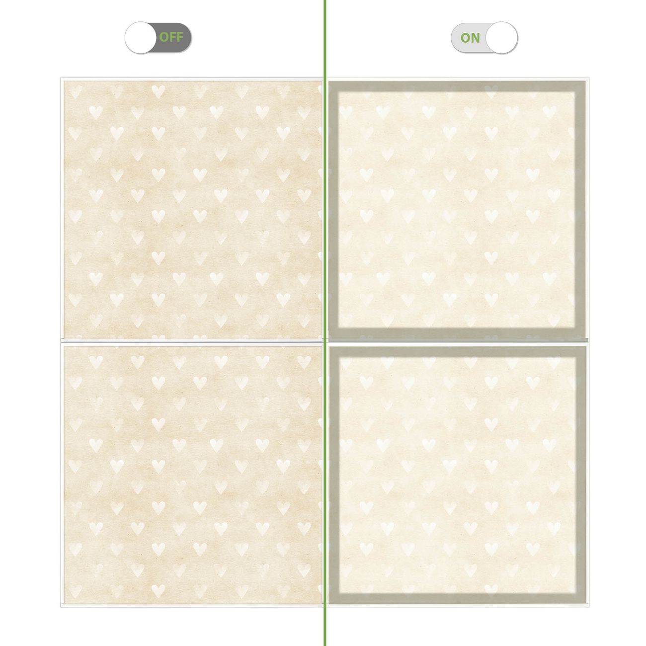 Entdecken Sie unsere vielseitigen Lichtdecken, hier in der Größe 124 x 124cm mit dem Motiv Motiv Beige Herzen - Ihre Beleuchtungslösung für jede Umgebung Beleuchten Sie Ihren Raum nicht nur, sondern schaffen Sie Atmosphäre! Die banjado Lichtdecke verwandelt jeden Ort, ob zu Hause, in Praxen, Büros oder Studios in eine Wohlfühloase. Unsere einzelnen Elemente haben eine genormte Einheitsgröße von 62 x 62cm und können somit in jede gängige Rasterdecken verbaut werden. So finden Sie Ihre passende Ausführung: Gern helfen wir Ihnen, die passende Ausführung zu wählen. Hierfür muss die aktuelle Gegebenheit Ihrer Decke oder Wand beachtet werden. Haben Sie bereits eine Rasterdecke (auch Odenwalddecke genannt)? Hier bestellen Sie lediglich das Motiv + Beleuchtungspanel, denn beides wird in die bereits vorhandene Decke eingelegt. Haben Sie eine glatte Decke mit Lichtauslass oder möchten die Lichtdecke an der Wand befestigen? Hier bestellen Sie bitte Motiv + Beleuchtungspanel + Deckenbefestigung, eine Aufbauanleitung liegt immer bei. Die Lichtdecke kann sowohl an der Decke als auch an der Wand montiert werden, perfekt für kreative Lichtakzente oder alternative Beleuchtungslösungen. Haben Sie bereits eine Lichtdecke und möchten nur das Motiv wechseln? Hier bestellen Sie bitte nur Motiv, der Wechsel ist denkbar einfach. Der Aufbau Ihrer banjado Lichtdecke gestaltet sich unkompliziert, dank einer verständlichen Anleitung, die Ihnen Schritt für Schritt durch den Montageprozess hilft. Für die endgültige Installation und den sicheren Anschluss empfehlen wir die Hinzuziehung eines Fachmanns, um die optimale Funktion und Sicherheit Ihrer Beleuchtung zu gewährleisten. Falls Sie einen Fachmann für die Installation benötigen, geben Sie uns gern Bescheid, wir vermitteln Ihnen gern einen geeigneten Ansprechpartner aus Ihrer Nähe. Steuerung: Steigern Sie Ihr Beleuchtungserlebnis mit der nahtlosen Integration in Ihr Smart Home. Durch die Kompatibilität mit der SmartLife App, Alexa und Google Assistant wird Ihr Smartphone zur zentralen Steuerungseinheit. Ihr Handy fungiert hierbei sozusagen als Fernbedienung. Legen Sie individuelle Lichtszenen in der App fest, die bei Aktivierung über den Wand-Ein-/Ausschalter immer wieder abgerufen werden können ohne Handy. Mit der Szenenfunktion in der Smart App können Sie die Beleuchtung personalisieren und steuern, sodass sie auf Ihre individuellen Bedürfnisse, Tagesrhythmus und Stimmung zugeschnitten ist. Beispielsweise können Sie sich in der Morgendämmerung durch ein sanftes Licht wecken lassen oder das Licht der Praxis werktags um 7 Uhr automatisch einschalten lassen. Dieses kann dann natürlich auch zu einer bestimmten Zeit automatisch ausgeschaltet werden. Motivwahl: Diese einzigartige Lichtdecke zeichnet sich durch ihre Fähigkeit aus, die Lichtfarbe je nach gewähltem Motiv anzupassen - ein Baum wirft ein sanftes grünes Licht, während eine Wolkendecke Ihren Raum in ein beruhigendes blaues Leuchten hüllt. Berücksichtigen Sie dies bitte bei Ihrer Motivauswahl. Sie können das Motiv jederzeit ohne großen Aufwand austauschen, ob nach Jahreszeit oder anderem Anlass, unsere Auswahl lässt kaum Wünsche offen. Wir fertigen Ihnen gern eine personalisierte Lichtdecke mit einem eigenen Motiv oder Logo oder Foto, schreiben Sie uns jederzeit an. Technische Daten: Das Motiv ist auf einer 4mm starken Acrylglas Scheibe aufgebracht, das Gesamtgewicht Ihrer Ausführung beträgt 9,0kg. Die Farbtemperatur lässt sich frei einstellen von 3000 bis 6000 Kelvin, damit können Sie stufenlos zwischen warmweiß, neutralweiß und kaltweiß wählen. Die Gesamtleistung bei Ihrer gewählten Ausführung beträgt 160W. Der Lichtstrom beträgt 3600 Lumen, die Nennspannung 230 V. Die Lichtdecke ist mit Schutzart IP20 für den Innenbereich konzipiert und sollte nicht im Nassbereich verwendet werden.