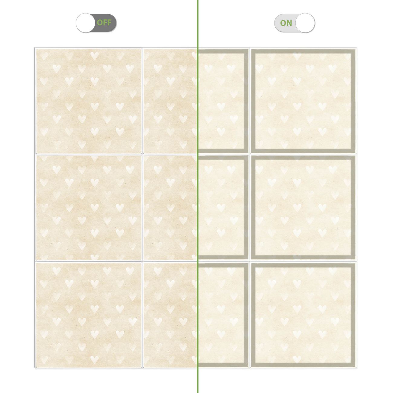 Entdecken Sie unsere vielseitigen Lichtdecken, hier in der Größe 186 x 186cm mit dem Motiv Motiv Beige Herzen - Ihre Beleuchtungslösung für jede Umgebung Beleuchten Sie Ihren Raum nicht nur, sondern schaffen Sie Atmosphäre! Die banjado Lichtdecke verwandelt jeden Ort, ob zu Hause, in Praxen, Büros oder Studios in eine Wohlfühloase. Unsere einzelnen Elemente haben eine genormte Einheitsgröße von 62 x 62cm und können somit in jede gängige Rasterdecken verbaut werden. So finden Sie Ihre passende Ausführung: Gern helfen wir Ihnen, die passende Ausführung zu wählen. Hierfür muss die aktuelle Gegebenheit Ihrer Decke oder Wand beachtet werden. Haben Sie bereits eine Rasterdecke (auch Odenwalddecke genannt)? Hier bestellen Sie lediglich das Motiv + Beleuchtungspanel, denn beides wird in die bereits vorhandene Decke eingelegt. Haben Sie eine glatte Decke mit Lichtauslass oder möchten die Lichtdecke an der Wand befestigen? Hier bestellen Sie bitte Motiv + Beleuchtungspanel + Deckenbefestigung, eine Aufbauanleitung liegt immer bei. Die Lichtdecke kann sowohl an der Decke als auch an der Wand montiert werden, perfekt für kreative Lichtakzente oder alternative Beleuchtungslösungen. Haben Sie bereits eine Lichtdecke und möchten nur das Motiv wechseln? Hier bestellen Sie bitte nur Motiv, der Wechsel ist denkbar einfach. Der Aufbau Ihrer banjado Lichtdecke gestaltet sich unkompliziert, dank einer verständlichen Anleitung, die Ihnen Schritt für Schritt durch den Montageprozess hilft. Für die endgültige Installation und den sicheren Anschluss empfehlen wir die Hinzuziehung eines Fachmanns, um die optimale Funktion und Sicherheit Ihrer Beleuchtung zu gewährleisten. Falls Sie einen Fachmann für die Installation benötigen, geben Sie uns gern Bescheid, wir vermitteln Ihnen gern einen geeigneten Ansprechpartner aus Ihrer Nähe. Steuerung: Steigern Sie Ihr Beleuchtungserlebnis mit der nahtlosen Integration in Ihr Smart Home. Durch die Kompatibilität mit der SmartLife App, Alexa und Google Assistant wird Ihr Smartphone zur zentralen Steuerungseinheit. Ihr Handy fungiert hierbei sozusagen als Fernbedienung. Legen Sie individuelle Lichtszenen in der App fest, die bei Aktivierung über den Wand-Ein-/Ausschalter immer wieder abgerufen werden können ohne Handy. Mit der Szenenfunktion in der Smart App können Sie die Beleuchtung personalisieren und steuern, sodass sie auf Ihre individuellen Bedürfnisse, Tagesrhythmus und Stimmung zugeschnitten ist. Beispielsweise können Sie sich in der Morgendämmerung durch ein sanftes Licht wecken lassen oder das Licht der Praxis werktags um 7 Uhr automatisch einschalten lassen. Dieses kann dann natürlich auch zu einer bestimmten Zeit automatisch ausgeschaltet werden. Motivwahl: Diese einzigartige Lichtdecke zeichnet sich durch ihre Fähigkeit aus, die Lichtfarbe je nach gewähltem Motiv anzupassen - ein Baum wirft ein sanftes grünes Licht, während eine Wolkendecke Ihren Raum in ein beruhigendes blaues Leuchten hüllt. Berücksichtigen Sie dies bitte bei Ihrer Motivauswahl. Sie können das Motiv jederzeit ohne großen Aufwand austauschen, ob nach Jahreszeit oder anderem Anlass, unsere Auswahl lässt kaum Wünsche offen. Wir fertigen Ihnen gern eine personalisierte Lichtdecke mit einem eigenen Motiv oder Logo oder Foto, schreiben Sie uns jederzeit an. Technische Daten: Das Motiv ist auf einer 4mm starken Acrylglas Scheibe aufgebracht, das Gesamtgewicht Ihrer Ausführung beträgt 39,9kg. Die Farbtemperatur lässt sich frei einstellen von 3000 bis 6000 Kelvin, damit können Sie stufenlos zwischen warmweiß, neutralweiß und kaltweiß wählen. Die Gesamtleistung bei Ihrer gewählten Ausführung beträgt 360W. Der Lichtstrom beträgt 3600 Lumen, die Nennspannung 230 V. Die Lichtdecke ist mit Schutzart IP20 für den Innenbereich konzipiert und sollte nicht im Nassbereich verwendet werden.