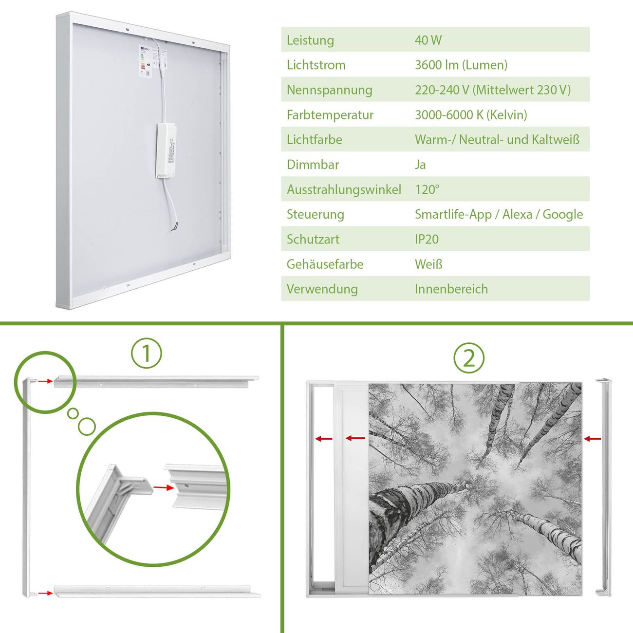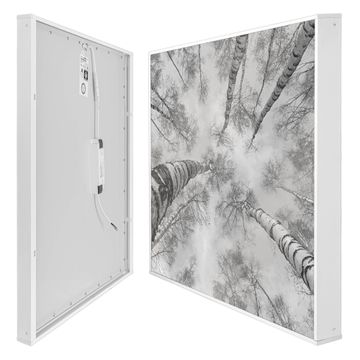 Entdecken Sie unsere vielseitigen Lichtdecken, hier in der Größe 62 x 62cm mit dem Motiv Motiv Birkenwald - Ihre Beleuchtungslösung für jede Umgebung Beleuchten Sie Ihren Raum nicht nur, sondern schaffen Sie Atmosphäre! Die banjado Lichtdecke verwandelt jeden Ort, ob zu Hause, in Praxen, Büros oder Studios in eine Wohlfühloase. Unsere einzelnen Elemente haben eine genormte Einheitsgröße von 62 x 62cm und können somit in jede gängige Rasterdecken verbaut werden. So finden Sie Ihre passende Ausführung: Gern helfen wir Ihnen, die passende Ausführung zu wählen. Hierfür muss die aktuelle Gegebenheit Ihrer Decke oder Wand beachtet werden. Haben Sie bereits eine Rasterdecke (auch Odenwalddecke genannt)? Hier bestellen Sie lediglich das Motiv + Beleuchtungspanel, denn beides wird in die bereits vorhandene Decke eingelegt. Haben Sie eine glatte Decke mit Lichtauslass oder möchten die Lichtdecke an der Wand befestigen? Hier bestellen Sie bitte Motiv + Beleuchtungspanel + Deckenbefestigung, eine Aufbauanleitung liegt immer bei. Die Lichtdecke kann sowohl an der Decke als auch an der Wand montiert werden, perfekt für kreative Lichtakzente oder alternative Beleuchtungslösungen. Haben Sie bereits eine Lichtdecke und möchten nur das Motiv wechseln? Hier bestellen Sie bitte nur Motiv, der Wechsel ist denkbar einfach. Der Aufbau Ihrer banjado Lichtdecke gestaltet sich unkompliziert, dank einer verständlichen Anleitung, die Ihnen Schritt für Schritt durch den Montageprozess hilft. Für die endgültige Installation und den sicheren Anschluss empfehlen wir die Hinzuziehung eines Fachmanns, um die optimale Funktion und Sicherheit Ihrer Beleuchtung zu gewährleisten. Falls Sie einen Fachmann für die Installation benötigen, geben Sie uns gern Bescheid, wir vermitteln Ihnen gern einen geeigneten Ansprechpartner aus Ihrer Nähe. Steuerung: Steigern Sie Ihr Beleuchtungserlebnis mit der nahtlosen Integration in Ihr Smart Home. Durch die Kompatibilität mit der SmartLife App, Alexa und Google Assistant wird Ihr Smartphone zur zentralen Steuerungseinheit. Ihr Handy fungiert hierbei sozusagen als Fernbedienung. Legen Sie individuelle Lichtszenen in der App fest, die bei Aktivierung über den Wand-Ein-/Ausschalter immer wieder abgerufen werden können ohne Handy. Mit der Szenenfunktion in der Smart App können Sie die Beleuchtung personalisieren und steuern, sodass sie auf Ihre individuellen Bedürfnisse, Tagesrhythmus und Stimmung zugeschnitten ist. Beispielsweise können Sie sich in der Morgendämmerung durch ein sanftes Licht wecken lassen oder das Licht der Praxis werktags um 7 Uhr automatisch einschalten lassen. Dieses kann dann natürlich auch zu einer bestimmten Zeit automatisch ausgeschaltet werden. Motivwahl: Diese einzigartige Lichtdecke zeichnet sich durch ihre Fähigkeit aus, die Lichtfarbe je nach gewähltem Motiv anzupassen - ein Baum wirft ein sanftes grünes Licht, während eine Wolkendecke Ihren Raum in ein beruhigendes blaues Leuchten hüllt. Berücksichtigen Sie dies bitte bei Ihrer Motivauswahl. Sie können das Motiv jederzeit ohne großen Aufwand austauschen, ob nach Jahreszeit oder anderem Anlass, unsere Auswahl lässt kaum Wünsche offen. Wir fertigen Ihnen gern eine personalisierte Lichtdecke mit einem eigenen Motiv oder Logo oder Foto, schreiben Sie uns jederzeit an. Technische Daten: Das Motiv ist auf einer 4mm starken Acrylglas Scheibe aufgebracht, das Gesamtgewicht Ihrer Ausführung beträgt 4,9kg. Die Farbtemperatur lässt sich frei einstellen von 3000 bis 6000 Kelvin, damit können Sie stufenlos zwischen warmweiß, neutralweiß und kaltweiß wählen. Die Gesamtleistung bei Ihrer gewählten Ausführung beträgt 40W. Der Lichtstrom beträgt 3600 Lumen, die Nennspannung 230 V. Die Lichtdecke ist mit Schutzart IP20 für den Innenbereich konzipiert und sollte nicht im Nassbereich verwendet werden.