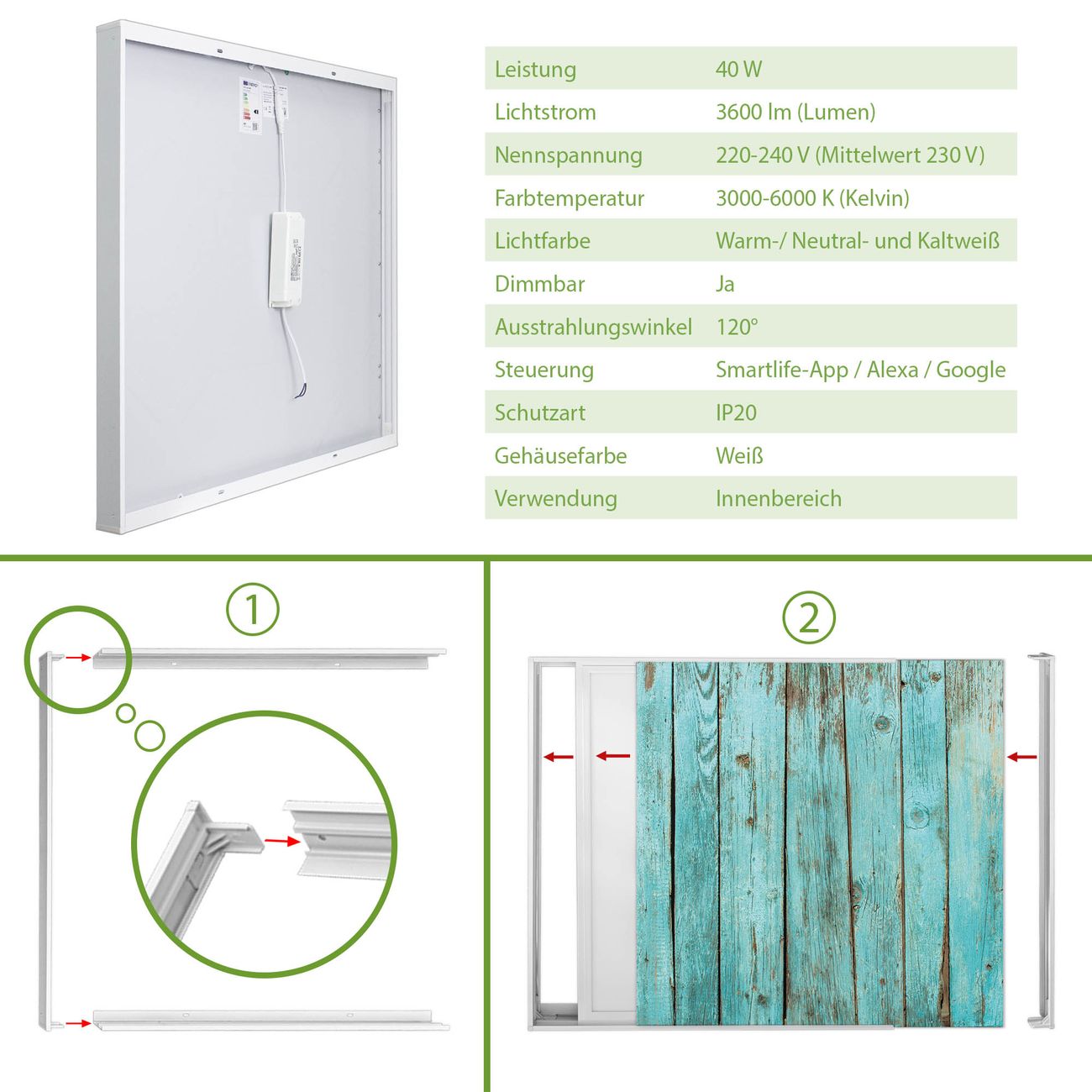 Entdecken Sie unsere vielseitigen Lichtdecken, hier in der Größe 124 x 248cm mit dem Motiv Motiv Blaues Holz - Ihre Beleuchtungslösung für jede Umgebung Beleuchten Sie Ihren Raum nicht nur, sondern schaffen Sie Atmosphäre! Die banjado Lichtdecke verwandelt jeden Ort, ob zu Hause, in Praxen, Büros oder Studios in eine Wohlfühloase. Unsere einzelnen Elemente haben eine genormte Einheitsgröße von 62 x 62cm und können somit in jede gängige Rasterdecken verbaut werden. So finden Sie Ihre passende Ausführung: Gern helfen wir Ihnen, die passende Ausführung zu wählen. Hierfür muss die aktuelle Gegebenheit Ihrer Decke oder Wand beachtet werden. Haben Sie bereits eine Rasterdecke (auch Odenwalddecke genannt)? Hier bestellen Sie lediglich das Motiv + Beleuchtungspanel, denn beides wird in die bereits vorhandene Decke eingelegt. Haben Sie eine glatte Decke mit Lichtauslass oder möchten die Lichtdecke an der Wand befestigen? Hier bestellen Sie bitte Motiv + Beleuchtungspanel + Deckenbefestigung, eine Aufbauanleitung liegt immer bei. Die Lichtdecke kann sowohl an der Decke als auch an der Wand montiert werden, perfekt für kreative Lichtakzente oder alternative Beleuchtungslösungen. Haben Sie bereits eine Lichtdecke und möchten nur das Motiv wechseln? Hier bestellen Sie bitte nur Motiv, der Wechsel ist denkbar einfach. Der Aufbau Ihrer banjado Lichtdecke gestaltet sich unkompliziert, dank einer verständlichen Anleitung, die Ihnen Schritt für Schritt durch den Montageprozess hilft. Für die endgültige Installation und den sicheren Anschluss empfehlen wir die Hinzuziehung eines Fachmanns, um die optimale Funktion und Sicherheit Ihrer Beleuchtung zu gewährleisten. Falls Sie einen Fachmann für die Installation benötigen, geben Sie uns gern Bescheid, wir vermitteln Ihnen gern einen geeigneten Ansprechpartner aus Ihrer Nähe. Steuerung: Steigern Sie Ihr Beleuchtungserlebnis mit der nahtlosen Integration in Ihr Smart Home. Durch die Kompatibilität mit der SmartLife App, Alexa und Google Assistant wird Ihr Smartphone zur zentralen Steuerungseinheit. Ihr Handy fungiert hierbei sozusagen als Fernbedienung. Legen Sie individuelle Lichtszenen in der App fest, die bei Aktivierung über den Wand-Ein-/Ausschalter immer wieder abgerufen werden können ohne Handy. Mit der Szenenfunktion in der Smart App können Sie die Beleuchtung personalisieren und steuern, sodass sie auf Ihre individuellen Bedürfnisse, Tagesrhythmus und Stimmung zugeschnitten ist. Beispielsweise können Sie sich in der Morgendämmerung durch ein sanftes Licht wecken lassen oder das Licht der Praxis werktags um 7 Uhr automatisch einschalten lassen. Dieses kann dann natürlich auch zu einer bestimmten Zeit automatisch ausgeschaltet werden. Motivwahl: Diese einzigartige Lichtdecke zeichnet sich durch ihre Fähigkeit aus, die Lichtfarbe je nach gewähltem Motiv anzupassen - ein Baum wirft ein sanftes grünes Licht, während eine Wolkendecke Ihren Raum in ein beruhigendes blaues Leuchten hüllt. Berücksichtigen Sie dies bitte bei Ihrer Motivauswahl. Sie können das Motiv jederzeit ohne großen Aufwand austauschen, ob nach Jahreszeit oder anderem Anlass, unsere Auswahl lässt kaum Wünsche offen. Wir fertigen Ihnen gern eine personalisierte Lichtdecke mit einem eigenen Motiv oder Logo oder Foto, schreiben Sie uns jederzeit an. Technische Daten: Das Motiv ist auf einer 4mm starken Acrylglas Scheibe aufgebracht, das Gesamtgewicht Ihrer Ausführung beträgt 39,4kg. Die Farbtemperatur lässt sich frei einstellen von 3000 bis 6000 Kelvin, damit können Sie stufenlos zwischen warmweiß, neutralweiß und kaltweiß wählen. Die Gesamtleistung bei Ihrer gewählten Ausführung beträgt 320W. Der Lichtstrom beträgt 3600 Lumen, die Nennspannung 230 V. Die Lichtdecke ist mit Schutzart IP20 für den Innenbereich konzipiert und sollte nicht im Nassbereich verwendet werden.