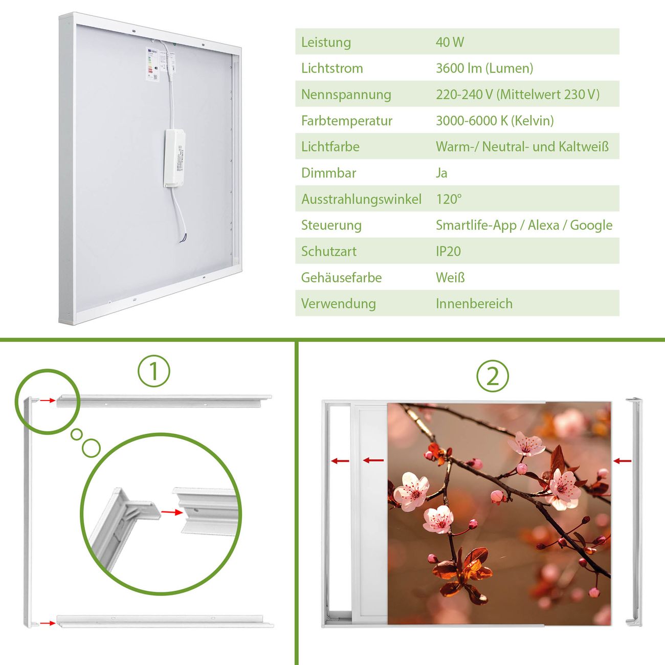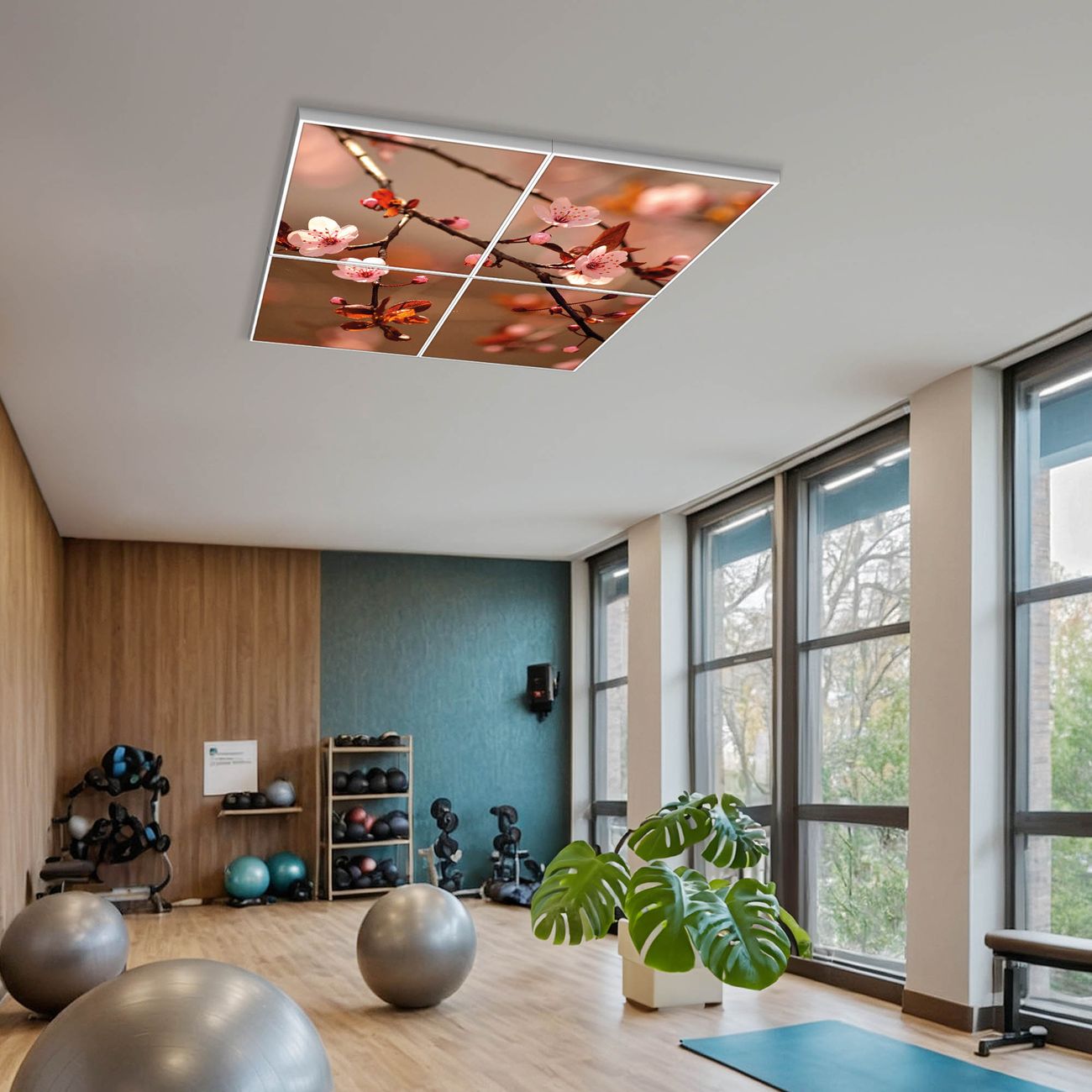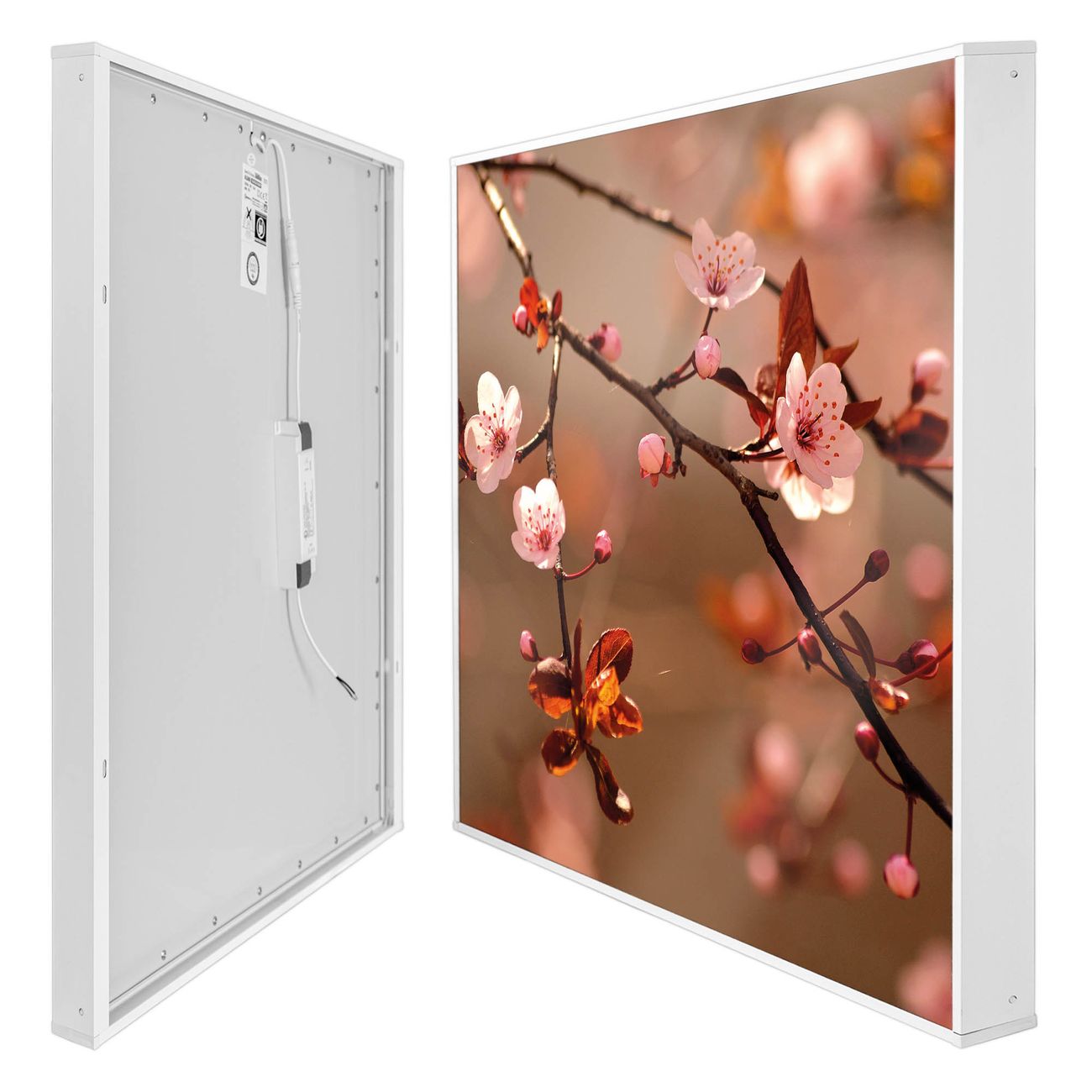 Entdecken Sie unsere vielseitigen Lichtdecken, hier in der Größe 124 x 124cm mit dem Motiv Motiv Blühender Kirschzweig - Ihre Beleuchtungslösung für jede Umgebung Beleuchten Sie Ihren Raum nicht nur, sondern schaffen Sie Atmosphäre! Die banjado Lichtdecke verwandelt jeden Ort, ob zu Hause, in Praxen, Büros oder Studios in eine Wohlfühloase. Unsere einzelnen Elemente haben eine genormte Einheitsgröße von 62 x 62cm und können somit in jede gängige Rasterdecken verbaut werden. So finden Sie Ihre passende Ausführung: Gern helfen wir Ihnen, die passende Ausführung zu wählen. Hierfür muss die aktuelle Gegebenheit Ihrer Decke oder Wand beachtet werden. Haben Sie bereits eine Rasterdecke (auch Odenwalddecke genannt)? Hier bestellen Sie lediglich das Motiv + Beleuchtungspanel, denn beides wird in die bereits vorhandene Decke eingelegt. Haben Sie eine glatte Decke mit Lichtauslass oder möchten die Lichtdecke an der Wand befestigen? Hier bestellen Sie bitte Motiv + Beleuchtungspanel + Deckenbefestigung, eine Aufbauanleitung liegt immer bei. Die Lichtdecke kann sowohl an der Decke als auch an der Wand montiert werden, perfekt für kreative Lichtakzente oder alternative Beleuchtungslösungen. Haben Sie bereits eine Lichtdecke und möchten nur das Motiv wechseln? Hier bestellen Sie bitte nur Motiv, der Wechsel ist denkbar einfach. Der Aufbau Ihrer banjado Lichtdecke gestaltet sich unkompliziert, dank einer verständlichen Anleitung, die Ihnen Schritt für Schritt durch den Montageprozess hilft. Für die endgültige Installation und den sicheren Anschluss empfehlen wir die Hinzuziehung eines Fachmanns, um die optimale Funktion und Sicherheit Ihrer Beleuchtung zu gewährleisten. Falls Sie einen Fachmann für die Installation benötigen, geben Sie uns gern Bescheid, wir vermitteln Ihnen gern einen geeigneten Ansprechpartner aus Ihrer Nähe. Steuerung: Steigern Sie Ihr Beleuchtungserlebnis mit der nahtlosen Integration in Ihr Smart Home. Durch die Kompatibilität mit der SmartLife App, Alexa und Google Assistant wird Ihr Smartphone zur zentralen Steuerungseinheit. Ihr Handy fungiert hierbei sozusagen als Fernbedienung. Legen Sie individuelle Lichtszenen in der App fest, die bei Aktivierung über den Wand-Ein-/Ausschalter immer wieder abgerufen werden können ohne Handy. Mit der Szenenfunktion in der Smart App können Sie die Beleuchtung personalisieren und steuern, sodass sie auf Ihre individuellen Bedürfnisse, Tagesrhythmus und Stimmung zugeschnitten ist. Beispielsweise können Sie sich in der Morgendämmerung durch ein sanftes Licht wecken lassen oder das Licht der Praxis werktags um 7 Uhr automatisch einschalten lassen. Dieses kann dann natürlich auch zu einer bestimmten Zeit automatisch ausgeschaltet werden. Motivwahl: Diese einzigartige Lichtdecke zeichnet sich durch ihre Fähigkeit aus, die Lichtfarbe je nach gewähltem Motiv anzupassen - ein Baum wirft ein sanftes grünes Licht, während eine Wolkendecke Ihren Raum in ein beruhigendes blaues Leuchten hüllt. Berücksichtigen Sie dies bitte bei Ihrer Motivauswahl. Sie können das Motiv jederzeit ohne großen Aufwand austauschen, ob nach Jahreszeit oder anderem Anlass, unsere Auswahl lässt kaum Wünsche offen. Wir fertigen Ihnen gern eine personalisierte Lichtdecke mit einem eigenen Motiv oder Logo oder Foto, schreiben Sie uns jederzeit an. Technische Daten: Das Motiv ist auf einer 4mm starken Acrylglas Scheibe aufgebracht, das Gesamtgewicht Ihrer Ausführung beträgt 19,7kg. Die Farbtemperatur lässt sich frei einstellen von 3000 bis 6000 Kelvin, damit können Sie stufenlos zwischen warmweiß, neutralweiß und kaltweiß wählen. Die Gesamtleistung bei Ihrer gewählten Ausführung beträgt 160W. Der Lichtstrom beträgt 3600 Lumen, die Nennspannung 230 V. Die Lichtdecke ist mit Schutzart IP20 für den Innenbereich konzipiert und sollte nicht im Nassbereich verwendet werden.