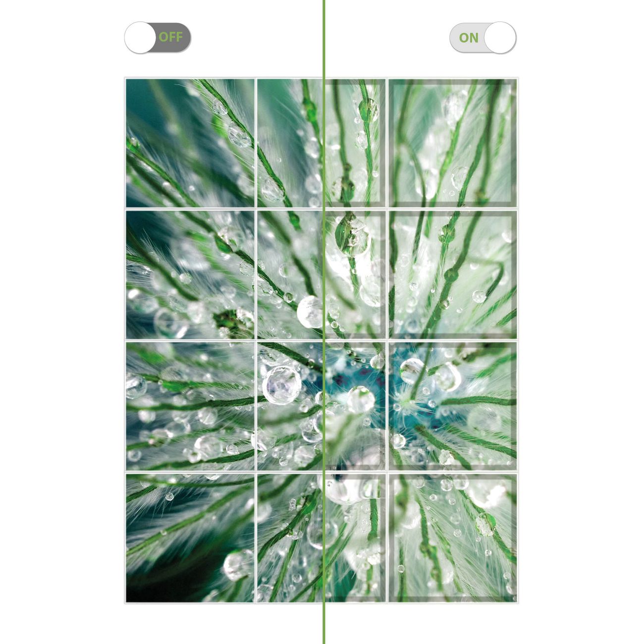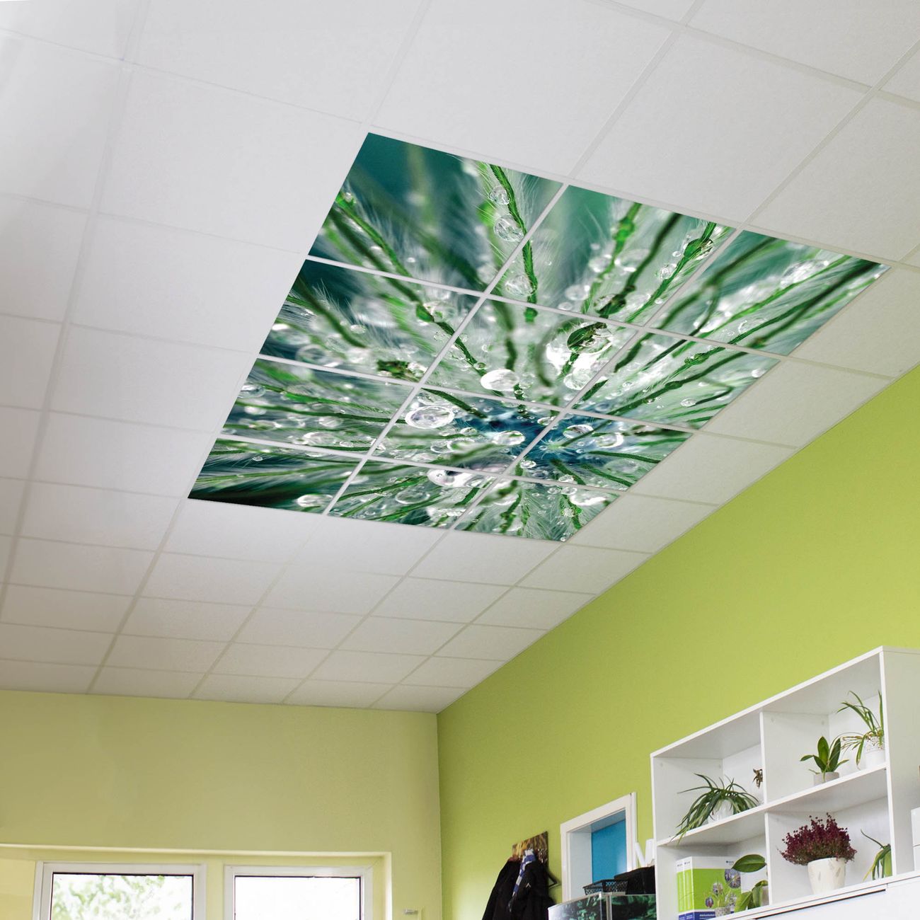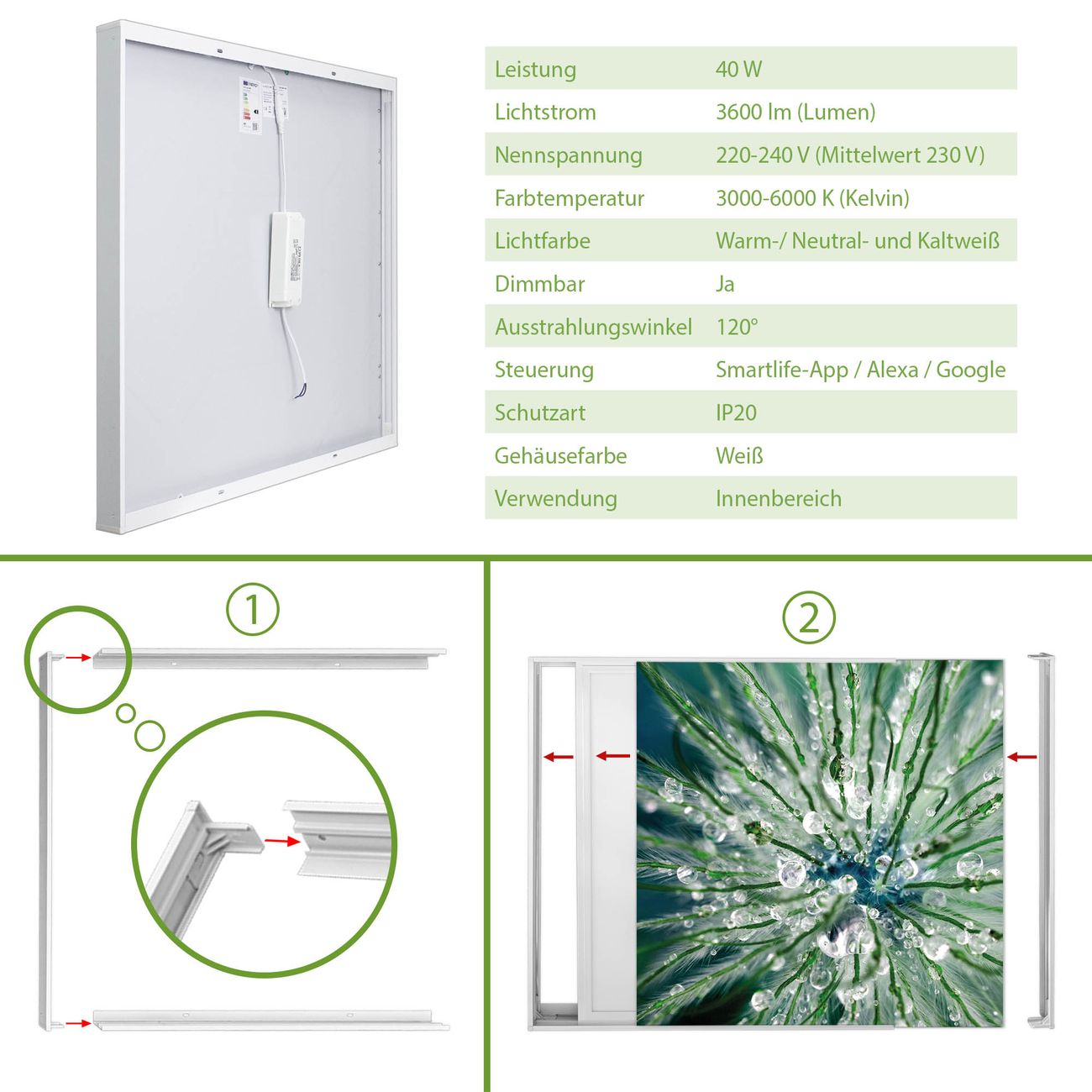 Entdecken Sie unsere vielseitigen Lichtdecken, hier in der Größe 186 x 248cm mit dem Motiv Motiv Blüte Mit Tautropfen - Ihre Beleuchtungslösung für jede Umgebung Beleuchten Sie Ihren Raum nicht nur, sondern schaffen Sie Atmosphäre! Die banjado Lichtdecke verwandelt jeden Ort, ob zu Hause, in Praxen, Büros oder Studios in eine Wohlfühloase. Unsere einzelnen Elemente haben eine genormte Einheitsgröße von 62 x 62cm und können somit in jede gängige Rasterdecken verbaut werden. So finden Sie Ihre passende Ausführung: Gern helfen wir Ihnen, die passende Ausführung zu wählen. Hierfür muss die aktuelle Gegebenheit Ihrer Decke oder Wand beachtet werden. Haben Sie bereits eine Rasterdecke (auch Odenwalddecke genannt)? Hier bestellen Sie lediglich das Motiv + Beleuchtungspanel, denn beides wird in die bereits vorhandene Decke eingelegt. Haben Sie eine glatte Decke mit Lichtauslass oder möchten die Lichtdecke an der Wand befestigen? Hier bestellen Sie bitte Motiv + Beleuchtungspanel + Deckenbefestigung, eine Aufbauanleitung liegt immer bei. Die Lichtdecke kann sowohl an der Decke als auch an der Wand montiert werden, perfekt für kreative Lichtakzente oder alternative Beleuchtungslösungen. Haben Sie bereits eine Lichtdecke und möchten nur das Motiv wechseln? Hier bestellen Sie bitte nur Motiv, der Wechsel ist denkbar einfach. Der Aufbau Ihrer banjado Lichtdecke gestaltet sich unkompliziert, dank einer verständlichen Anleitung, die Ihnen Schritt für Schritt durch den Montageprozess hilft. Für die endgültige Installation und den sicheren Anschluss empfehlen wir die Hinzuziehung eines Fachmanns, um die optimale Funktion und Sicherheit Ihrer Beleuchtung zu gewährleisten. Falls Sie einen Fachmann für die Installation benötigen, geben Sie uns gern Bescheid, wir vermitteln Ihnen gern einen geeigneten Ansprechpartner aus Ihrer Nähe. Steuerung: Steigern Sie Ihr Beleuchtungserlebnis mit der nahtlosen Integration in Ihr Smart Home. Durch die Kompatibilität mit der SmartLife App, Alexa und Google Assistant wird Ihr Smartphone zur zentralen Steuerungseinheit. Ihr Handy fungiert hierbei sozusagen als Fernbedienung. Legen Sie individuelle Lichtszenen in der App fest, die bei Aktivierung über den Wand-Ein-/Ausschalter immer wieder abgerufen werden können ohne Handy. Mit der Szenenfunktion in der Smart App können Sie die Beleuchtung personalisieren und steuern, sodass sie auf Ihre individuellen Bedürfnisse, Tagesrhythmus und Stimmung zugeschnitten ist. Beispielsweise können Sie sich in der Morgendämmerung durch ein sanftes Licht wecken lassen oder das Licht der Praxis werktags um 7 Uhr automatisch einschalten lassen. Dieses kann dann natürlich auch zu einer bestimmten Zeit automatisch ausgeschaltet werden. Motivwahl: Diese einzigartige Lichtdecke zeichnet sich durch ihre Fähigkeit aus, die Lichtfarbe je nach gewähltem Motiv anzupassen - ein Baum wirft ein sanftes grünes Licht, während eine Wolkendecke Ihren Raum in ein beruhigendes blaues Leuchten hüllt. Berücksichtigen Sie dies bitte bei Ihrer Motivauswahl. Sie können das Motiv jederzeit ohne großen Aufwand austauschen, ob nach Jahreszeit oder anderem Anlass, unsere Auswahl lässt kaum Wünsche offen. Wir fertigen Ihnen gern eine personalisierte Lichtdecke mit einem eigenen Motiv oder Logo oder Foto, schreiben Sie uns jederzeit an. Technische Daten: Das Motiv ist auf einer 4mm starken Acrylglas Scheibe aufgebracht, das Gesamtgewicht Ihrer Ausführung beträgt 53,1kg. Die Farbtemperatur lässt sich frei einstellen von 3000 bis 6000 Kelvin, damit können Sie stufenlos zwischen warmweiß, neutralweiß und kaltweiß wählen. Die Gesamtleistung bei Ihrer gewählten Ausführung beträgt 480W. Der Lichtstrom beträgt 3600 Lumen, die Nennspannung 230 V. Die Lichtdecke ist mit Schutzart IP20 für den Innenbereich konzipiert und sollte nicht im Nassbereich verwendet werden.
