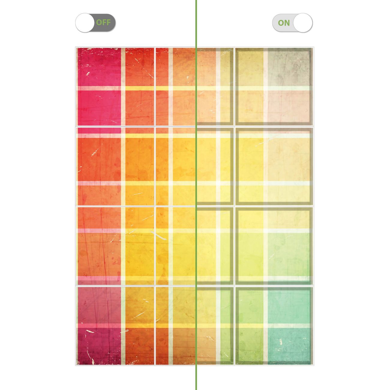 Entdecken Sie unsere vielseitigen Lichtdecken, hier in der Größe 186 x 248cm mit dem Motiv Motiv Bunte Glasbausteine - Ihre Beleuchtungslösung für jede Umgebung Beleuchten Sie Ihren Raum nicht nur, sondern schaffen Sie Atmosphäre! Die banjado Lichtdecke verwandelt jeden Ort, ob zu Hause, in Praxen, Büros oder Studios in eine Wohlfühloase. Unsere einzelnen Elemente haben eine genormte Einheitsgröße von 62 x 62cm und können somit in jede gängige Rasterdecken verbaut werden. So finden Sie Ihre passende Ausführung: Gern helfen wir Ihnen, die passende Ausführung zu wählen. Hierfür muss die aktuelle Gegebenheit Ihrer Decke oder Wand beachtet werden. Haben Sie bereits eine Rasterdecke (auch Odenwalddecke genannt)? Hier bestellen Sie lediglich das Motiv + Beleuchtungspanel, denn beides wird in die bereits vorhandene Decke eingelegt. Haben Sie eine glatte Decke mit Lichtauslass oder möchten die Lichtdecke an der Wand befestigen? Hier bestellen Sie bitte Motiv + Beleuchtungspanel + Deckenbefestigung, eine Aufbauanleitung liegt immer bei. Die Lichtdecke kann sowohl an der Decke als auch an der Wand montiert werden, perfekt für kreative Lichtakzente oder alternative Beleuchtungslösungen. Haben Sie bereits eine Lichtdecke und möchten nur das Motiv wechseln? Hier bestellen Sie bitte nur Motiv, der Wechsel ist denkbar einfach. Der Aufbau Ihrer banjado Lichtdecke gestaltet sich unkompliziert, dank einer verständlichen Anleitung, die Ihnen Schritt für Schritt durch den Montageprozess hilft. Für die endgültige Installation und den sicheren Anschluss empfehlen wir die Hinzuziehung eines Fachmanns, um die optimale Funktion und Sicherheit Ihrer Beleuchtung zu gewährleisten. Falls Sie einen Fachmann für die Installation benötigen, geben Sie uns gern Bescheid, wir vermitteln Ihnen gern einen geeigneten Ansprechpartner aus Ihrer Nähe. Steuerung: Steigern Sie Ihr Beleuchtungserlebnis mit der nahtlosen Integration in Ihr Smart Home. Durch die Kompatibilität mit der SmartLife App, Alexa und Google Assistant wird Ihr Smartphone zur zentralen Steuerungseinheit. Ihr Handy fungiert hierbei sozusagen als Fernbedienung. Legen Sie individuelle Lichtszenen in der App fest, die bei Aktivierung über den Wand-Ein-/Ausschalter immer wieder abgerufen werden können ohne Handy. Mit der Szenenfunktion in der Smart App können Sie die Beleuchtung personalisieren und steuern, sodass sie auf Ihre individuellen Bedürfnisse, Tagesrhythmus und Stimmung zugeschnitten ist. Beispielsweise können Sie sich in der Morgendämmerung durch ein sanftes Licht wecken lassen oder das Licht der Praxis werktags um 7 Uhr automatisch einschalten lassen. Dieses kann dann natürlich auch zu einer bestimmten Zeit automatisch ausgeschaltet werden. Motivwahl: Diese einzigartige Lichtdecke zeichnet sich durch ihre Fähigkeit aus, die Lichtfarbe je nach gewähltem Motiv anzupassen - ein Baum wirft ein sanftes grünes Licht, während eine Wolkendecke Ihren Raum in ein beruhigendes blaues Leuchten hüllt. Berücksichtigen Sie dies bitte bei Ihrer Motivauswahl. Sie können das Motiv jederzeit ohne großen Aufwand austauschen, ob nach Jahreszeit oder anderem Anlass, unsere Auswahl lässt kaum Wünsche offen. Wir fertigen Ihnen gern eine personalisierte Lichtdecke mit einem eigenen Motiv oder Logo oder Foto, schreiben Sie uns jederzeit an. Technische Daten: Das Motiv ist auf einer 4mm starken Acrylglas Scheibe aufgebracht, das Gesamtgewicht Ihrer Ausführung beträgt 27,1kg. Die Farbtemperatur lässt sich frei einstellen von 3000 bis 6000 Kelvin, damit können Sie stufenlos zwischen warmweiß, neutralweiß und kaltweiß wählen. Die Gesamtleistung bei Ihrer gewählten Ausführung beträgt 480W. Der Lichtstrom beträgt 3600 Lumen, die Nennspannung 230 V. Die Lichtdecke ist mit Schutzart IP20 für den Innenbereich konzipiert und sollte nicht im Nassbereich verwendet werden.