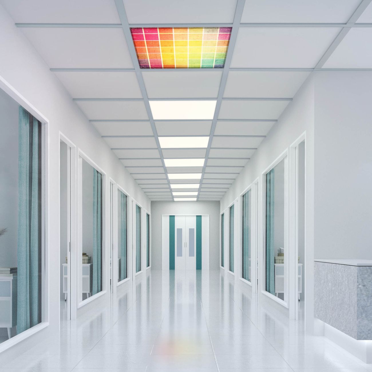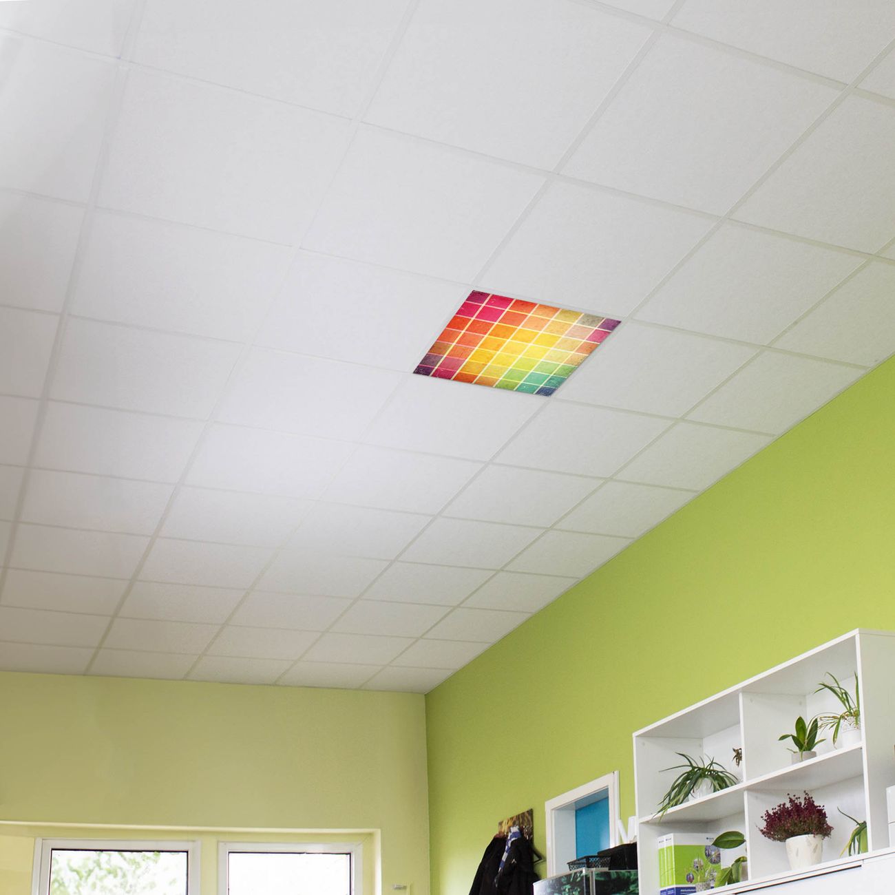 Entdecken Sie unsere vielseitigen Lichtdecken, hier in der Größe 62 x 62cm mit dem Motiv Motiv Bunte Glasbausteine - Ihre Beleuchtungslösung für jede Umgebung Beleuchten Sie Ihren Raum nicht nur, sondern schaffen Sie Atmosphäre! Die banjado Lichtdecke verwandelt jeden Ort, ob zu Hause, in Praxen, Büros oder Studios in eine Wohlfühloase. Unsere einzelnen Elemente haben eine genormte Einheitsgröße von 62 x 62cm und können somit in jede gängige Rasterdecken verbaut werden. So finden Sie Ihre passende Ausführung: Gern helfen wir Ihnen, die passende Ausführung zu wählen. Hierfür muss die aktuelle Gegebenheit Ihrer Decke oder Wand beachtet werden. Haben Sie bereits eine Rasterdecke (auch Odenwalddecke genannt)? Hier bestellen Sie lediglich das Motiv + Beleuchtungspanel, denn beides wird in die bereits vorhandene Decke eingelegt. Haben Sie eine glatte Decke mit Lichtauslass oder möchten die Lichtdecke an der Wand befestigen? Hier bestellen Sie bitte Motiv + Beleuchtungspanel + Deckenbefestigung, eine Aufbauanleitung liegt immer bei. Die Lichtdecke kann sowohl an der Decke als auch an der Wand montiert werden, perfekt für kreative Lichtakzente oder alternative Beleuchtungslösungen. Haben Sie bereits eine Lichtdecke und möchten nur das Motiv wechseln? Hier bestellen Sie bitte nur Motiv, der Wechsel ist denkbar einfach. Der Aufbau Ihrer banjado Lichtdecke gestaltet sich unkompliziert, dank einer verständlichen Anleitung, die Ihnen Schritt für Schritt durch den Montageprozess hilft. Für die endgültige Installation und den sicheren Anschluss empfehlen wir die Hinzuziehung eines Fachmanns, um die optimale Funktion und Sicherheit Ihrer Beleuchtung zu gewährleisten. Falls Sie einen Fachmann für die Installation benötigen, geben Sie uns gern Bescheid, wir vermitteln Ihnen gern einen geeigneten Ansprechpartner aus Ihrer Nähe. Steuerung: Steigern Sie Ihr Beleuchtungserlebnis mit der nahtlosen Integration in Ihr Smart Home. Durch die Kompatibilität mit der SmartLife App, Alexa und Google Assistant wird Ihr Smartphone zur zentralen Steuerungseinheit. Ihr Handy fungiert hierbei sozusagen als Fernbedienung. Legen Sie individuelle Lichtszenen in der App fest, die bei Aktivierung über den Wand-Ein-/Ausschalter immer wieder abgerufen werden können ohne Handy. Mit der Szenenfunktion in der Smart App können Sie die Beleuchtung personalisieren und steuern, sodass sie auf Ihre individuellen Bedürfnisse, Tagesrhythmus und Stimmung zugeschnitten ist. Beispielsweise können Sie sich in der Morgendämmerung durch ein sanftes Licht wecken lassen oder das Licht der Praxis werktags um 7 Uhr automatisch einschalten lassen. Dieses kann dann natürlich auch zu einer bestimmten Zeit automatisch ausgeschaltet werden. Motivwahl: Diese einzigartige Lichtdecke zeichnet sich durch ihre Fähigkeit aus, die Lichtfarbe je nach gewähltem Motiv anzupassen - ein Baum wirft ein sanftes grünes Licht, während eine Wolkendecke Ihren Raum in ein beruhigendes blaues Leuchten hüllt. Berücksichtigen Sie dies bitte bei Ihrer Motivauswahl. Sie können das Motiv jederzeit ohne großen Aufwand austauschen, ob nach Jahreszeit oder anderem Anlass, unsere Auswahl lässt kaum Wünsche offen. Wir fertigen Ihnen gern eine personalisierte Lichtdecke mit einem eigenen Motiv oder Logo oder Foto, schreiben Sie uns jederzeit an. Technische Daten: Das Motiv ist auf einer 4mm starken Acrylglas Scheibe aufgebracht, das Gesamtgewicht Ihrer Ausführung beträgt 4,4kg. Die Farbtemperatur lässt sich frei einstellen von 3000 bis 6000 Kelvin, damit können Sie stufenlos zwischen warmweiß, neutralweiß und kaltweiß wählen. Die Gesamtleistung bei Ihrer gewählten Ausführung beträgt 40W. Der Lichtstrom beträgt 3600 Lumen, die Nennspannung 230 V. Die Lichtdecke ist mit Schutzart IP20 für den Innenbereich konzipiert und sollte nicht im Nassbereich verwendet werden.
