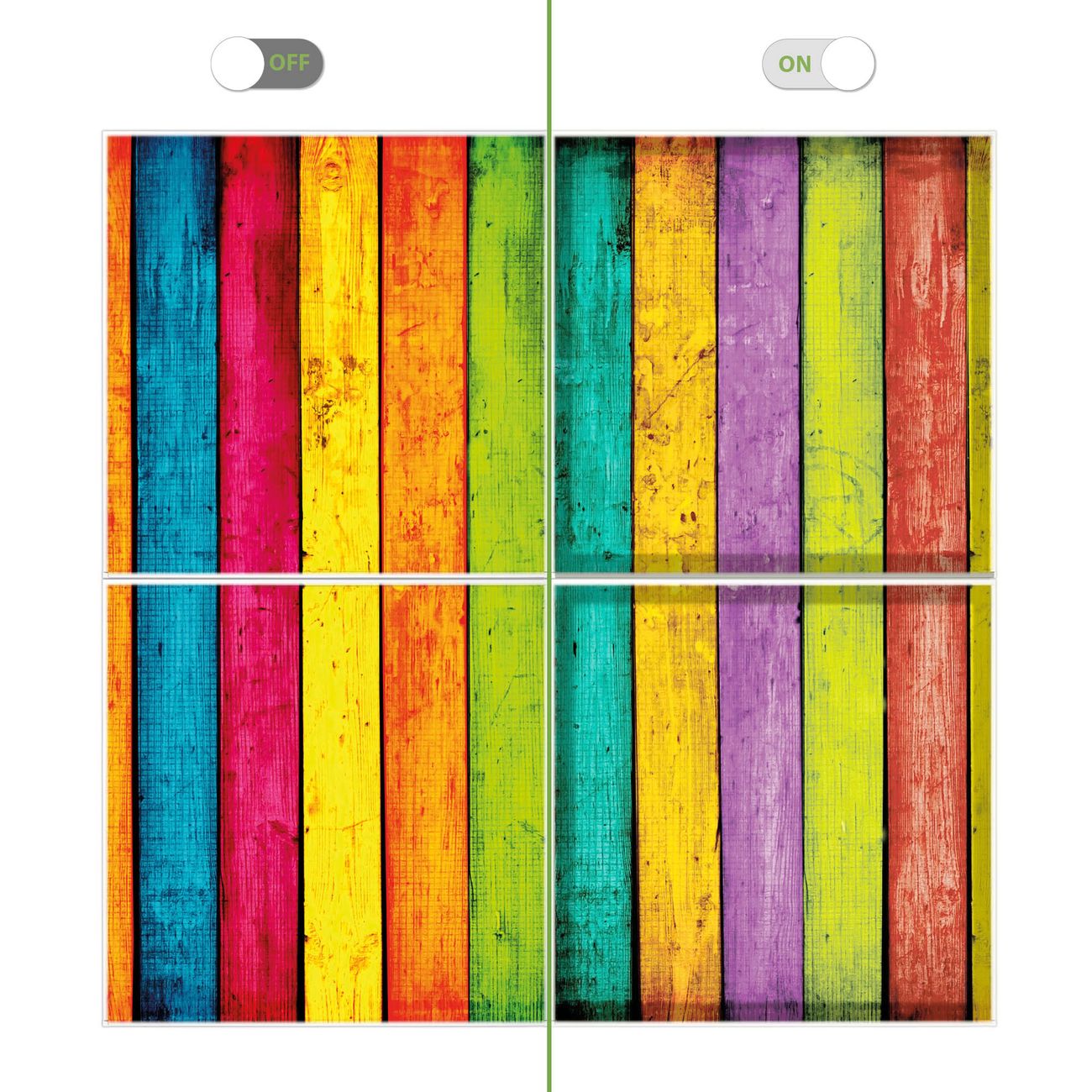 Entdecken Sie unsere vielseitigen Lichtdecken, hier in der Größe 124 x 124cm mit dem Motiv Motiv Bunte Holzlatten - Ihre Beleuchtungslösung für jede Umgebung Beleuchten Sie Ihren Raum nicht nur, sondern schaffen Sie Atmosphäre! Die banjado Lichtdecke verwandelt jeden Ort, ob zu Hause, in Praxen, Büros oder Studios in eine Wohlfühloase. Unsere einzelnen Elemente haben eine genormte Einheitsgröße von 62 x 62cm und können somit in jede gängige Rasterdecken verbaut werden. So finden Sie Ihre passende Ausführung: Gern helfen wir Ihnen, die passende Ausführung zu wählen. Hierfür muss die aktuelle Gegebenheit Ihrer Decke oder Wand beachtet werden. Haben Sie bereits eine Rasterdecke (auch Odenwalddecke genannt)? Hier bestellen Sie lediglich das Motiv + Beleuchtungspanel, denn beides wird in die bereits vorhandene Decke eingelegt. Haben Sie eine glatte Decke mit Lichtauslass oder möchten die Lichtdecke an der Wand befestigen? Hier bestellen Sie bitte Motiv + Beleuchtungspanel + Deckenbefestigung, eine Aufbauanleitung liegt immer bei. Die Lichtdecke kann sowohl an der Decke als auch an der Wand montiert werden, perfekt für kreative Lichtakzente oder alternative Beleuchtungslösungen. Haben Sie bereits eine Lichtdecke und möchten nur das Motiv wechseln? Hier bestellen Sie bitte nur Motiv, der Wechsel ist denkbar einfach. Der Aufbau Ihrer banjado Lichtdecke gestaltet sich unkompliziert, dank einer verständlichen Anleitung, die Ihnen Schritt für Schritt durch den Montageprozess hilft. Für die endgültige Installation und den sicheren Anschluss empfehlen wir die Hinzuziehung eines Fachmanns, um die optimale Funktion und Sicherheit Ihrer Beleuchtung zu gewährleisten. Falls Sie einen Fachmann für die Installation benötigen, geben Sie uns gern Bescheid, wir vermitteln Ihnen gern einen geeigneten Ansprechpartner aus Ihrer Nähe. Steuerung: Steigern Sie Ihr Beleuchtungserlebnis mit der nahtlosen Integration in Ihr Smart Home. Durch die Kompatibilität mit der SmartLife App, Alexa und Google Assistant wird Ihr Smartphone zur zentralen Steuerungseinheit. Ihr Handy fungiert hierbei sozusagen als Fernbedienung. Legen Sie individuelle Lichtszenen in der App fest, die bei Aktivierung über den Wand-Ein-/Ausschalter immer wieder abgerufen werden können ohne Handy. Mit der Szenenfunktion in der Smart App können Sie die Beleuchtung personalisieren und steuern, sodass sie auf Ihre individuellen Bedürfnisse, Tagesrhythmus und Stimmung zugeschnitten ist. Beispielsweise können Sie sich in der Morgendämmerung durch ein sanftes Licht wecken lassen oder das Licht der Praxis werktags um 7 Uhr automatisch einschalten lassen. Dieses kann dann natürlich auch zu einer bestimmten Zeit automatisch ausgeschaltet werden. Motivwahl: Diese einzigartige Lichtdecke zeichnet sich durch ihre Fähigkeit aus, die Lichtfarbe je nach gewähltem Motiv anzupassen - ein Baum wirft ein sanftes grünes Licht, während eine Wolkendecke Ihren Raum in ein beruhigendes blaues Leuchten hüllt. Berücksichtigen Sie dies bitte bei Ihrer Motivauswahl. Sie können das Motiv jederzeit ohne großen Aufwand austauschen, ob nach Jahreszeit oder anderem Anlass, unsere Auswahl lässt kaum Wünsche offen. Wir fertigen Ihnen gern eine personalisierte Lichtdecke mit einem eigenen Motiv oder Logo oder Foto, schreiben Sie uns jederzeit an. Technische Daten: Das Motiv ist auf einer 4mm starken Acrylglas Scheibe aufgebracht, das Gesamtgewicht Ihrer Ausführung beträgt 19,7kg. Die Farbtemperatur lässt sich frei einstellen von 3000 bis 6000 Kelvin, damit können Sie stufenlos zwischen warmweiß, neutralweiß und kaltweiß wählen. Die Gesamtleistung bei Ihrer gewählten Ausführung beträgt 160W. Der Lichtstrom beträgt 3600 Lumen, die Nennspannung 230 V. Die Lichtdecke ist mit Schutzart IP20 für den Innenbereich konzipiert und sollte nicht im Nassbereich verwendet werden.