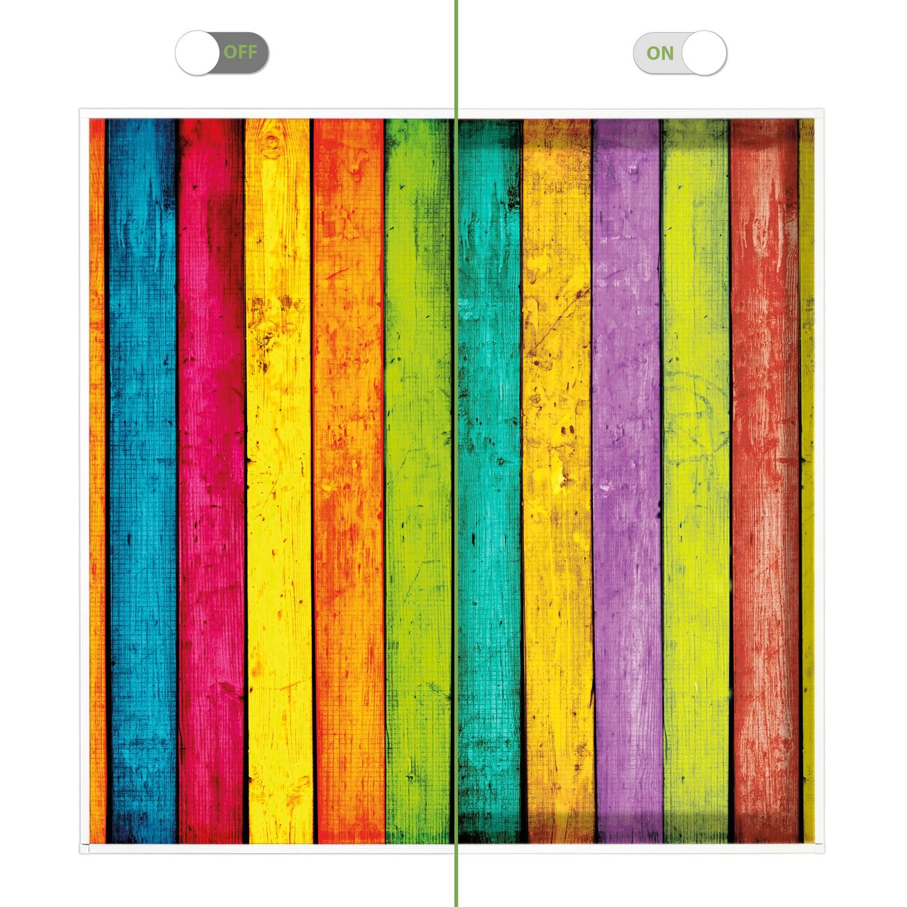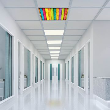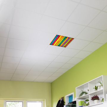 Entdecken Sie unsere vielseitigen Lichtdecken, hier in der Größe 62 x 62cm mit dem Motiv Motiv Bunte Holzlatten - Ihre Beleuchtungslösung für jede Umgebung Beleuchten Sie Ihren Raum nicht nur, sondern schaffen Sie Atmosphäre! Die banjado Lichtdecke verwandelt jeden Ort, ob zu Hause, in Praxen, Büros oder Studios in eine Wohlfühloase. Unsere einzelnen Elemente haben eine genormte Einheitsgröße von 62 x 62cm und können somit in jede gängige Rasterdecken verbaut werden. So finden Sie Ihre passende Ausführung: Gern helfen wir Ihnen, die passende Ausführung zu wählen. Hierfür muss die aktuelle Gegebenheit Ihrer Decke oder Wand beachtet werden. Haben Sie bereits eine Rasterdecke (auch Odenwalddecke genannt)? Hier bestellen Sie lediglich das Motiv + Beleuchtungspanel, denn beides wird in die bereits vorhandene Decke eingelegt. Haben Sie eine glatte Decke mit Lichtauslass oder möchten die Lichtdecke an der Wand befestigen? Hier bestellen Sie bitte Motiv + Beleuchtungspanel + Deckenbefestigung, eine Aufbauanleitung liegt immer bei. Die Lichtdecke kann sowohl an der Decke als auch an der Wand montiert werden, perfekt für kreative Lichtakzente oder alternative Beleuchtungslösungen. Haben Sie bereits eine Lichtdecke und möchten nur das Motiv wechseln? Hier bestellen Sie bitte nur Motiv, der Wechsel ist denkbar einfach. Der Aufbau Ihrer banjado Lichtdecke gestaltet sich unkompliziert, dank einer verständlichen Anleitung, die Ihnen Schritt für Schritt durch den Montageprozess hilft. Für die endgültige Installation und den sicheren Anschluss empfehlen wir die Hinzuziehung eines Fachmanns, um die optimale Funktion und Sicherheit Ihrer Beleuchtung zu gewährleisten. Falls Sie einen Fachmann für die Installation benötigen, geben Sie uns gern Bescheid, wir vermitteln Ihnen gern einen geeigneten Ansprechpartner aus Ihrer Nähe. Steuerung: Steigern Sie Ihr Beleuchtungserlebnis mit der nahtlosen Integration in Ihr Smart Home. Durch die Kompatibilität mit der SmartLife App, Alexa und Google Assistant wird Ihr Smartphone zur zentralen Steuerungseinheit. Ihr Handy fungiert hierbei sozusagen als Fernbedienung. Legen Sie individuelle Lichtszenen in der App fest, die bei Aktivierung über den Wand-Ein-/Ausschalter immer wieder abgerufen werden können ohne Handy. Mit der Szenenfunktion in der Smart App können Sie die Beleuchtung personalisieren und steuern, sodass sie auf Ihre individuellen Bedürfnisse, Tagesrhythmus und Stimmung zugeschnitten ist. Beispielsweise können Sie sich in der Morgendämmerung durch ein sanftes Licht wecken lassen oder das Licht der Praxis werktags um 7 Uhr automatisch einschalten lassen. Dieses kann dann natürlich auch zu einer bestimmten Zeit automatisch ausgeschaltet werden. Motivwahl: Diese einzigartige Lichtdecke zeichnet sich durch ihre Fähigkeit aus, die Lichtfarbe je nach gewähltem Motiv anzupassen - ein Baum wirft ein sanftes grünes Licht, während eine Wolkendecke Ihren Raum in ein beruhigendes blaues Leuchten hüllt. Berücksichtigen Sie dies bitte bei Ihrer Motivauswahl. Sie können das Motiv jederzeit ohne großen Aufwand austauschen, ob nach Jahreszeit oder anderem Anlass, unsere Auswahl lässt kaum Wünsche offen. Wir fertigen Ihnen gern eine personalisierte Lichtdecke mit einem eigenen Motiv oder Logo oder Foto, schreiben Sie uns jederzeit an. Technische Daten: Das Motiv ist auf einer 4mm starken Acrylglas Scheibe aufgebracht, das Gesamtgewicht Ihrer Ausführung beträgt 2,3kg. Die Farbtemperatur lässt sich frei einstellen von 3000 bis 6000 Kelvin, damit können Sie stufenlos zwischen warmweiß, neutralweiß und kaltweiß wählen. Die Gesamtleistung bei Ihrer gewählten Ausführung beträgt 40W. Der Lichtstrom beträgt 3600 Lumen, die Nennspannung 230 V. Die Lichtdecke ist mit Schutzart IP20 für den Innenbereich konzipiert und sollte nicht im Nassbereich verwendet werden.