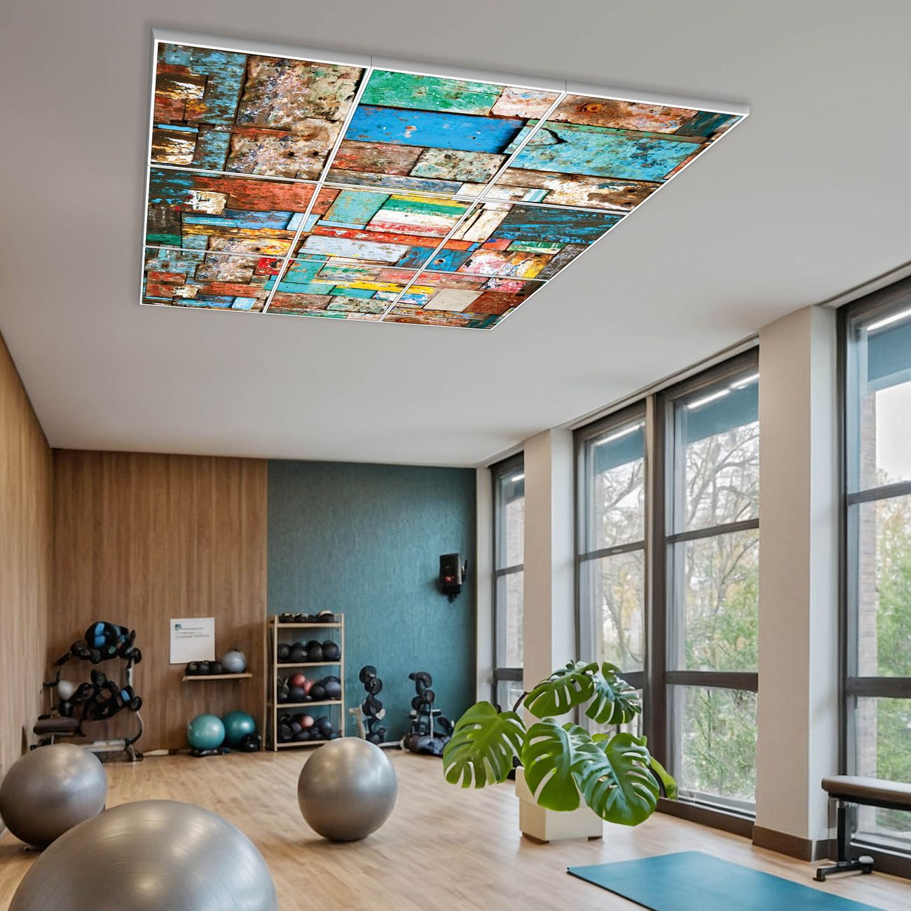 Entdecken Sie unsere vielseitigen Lichtdecken, hier in der Größe 186 x 186cm mit dem Motiv Motiv Bunte Holzschindeln - Ihre Beleuchtungslösung für jede Umgebung Beleuchten Sie Ihren Raum nicht nur, sondern schaffen Sie Atmosphäre! Die banjado Lichtdecke verwandelt jeden Ort, ob zu Hause, in Praxen, Büros oder Studios in eine Wohlfühloase. Unsere einzelnen Elemente haben eine genormte Einheitsgröße von 62 x 62cm und können somit in jede gängige Rasterdecken verbaut werden. So finden Sie Ihre passende Ausführung: Gern helfen wir Ihnen, die passende Ausführung zu wählen. Hierfür muss die aktuelle Gegebenheit Ihrer Decke oder Wand beachtet werden. Haben Sie bereits eine Rasterdecke (auch Odenwalddecke genannt)? Hier bestellen Sie lediglich das Motiv + Beleuchtungspanel, denn beides wird in die bereits vorhandene Decke eingelegt. Haben Sie eine glatte Decke mit Lichtauslass oder möchten die Lichtdecke an der Wand befestigen? Hier bestellen Sie bitte Motiv + Beleuchtungspanel + Deckenbefestigung, eine Aufbauanleitung liegt immer bei. Die Lichtdecke kann sowohl an der Decke als auch an der Wand montiert werden, perfekt für kreative Lichtakzente oder alternative Beleuchtungslösungen. Haben Sie bereits eine Lichtdecke und möchten nur das Motiv wechseln? Hier bestellen Sie bitte nur Motiv, der Wechsel ist denkbar einfach. Der Aufbau Ihrer banjado Lichtdecke gestaltet sich unkompliziert, dank einer verständlichen Anleitung, die Ihnen Schritt für Schritt durch den Montageprozess hilft. Für die endgültige Installation und den sicheren Anschluss empfehlen wir die Hinzuziehung eines Fachmanns, um die optimale Funktion und Sicherheit Ihrer Beleuchtung zu gewährleisten. Falls Sie einen Fachmann für die Installation benötigen, geben Sie uns gern Bescheid, wir vermitteln Ihnen gern einen geeigneten Ansprechpartner aus Ihrer Nähe. Steuerung: Steigern Sie Ihr Beleuchtungserlebnis mit der nahtlosen Integration in Ihr Smart Home. Durch die Kompatibilität mit der SmartLife App, Alexa und Google Assistant wird Ihr Smartphone zur zentralen Steuerungseinheit. Ihr Handy fungiert hierbei sozusagen als Fernbedienung. Legen Sie individuelle Lichtszenen in der App fest, die bei Aktivierung über den Wand-Ein-/Ausschalter immer wieder abgerufen werden können ohne Handy. Mit der Szenenfunktion in der Smart App können Sie die Beleuchtung personalisieren und steuern, sodass sie auf Ihre individuellen Bedürfnisse, Tagesrhythmus und Stimmung zugeschnitten ist. Beispielsweise können Sie sich in der Morgendämmerung durch ein sanftes Licht wecken lassen oder das Licht der Praxis werktags um 7 Uhr automatisch einschalten lassen. Dieses kann dann natürlich auch zu einer bestimmten Zeit automatisch ausgeschaltet werden. Motivwahl: Diese einzigartige Lichtdecke zeichnet sich durch ihre Fähigkeit aus, die Lichtfarbe je nach gewähltem Motiv anzupassen - ein Baum wirft ein sanftes grünes Licht, während eine Wolkendecke Ihren Raum in ein beruhigendes blaues Leuchten hüllt. Berücksichtigen Sie dies bitte bei Ihrer Motivauswahl. Sie können das Motiv jederzeit ohne großen Aufwand austauschen, ob nach Jahreszeit oder anderem Anlass, unsere Auswahl lässt kaum Wünsche offen. Wir fertigen Ihnen gern eine personalisierte Lichtdecke mit einem eigenen Motiv oder Logo oder Foto, schreiben Sie uns jederzeit an. Technische Daten: Das Motiv ist auf einer 4mm starken Acrylglas Scheibe aufgebracht, das Gesamtgewicht Ihrer Ausführung beträgt 44,4kg. Die Farbtemperatur lässt sich frei einstellen von 3000 bis 6000 Kelvin, damit können Sie stufenlos zwischen warmweiß, neutralweiß und kaltweiß wählen. Die Gesamtleistung bei Ihrer gewählten Ausführung beträgt 360W. Der Lichtstrom beträgt 3600 Lumen, die Nennspannung 230 V. Die Lichtdecke ist mit Schutzart IP20 für den Innenbereich konzipiert und sollte nicht im Nassbereich verwendet werden.