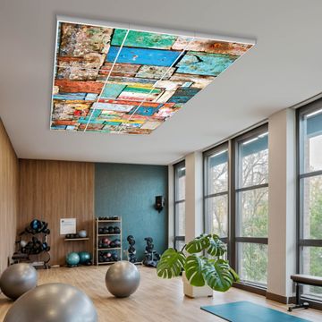 Entdecken Sie unsere vielseitigen Lichtdecken, hier in der Größe 186 x 248cm mit dem Motiv Motiv Bunte Holzschindeln - Ihre Beleuchtungslösung für jede Umgebung Beleuchten Sie Ihren Raum nicht nur, sondern schaffen Sie Atmosphäre! Die banjado Lichtdecke verwandelt jeden Ort, ob zu Hause, in Praxen, Büros oder Studios in eine Wohlfühloase. Unsere einzelnen Elemente haben eine genormte Einheitsgröße von 62 x 62cm und können somit in jede gängige Rasterdecken verbaut werden. So finden Sie Ihre passende Ausführung: Gern helfen wir Ihnen, die passende Ausführung zu wählen. Hierfür muss die aktuelle Gegebenheit Ihrer Decke oder Wand beachtet werden. Haben Sie bereits eine Rasterdecke (auch Odenwalddecke genannt)? Hier bestellen Sie lediglich das Motiv + Beleuchtungspanel, denn beides wird in die bereits vorhandene Decke eingelegt. Haben Sie eine glatte Decke mit Lichtauslass oder möchten die Lichtdecke an der Wand befestigen? Hier bestellen Sie bitte Motiv + Beleuchtungspanel + Deckenbefestigung, eine Aufbauanleitung liegt immer bei. Die Lichtdecke kann sowohl an der Decke als auch an der Wand montiert werden, perfekt für kreative Lichtakzente oder alternative Beleuchtungslösungen. Haben Sie bereits eine Lichtdecke und möchten nur das Motiv wechseln? Hier bestellen Sie bitte nur Motiv, der Wechsel ist denkbar einfach. Der Aufbau Ihrer banjado Lichtdecke gestaltet sich unkompliziert, dank einer verständlichen Anleitung, die Ihnen Schritt für Schritt durch den Montageprozess hilft. Für die endgültige Installation und den sicheren Anschluss empfehlen wir die Hinzuziehung eines Fachmanns, um die optimale Funktion und Sicherheit Ihrer Beleuchtung zu gewährleisten. Falls Sie einen Fachmann für die Installation benötigen, geben Sie uns gern Bescheid, wir vermitteln Ihnen gern einen geeigneten Ansprechpartner aus Ihrer Nähe. Steuerung: Steigern Sie Ihr Beleuchtungserlebnis mit der nahtlosen Integration in Ihr Smart Home. Durch die Kompatibilität mit der SmartLife App, Alexa und Google Assistant wird Ihr Smartphone zur zentralen Steuerungseinheit. Ihr Handy fungiert hierbei sozusagen als Fernbedienung. Legen Sie individuelle Lichtszenen in der App fest, die bei Aktivierung über den Wand-Ein-/Ausschalter immer wieder abgerufen werden können ohne Handy. Mit der Szenenfunktion in der Smart App können Sie die Beleuchtung personalisieren und steuern, sodass sie auf Ihre individuellen Bedürfnisse, Tagesrhythmus und Stimmung zugeschnitten ist. Beispielsweise können Sie sich in der Morgendämmerung durch ein sanftes Licht wecken lassen oder das Licht der Praxis werktags um 7 Uhr automatisch einschalten lassen. Dieses kann dann natürlich auch zu einer bestimmten Zeit automatisch ausgeschaltet werden. Motivwahl: Diese einzigartige Lichtdecke zeichnet sich durch ihre Fähigkeit aus, die Lichtfarbe je nach gewähltem Motiv anzupassen - ein Baum wirft ein sanftes grünes Licht, während eine Wolkendecke Ihren Raum in ein beruhigendes blaues Leuchten hüllt. Berücksichtigen Sie dies bitte bei Ihrer Motivauswahl. Sie können das Motiv jederzeit ohne großen Aufwand austauschen, ob nach Jahreszeit oder anderem Anlass, unsere Auswahl lässt kaum Wünsche offen. Wir fertigen Ihnen gern eine personalisierte Lichtdecke mit einem eigenen Motiv oder Logo oder Foto, schreiben Sie uns jederzeit an. Technische Daten: Das Motiv ist auf einer 4mm starken Acrylglas Scheibe aufgebracht, das Gesamtgewicht Ihrer Ausführung beträgt 59,1kg. Die Farbtemperatur lässt sich frei einstellen von 3000 bis 6000 Kelvin, damit können Sie stufenlos zwischen warmweiß, neutralweiß und kaltweiß wählen. Die Gesamtleistung bei Ihrer gewählten Ausführung beträgt 480W. Der Lichtstrom beträgt 3600 Lumen, die Nennspannung 230 V. Die Lichtdecke ist mit Schutzart IP20 für den Innenbereich konzipiert und sollte nicht im Nassbereich verwendet werden.