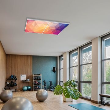 Entdecken Sie unsere vielseitigen Lichtdecken, hier in der Größe 124 x 62cm mit dem Motiv Motiv Bunte Kristalle - Ihre Beleuchtungslösung für jede Umgebung Beleuchten Sie Ihren Raum nicht nur, sondern schaffen Sie Atmosphäre! Die banjado Lichtdecke verwandelt jeden Ort, ob zu Hause, in Praxen, Büros oder Studios in eine Wohlfühloase. Unsere einzelnen Elemente haben eine genormte Einheitsgröße von 62 x 62cm und können somit in jede gängige Rasterdecken verbaut werden. So finden Sie Ihre passende Ausführung: Gern helfen wir Ihnen, die passende Ausführung zu wählen. Hierfür muss die aktuelle Gegebenheit Ihrer Decke oder Wand beachtet werden. Haben Sie bereits eine Rasterdecke (auch Odenwalddecke genannt)? Hier bestellen Sie lediglich das Motiv + Beleuchtungspanel, denn beides wird in die bereits vorhandene Decke eingelegt. Haben Sie eine glatte Decke mit Lichtauslass oder möchten die Lichtdecke an der Wand befestigen? Hier bestellen Sie bitte Motiv + Beleuchtungspanel + Deckenbefestigung, eine Aufbauanleitung liegt immer bei. Die Lichtdecke kann sowohl an der Decke als auch an der Wand montiert werden, perfekt für kreative Lichtakzente oder alternative Beleuchtungslösungen. Haben Sie bereits eine Lichtdecke und möchten nur das Motiv wechseln? Hier bestellen Sie bitte nur Motiv, der Wechsel ist denkbar einfach. Der Aufbau Ihrer banjado Lichtdecke gestaltet sich unkompliziert, dank einer verständlichen Anleitung, die Ihnen Schritt für Schritt durch den Montageprozess hilft. Für die endgültige Installation und den sicheren Anschluss empfehlen wir die Hinzuziehung eines Fachmanns, um die optimale Funktion und Sicherheit Ihrer Beleuchtung zu gewährleisten. Falls Sie einen Fachmann für die Installation benötigen, geben Sie uns gern Bescheid, wir vermitteln Ihnen gern einen geeigneten Ansprechpartner aus Ihrer Nähe. Steuerung: Steigern Sie Ihr Beleuchtungserlebnis mit der nahtlosen Integration in Ihr Smart Home. Durch die Kompatibilität mit der SmartLife App, Alexa und Google Assistant wird Ihr Smartphone zur zentralen Steuerungseinheit. Ihr Handy fungiert hierbei sozusagen als Fernbedienung. Legen Sie individuelle Lichtszenen in der App fest, die bei Aktivierung über den Wand-Ein-/Ausschalter immer wieder abgerufen werden können ohne Handy. Mit der Szenenfunktion in der Smart App können Sie die Beleuchtung personalisieren und steuern, sodass sie auf Ihre individuellen Bedürfnisse, Tagesrhythmus und Stimmung zugeschnitten ist. Beispielsweise können Sie sich in der Morgendämmerung durch ein sanftes Licht wecken lassen oder das Licht der Praxis werktags um 7 Uhr automatisch einschalten lassen. Dieses kann dann natürlich auch zu einer bestimmten Zeit automatisch ausgeschaltet werden. Motivwahl: Diese einzigartige Lichtdecke zeichnet sich durch ihre Fähigkeit aus, die Lichtfarbe je nach gewähltem Motiv anzupassen - ein Baum wirft ein sanftes grünes Licht, während eine Wolkendecke Ihren Raum in ein beruhigendes blaues Leuchten hüllt. Berücksichtigen Sie dies bitte bei Ihrer Motivauswahl. Sie können das Motiv jederzeit ohne großen Aufwand austauschen, ob nach Jahreszeit oder anderem Anlass, unsere Auswahl lässt kaum Wünsche offen. Wir fertigen Ihnen gern eine personalisierte Lichtdecke mit einem eigenen Motiv oder Logo oder Foto, schreiben Sie uns jederzeit an. Technische Daten: Das Motiv ist auf einer 4mm starken Acrylglas Scheibe aufgebracht, das Gesamtgewicht Ihrer Ausführung beträgt 9,9kg. Die Farbtemperatur lässt sich frei einstellen von 3000 bis 6000 Kelvin, damit können Sie stufenlos zwischen warmweiß, neutralweiß und kaltweiß wählen. Die Gesamtleistung bei Ihrer gewählten Ausführung beträgt 80W. Der Lichtstrom beträgt 3600 Lumen, die Nennspannung 230 V. Die Lichtdecke ist mit Schutzart IP20 für den Innenbereich konzipiert und sollte nicht im Nassbereich verwendet werden.