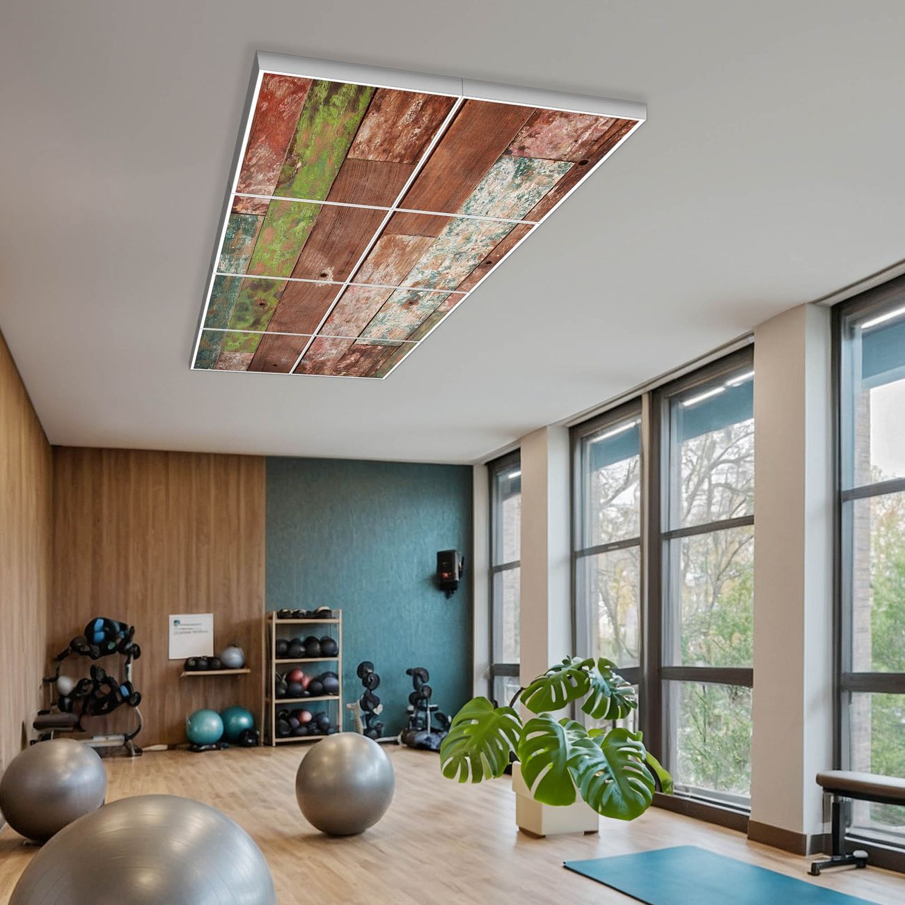 Entdecken Sie unsere vielseitigen Lichtdecken, hier in der Größe 124 x 248cm mit dem Motiv Motiv Buntes Holz - Ihre Beleuchtungslösung für jede Umgebung Beleuchten Sie Ihren Raum nicht nur, sondern schaffen Sie Atmosphäre! Die banjado Lichtdecke verwandelt jeden Ort, ob zu Hause, in Praxen, Büros oder Studios in eine Wohlfühloase. Unsere einzelnen Elemente haben eine genormte Einheitsgröße von 62 x 62cm und können somit in jede gängige Rasterdecken verbaut werden. So finden Sie Ihre passende Ausführung: Gern helfen wir Ihnen, die passende Ausführung zu wählen. Hierfür muss die aktuelle Gegebenheit Ihrer Decke oder Wand beachtet werden. Haben Sie bereits eine Rasterdecke (auch Odenwalddecke genannt)? Hier bestellen Sie lediglich das Motiv + Beleuchtungspanel, denn beides wird in die bereits vorhandene Decke eingelegt. Haben Sie eine glatte Decke mit Lichtauslass oder möchten die Lichtdecke an der Wand befestigen? Hier bestellen Sie bitte Motiv + Beleuchtungspanel + Deckenbefestigung, eine Aufbauanleitung liegt immer bei. Die Lichtdecke kann sowohl an der Decke als auch an der Wand montiert werden, perfekt für kreative Lichtakzente oder alternative Beleuchtungslösungen. Haben Sie bereits eine Lichtdecke und möchten nur das Motiv wechseln? Hier bestellen Sie bitte nur Motiv, der Wechsel ist denkbar einfach. Der Aufbau Ihrer banjado Lichtdecke gestaltet sich unkompliziert, dank einer verständlichen Anleitung, die Ihnen Schritt für Schritt durch den Montageprozess hilft. Für die endgültige Installation und den sicheren Anschluss empfehlen wir die Hinzuziehung eines Fachmanns, um die optimale Funktion und Sicherheit Ihrer Beleuchtung zu gewährleisten. Falls Sie einen Fachmann für die Installation benötigen, geben Sie uns gern Bescheid, wir vermitteln Ihnen gern einen geeigneten Ansprechpartner aus Ihrer Nähe. Steuerung: Steigern Sie Ihr Beleuchtungserlebnis mit der nahtlosen Integration in Ihr Smart Home. Durch die Kompatibilität mit der SmartLife App, Alexa und Google Assistant wird Ihr Smartphone zur zentralen Steuerungseinheit. Ihr Handy fungiert hierbei sozusagen als Fernbedienung. Legen Sie individuelle Lichtszenen in der App fest, die bei Aktivierung über den Wand-Ein-/Ausschalter immer wieder abgerufen werden können ohne Handy. Mit der Szenenfunktion in der Smart App können Sie die Beleuchtung personalisieren und steuern, sodass sie auf Ihre individuellen Bedürfnisse, Tagesrhythmus und Stimmung zugeschnitten ist. Beispielsweise können Sie sich in der Morgendämmerung durch ein sanftes Licht wecken lassen oder das Licht der Praxis werktags um 7 Uhr automatisch einschalten lassen. Dieses kann dann natürlich auch zu einer bestimmten Zeit automatisch ausgeschaltet werden. Motivwahl: Diese einzigartige Lichtdecke zeichnet sich durch ihre Fähigkeit aus, die Lichtfarbe je nach gewähltem Motiv anzupassen - ein Baum wirft ein sanftes grünes Licht, während eine Wolkendecke Ihren Raum in ein beruhigendes blaues Leuchten hüllt. Berücksichtigen Sie dies bitte bei Ihrer Motivauswahl. Sie können das Motiv jederzeit ohne großen Aufwand austauschen, ob nach Jahreszeit oder anderem Anlass, unsere Auswahl lässt kaum Wünsche offen. Wir fertigen Ihnen gern eine personalisierte Lichtdecke mit einem eigenen Motiv oder Logo oder Foto, schreiben Sie uns jederzeit an. Technische Daten: Das Motiv ist auf einer 4mm starken Acrylglas Scheibe aufgebracht, das Gesamtgewicht Ihrer Ausführung beträgt 39,4kg. Die Farbtemperatur lässt sich frei einstellen von 3000 bis 6000 Kelvin, damit können Sie stufenlos zwischen warmweiß, neutralweiß und kaltweiß wählen. Die Gesamtleistung bei Ihrer gewählten Ausführung beträgt 320W. Der Lichtstrom beträgt 3600 Lumen, die Nennspannung 230 V. Die Lichtdecke ist mit Schutzart IP20 für den Innenbereich konzipiert und sollte nicht im Nassbereich verwendet werden.