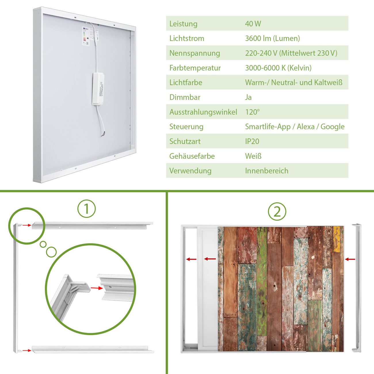 Entdecken Sie unsere vielseitigen Lichtdecken, hier in der Größe 186 x 248cm mit dem Motiv Motiv Buntes Holz - Ihre Beleuchtungslösung für jede Umgebung Beleuchten Sie Ihren Raum nicht nur, sondern schaffen Sie Atmosphäre! Die banjado Lichtdecke verwandelt jeden Ort, ob zu Hause, in Praxen, Büros oder Studios in eine Wohlfühloase. Unsere einzelnen Elemente haben eine genormte Einheitsgröße von 62 x 62cm und können somit in jede gängige Rasterdecken verbaut werden. So finden Sie Ihre passende Ausführung: Gern helfen wir Ihnen, die passende Ausführung zu wählen. Hierfür muss die aktuelle Gegebenheit Ihrer Decke oder Wand beachtet werden. Haben Sie bereits eine Rasterdecke (auch Odenwalddecke genannt)? Hier bestellen Sie lediglich das Motiv + Beleuchtungspanel, denn beides wird in die bereits vorhandene Decke eingelegt. Haben Sie eine glatte Decke mit Lichtauslass oder möchten die Lichtdecke an der Wand befestigen? Hier bestellen Sie bitte Motiv + Beleuchtungspanel + Deckenbefestigung, eine Aufbauanleitung liegt immer bei. Die Lichtdecke kann sowohl an der Decke als auch an der Wand montiert werden, perfekt für kreative Lichtakzente oder alternative Beleuchtungslösungen. Haben Sie bereits eine Lichtdecke und möchten nur das Motiv wechseln? Hier bestellen Sie bitte nur Motiv, der Wechsel ist denkbar einfach. Der Aufbau Ihrer banjado Lichtdecke gestaltet sich unkompliziert, dank einer verständlichen Anleitung, die Ihnen Schritt für Schritt durch den Montageprozess hilft. Für die endgültige Installation und den sicheren Anschluss empfehlen wir die Hinzuziehung eines Fachmanns, um die optimale Funktion und Sicherheit Ihrer Beleuchtung zu gewährleisten. Falls Sie einen Fachmann für die Installation benötigen, geben Sie uns gern Bescheid, wir vermitteln Ihnen gern einen geeigneten Ansprechpartner aus Ihrer Nähe. Steuerung: Steigern Sie Ihr Beleuchtungserlebnis mit der nahtlosen Integration in Ihr Smart Home. Durch die Kompatibilität mit der SmartLife App, Alexa und Google Assistant wird Ihr Smartphone zur zentralen Steuerungseinheit. Ihr Handy fungiert hierbei sozusagen als Fernbedienung. Legen Sie individuelle Lichtszenen in der App fest, die bei Aktivierung über den Wand-Ein-/Ausschalter immer wieder abgerufen werden können ohne Handy. Mit der Szenenfunktion in der Smart App können Sie die Beleuchtung personalisieren und steuern, sodass sie auf Ihre individuellen Bedürfnisse, Tagesrhythmus und Stimmung zugeschnitten ist. Beispielsweise können Sie sich in der Morgendämmerung durch ein sanftes Licht wecken lassen oder das Licht der Praxis werktags um 7 Uhr automatisch einschalten lassen. Dieses kann dann natürlich auch zu einer bestimmten Zeit automatisch ausgeschaltet werden. Motivwahl: Diese einzigartige Lichtdecke zeichnet sich durch ihre Fähigkeit aus, die Lichtfarbe je nach gewähltem Motiv anzupassen - ein Baum wirft ein sanftes grünes Licht, während eine Wolkendecke Ihren Raum in ein beruhigendes blaues Leuchten hüllt. Berücksichtigen Sie dies bitte bei Ihrer Motivauswahl. Sie können das Motiv jederzeit ohne großen Aufwand austauschen, ob nach Jahreszeit oder anderem Anlass, unsere Auswahl lässt kaum Wünsche offen. Wir fertigen Ihnen gern eine personalisierte Lichtdecke mit einem eigenen Motiv oder Logo oder Foto, schreiben Sie uns jederzeit an. Technische Daten: Das Motiv ist auf einer 4mm starken Acrylglas Scheibe aufgebracht, das Gesamtgewicht Ihrer Ausführung beträgt 53,1kg. Die Farbtemperatur lässt sich frei einstellen von 3000 bis 6000 Kelvin, damit können Sie stufenlos zwischen warmweiß, neutralweiß und kaltweiß wählen. Die Gesamtleistung bei Ihrer gewählten Ausführung beträgt 480W. Der Lichtstrom beträgt 3600 Lumen, die Nennspannung 230 V. Die Lichtdecke ist mit Schutzart IP20 für den Innenbereich konzipiert und sollte nicht im Nassbereich verwendet werden.