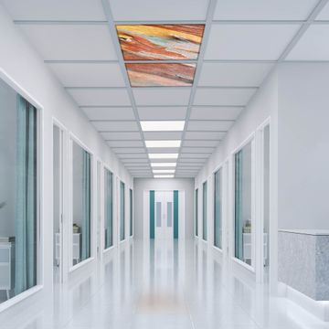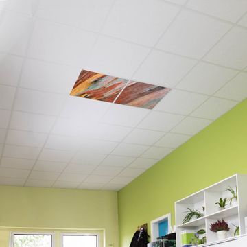 Entdecken Sie unsere vielseitigen Lichtdecken, hier in der Größe 124 x 62cm mit dem Motiv Motiv Coloured Wood - Ihre Beleuchtungslösung für jede Umgebung Beleuchten Sie Ihren Raum nicht nur, sondern schaffen Sie Atmosphäre! Die banjado Lichtdecke verwandelt jeden Ort, ob zu Hause, in Praxen, Büros oder Studios in eine Wohlfühloase. Unsere einzelnen Elemente haben eine genormte Einheitsgröße von 62 x 62cm und können somit in jede gängige Rasterdecken verbaut werden. So finden Sie Ihre passende Ausführung: Gern helfen wir Ihnen, die passende Ausführung zu wählen. Hierfür muss die aktuelle Gegebenheit Ihrer Decke oder Wand beachtet werden. Haben Sie bereits eine Rasterdecke (auch Odenwalddecke genannt)? Hier bestellen Sie lediglich das Motiv + Beleuchtungspanel, denn beides wird in die bereits vorhandene Decke eingelegt. Haben Sie eine glatte Decke mit Lichtauslass oder möchten die Lichtdecke an der Wand befestigen? Hier bestellen Sie bitte Motiv + Beleuchtungspanel + Deckenbefestigung, eine Aufbauanleitung liegt immer bei. Die Lichtdecke kann sowohl an der Decke als auch an der Wand montiert werden, perfekt für kreative Lichtakzente oder alternative Beleuchtungslösungen. Haben Sie bereits eine Lichtdecke und möchten nur das Motiv wechseln? Hier bestellen Sie bitte nur Motiv, der Wechsel ist denkbar einfach. Der Aufbau Ihrer banjado Lichtdecke gestaltet sich unkompliziert, dank einer verständlichen Anleitung, die Ihnen Schritt für Schritt durch den Montageprozess hilft. Für die endgültige Installation und den sicheren Anschluss empfehlen wir die Hinzuziehung eines Fachmanns, um die optimale Funktion und Sicherheit Ihrer Beleuchtung zu gewährleisten. Falls Sie einen Fachmann für die Installation benötigen, geben Sie uns gern Bescheid, wir vermitteln Ihnen gern einen geeigneten Ansprechpartner aus Ihrer Nähe. Steuerung: Steigern Sie Ihr Beleuchtungserlebnis mit der nahtlosen Integration in Ihr Smart Home. Durch die Kompatibilität mit der SmartLife App, Alexa und Google Assistant wird Ihr Smartphone zur zentralen Steuerungseinheit. Ihr Handy fungiert hierbei sozusagen als Fernbedienung. Legen Sie individuelle Lichtszenen in der App fest, die bei Aktivierung über den Wand-Ein-/Ausschalter immer wieder abgerufen werden können ohne Handy. Mit der Szenenfunktion in der Smart App können Sie die Beleuchtung personalisieren und steuern, sodass sie auf Ihre individuellen Bedürfnisse, Tagesrhythmus und Stimmung zugeschnitten ist. Beispielsweise können Sie sich in der Morgendämmerung durch ein sanftes Licht wecken lassen oder das Licht der Praxis werktags um 7 Uhr automatisch einschalten lassen. Dieses kann dann natürlich auch zu einer bestimmten Zeit automatisch ausgeschaltet werden. Motivwahl: Diese einzigartige Lichtdecke zeichnet sich durch ihre Fähigkeit aus, die Lichtfarbe je nach gewähltem Motiv anzupassen - ein Baum wirft ein sanftes grünes Licht, während eine Wolkendecke Ihren Raum in ein beruhigendes blaues Leuchten hüllt. Berücksichtigen Sie dies bitte bei Ihrer Motivauswahl. Sie können das Motiv jederzeit ohne großen Aufwand austauschen, ob nach Jahreszeit oder anderem Anlass, unsere Auswahl lässt kaum Wünsche offen. Wir fertigen Ihnen gern eine personalisierte Lichtdecke mit einem eigenen Motiv oder Logo oder Foto, schreiben Sie uns jederzeit an. Technische Daten: Das Motiv ist auf einer 4mm starken Acrylglas Scheibe aufgebracht, das Gesamtgewicht Ihrer Ausführung beträgt 4,5kg. Die Farbtemperatur lässt sich frei einstellen von 3000 bis 6000 Kelvin, damit können Sie stufenlos zwischen warmweiß, neutralweiß und kaltweiß wählen. Die Gesamtleistung bei Ihrer gewählten Ausführung beträgt 80W. Der Lichtstrom beträgt 3600 Lumen, die Nennspannung 230 V. Die Lichtdecke ist mit Schutzart IP20 für den Innenbereich konzipiert und sollte nicht im Nassbereich verwendet werden.