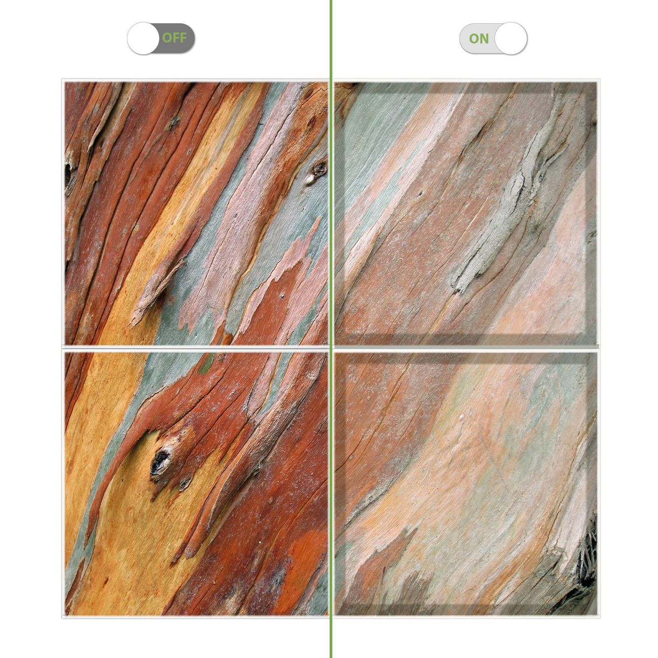 Motiv Coloured Wood Nr. 10434 Größe: 124x124x0,3cm BxHxT Gewicht: ca. 7,60 kg Material: Acylglas, hochwertig bedruckte Premiumfolie Druck: farbbrilliant, hochauflösend Stärke Glas: 4mm Acylglas Einzelelement: 62x62cm groß