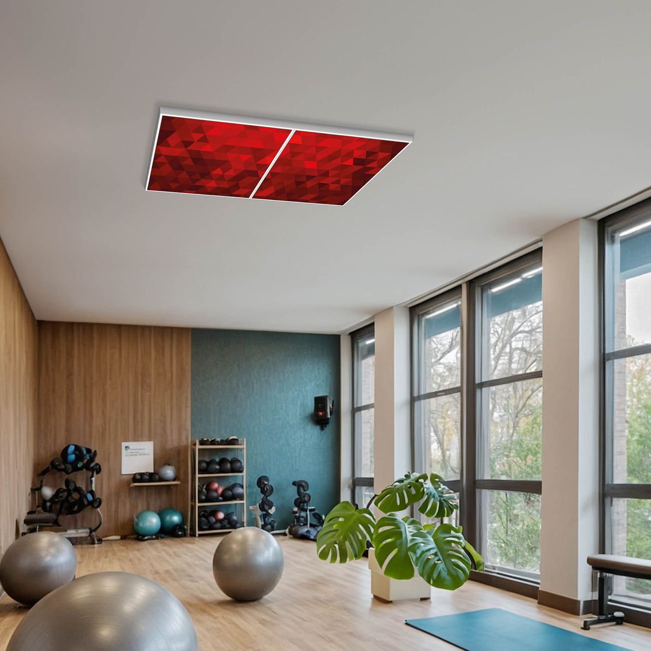 Entdecken Sie unsere vielseitigen Lichtdecken, hier in der Größe 124 x 62cm mit dem Motiv Motiv Dreiecke Rot - Ihre Beleuchtungslösung für jede Umgebung Beleuchten Sie Ihren Raum nicht nur, sondern schaffen Sie Atmosphäre! Die banjado Lichtdecke verwandelt jeden Ort, ob zu Hause, in Praxen, Büros oder Studios in eine Wohlfühloase. Unsere einzelnen Elemente haben eine genormte Einheitsgröße von 62 x 62cm und können somit in jede gängige Rasterdecken verbaut werden. So finden Sie Ihre passende Ausführung: Gern helfen wir Ihnen, die passende Ausführung zu wählen. Hierfür muss die aktuelle Gegebenheit Ihrer Decke oder Wand beachtet werden. Haben Sie bereits eine Rasterdecke (auch Odenwalddecke genannt)? Hier bestellen Sie lediglich das Motiv + Beleuchtungspanel, denn beides wird in die bereits vorhandene Decke eingelegt. Haben Sie eine glatte Decke mit Lichtauslass oder möchten die Lichtdecke an der Wand befestigen? Hier bestellen Sie bitte Motiv + Beleuchtungspanel + Deckenbefestigung, eine Aufbauanleitung liegt immer bei. Die Lichtdecke kann sowohl an der Decke als auch an der Wand montiert werden, perfekt für kreative Lichtakzente oder alternative Beleuchtungslösungen. Haben Sie bereits eine Lichtdecke und möchten nur das Motiv wechseln? Hier bestellen Sie bitte nur Motiv, der Wechsel ist denkbar einfach. Der Aufbau Ihrer banjado Lichtdecke gestaltet sich unkompliziert, dank einer verständlichen Anleitung, die Ihnen Schritt für Schritt durch den Montageprozess hilft. Für die endgültige Installation und den sicheren Anschluss empfehlen wir die Hinzuziehung eines Fachmanns, um die optimale Funktion und Sicherheit Ihrer Beleuchtung zu gewährleisten. Falls Sie einen Fachmann für die Installation benötigen, geben Sie uns gern Bescheid, wir vermitteln Ihnen gern einen geeigneten Ansprechpartner aus Ihrer Nähe. Steuerung: Steigern Sie Ihr Beleuchtungserlebnis mit der nahtlosen Integration in Ihr Smart Home. Durch die Kompatibilität mit der SmartLife App, Alexa und Google Assistant wird Ihr Smartphone zur zentralen Steuerungseinheit. Ihr Handy fungiert hierbei sozusagen als Fernbedienung. Legen Sie individuelle Lichtszenen in der App fest, die bei Aktivierung über den Wand-Ein-/Ausschalter immer wieder abgerufen werden können ohne Handy. Mit der Szenenfunktion in der Smart App können Sie die Beleuchtung personalisieren und steuern, sodass sie auf Ihre individuellen Bedürfnisse, Tagesrhythmus und Stimmung zugeschnitten ist. Beispielsweise können Sie sich in der Morgendämmerung durch ein sanftes Licht wecken lassen oder das Licht der Praxis werktags um 7 Uhr automatisch einschalten lassen. Dieses kann dann natürlich auch zu einer bestimmten Zeit automatisch ausgeschaltet werden. Motivwahl: Diese einzigartige Lichtdecke zeichnet sich durch ihre Fähigkeit aus, die Lichtfarbe je nach gewähltem Motiv anzupassen - ein Baum wirft ein sanftes grünes Licht, während eine Wolkendecke Ihren Raum in ein beruhigendes blaues Leuchten hüllt. Berücksichtigen Sie dies bitte bei Ihrer Motivauswahl. Sie können das Motiv jederzeit ohne großen Aufwand austauschen, ob nach Jahreszeit oder anderem Anlass, unsere Auswahl lässt kaum Wünsche offen. Wir fertigen Ihnen gern eine personalisierte Lichtdecke mit einem eigenen Motiv oder Logo oder Foto, schreiben Sie uns jederzeit an. Technische Daten: Das Motiv ist auf einer 4mm starken Acrylglas Scheibe aufgebracht, das Gesamtgewicht Ihrer Ausführung beträgt 9,9kg. Die Farbtemperatur lässt sich frei einstellen von 3000 bis 6000 Kelvin, damit können Sie stufenlos zwischen warmweiß, neutralweiß und kaltweiß wählen. Die Gesamtleistung bei Ihrer gewählten Ausführung beträgt 80W. Der Lichtstrom beträgt 3600 Lumen, die Nennspannung 230 V. Die Lichtdecke ist mit Schutzart IP20 für den Innenbereich konzipiert und sollte nicht im Nassbereich verwendet werden.