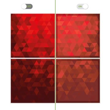 Entdecken Sie unsere vielseitigen Lichtdecken, hier in der Größe 124 x 124cm mit dem Motiv Motiv Dreiecke Rot - Ihre Beleuchtungslösung für jede Umgebung Beleuchten Sie Ihren Raum nicht nur, sondern schaffen Sie Atmosphäre! Die banjado Lichtdecke verwandelt jeden Ort, ob zu Hause, in Praxen, Büros oder Studios in eine Wohlfühloase. Unsere einzelnen Elemente haben eine genormte Einheitsgröße von 62 x 62cm und können somit in jede gängige Rasterdecken verbaut werden. So finden Sie Ihre passende Ausführung: Gern helfen wir Ihnen, die passende Ausführung zu wählen. Hierfür muss die aktuelle Gegebenheit Ihrer Decke oder Wand beachtet werden. Haben Sie bereits eine Rasterdecke (auch Odenwalddecke genannt)? Hier bestellen Sie lediglich das Motiv + Beleuchtungspanel, denn beides wird in die bereits vorhandene Decke eingelegt. Haben Sie eine glatte Decke mit Lichtauslass oder möchten die Lichtdecke an der Wand befestigen? Hier bestellen Sie bitte Motiv + Beleuchtungspanel + Deckenbefestigung, eine Aufbauanleitung liegt immer bei. Die Lichtdecke kann sowohl an der Decke als auch an der Wand montiert werden, perfekt für kreative Lichtakzente oder alternative Beleuchtungslösungen. Haben Sie bereits eine Lichtdecke und möchten nur das Motiv wechseln? Hier bestellen Sie bitte nur Motiv, der Wechsel ist denkbar einfach. Der Aufbau Ihrer banjado Lichtdecke gestaltet sich unkompliziert, dank einer verständlichen Anleitung, die Ihnen Schritt für Schritt durch den Montageprozess hilft. Für die endgültige Installation und den sicheren Anschluss empfehlen wir die Hinzuziehung eines Fachmanns, um die optimale Funktion und Sicherheit Ihrer Beleuchtung zu gewährleisten. Falls Sie einen Fachmann für die Installation benötigen, geben Sie uns gern Bescheid, wir vermitteln Ihnen gern einen geeigneten Ansprechpartner aus Ihrer Nähe. Steuerung: Steigern Sie Ihr Beleuchtungserlebnis mit der nahtlosen Integration in Ihr Smart Home. Durch die Kompatibilität mit der SmartLife App, Alexa und Google Assistant wird Ihr Smartphone zur zentralen Steuerungseinheit. Ihr Handy fungiert hierbei sozusagen als Fernbedienung. Legen Sie individuelle Lichtszenen in der App fest, die bei Aktivierung über den Wand-Ein-/Ausschalter immer wieder abgerufen werden können ohne Handy. Mit der Szenenfunktion in der Smart App können Sie die Beleuchtung personalisieren und steuern, sodass sie auf Ihre individuellen Bedürfnisse, Tagesrhythmus und Stimmung zugeschnitten ist. Beispielsweise können Sie sich in der Morgendämmerung durch ein sanftes Licht wecken lassen oder das Licht der Praxis werktags um 7 Uhr automatisch einschalten lassen. Dieses kann dann natürlich auch zu einer bestimmten Zeit automatisch ausgeschaltet werden. Motivwahl: Diese einzigartige Lichtdecke zeichnet sich durch ihre Fähigkeit aus, die Lichtfarbe je nach gewähltem Motiv anzupassen - ein Baum wirft ein sanftes grünes Licht, während eine Wolkendecke Ihren Raum in ein beruhigendes blaues Leuchten hüllt. Berücksichtigen Sie dies bitte bei Ihrer Motivauswahl. Sie können das Motiv jederzeit ohne großen Aufwand austauschen, ob nach Jahreszeit oder anderem Anlass, unsere Auswahl lässt kaum Wünsche offen. Wir fertigen Ihnen gern eine personalisierte Lichtdecke mit einem eigenen Motiv oder Logo oder Foto, schreiben Sie uns jederzeit an. Technische Daten: Das Motiv ist auf einer 4mm starken Acrylglas Scheibe aufgebracht, das Gesamtgewicht Ihrer Ausführung beträgt 17,7kg. Die Farbtemperatur lässt sich frei einstellen von 3000 bis 6000 Kelvin, damit können Sie stufenlos zwischen warmweiß, neutralweiß und kaltweiß wählen. Die Gesamtleistung bei Ihrer gewählten Ausführung beträgt 160W. Der Lichtstrom beträgt 3600 Lumen, die Nennspannung 230 V. Die Lichtdecke ist mit Schutzart IP20 für den Innenbereich konzipiert und sollte nicht im Nassbereich verwendet werden.