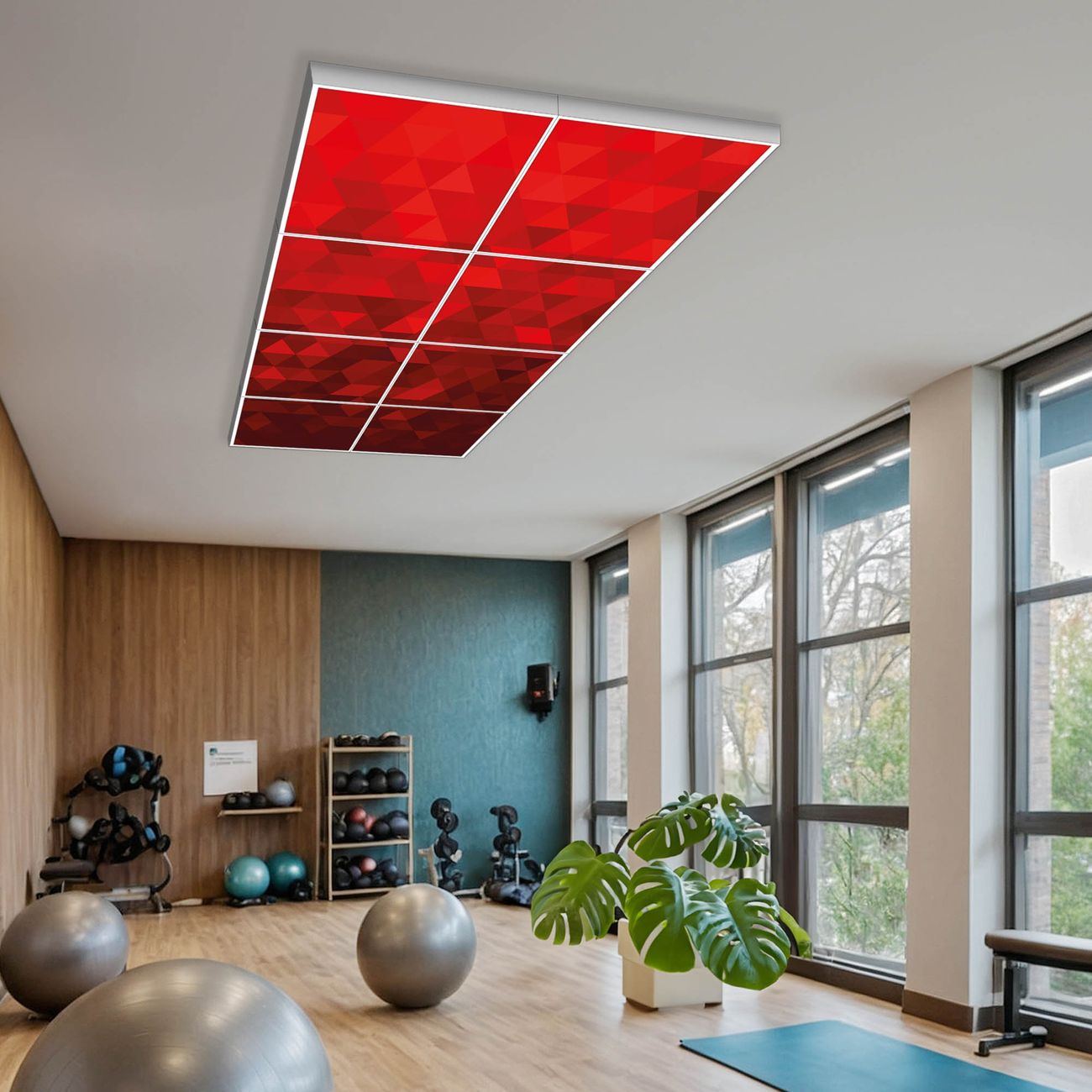 Entdecken Sie unsere vielseitigen Lichtdecken, hier in der Größe 124 x 248cm mit dem Motiv Motiv Dreiecke Rot - Ihre Beleuchtungslösung für jede Umgebung Beleuchten Sie Ihren Raum nicht nur, sondern schaffen Sie Atmosphäre! Die banjado Lichtdecke verwandelt jeden Ort, ob zu Hause, in Praxen, Büros oder Studios in eine Wohlfühloase. Unsere einzelnen Elemente haben eine genormte Einheitsgröße von 62 x 62cm und können somit in jede gängige Rasterdecken verbaut werden. So finden Sie Ihre passende Ausführung: Gern helfen wir Ihnen, die passende Ausführung zu wählen. Hierfür muss die aktuelle Gegebenheit Ihrer Decke oder Wand beachtet werden. Haben Sie bereits eine Rasterdecke (auch Odenwalddecke genannt)? Hier bestellen Sie lediglich das Motiv + Beleuchtungspanel, denn beides wird in die bereits vorhandene Decke eingelegt. Haben Sie eine glatte Decke mit Lichtauslass oder möchten die Lichtdecke an der Wand befestigen? Hier bestellen Sie bitte Motiv + Beleuchtungspanel + Deckenbefestigung, eine Aufbauanleitung liegt immer bei. Die Lichtdecke kann sowohl an der Decke als auch an der Wand montiert werden, perfekt für kreative Lichtakzente oder alternative Beleuchtungslösungen. Haben Sie bereits eine Lichtdecke und möchten nur das Motiv wechseln? Hier bestellen Sie bitte nur Motiv, der Wechsel ist denkbar einfach. Der Aufbau Ihrer banjado Lichtdecke gestaltet sich unkompliziert, dank einer verständlichen Anleitung, die Ihnen Schritt für Schritt durch den Montageprozess hilft. Für die endgültige Installation und den sicheren Anschluss empfehlen wir die Hinzuziehung eines Fachmanns, um die optimale Funktion und Sicherheit Ihrer Beleuchtung zu gewährleisten. Falls Sie einen Fachmann für die Installation benötigen, geben Sie uns gern Bescheid, wir vermitteln Ihnen gern einen geeigneten Ansprechpartner aus Ihrer Nähe. Steuerung: Steigern Sie Ihr Beleuchtungserlebnis mit der nahtlosen Integration in Ihr Smart Home. Durch die Kompatibilität mit der SmartLife App, Alexa und Google Assistant wird Ihr Smartphone zur zentralen Steuerungseinheit. Ihr Handy fungiert hierbei sozusagen als Fernbedienung. Legen Sie individuelle Lichtszenen in der App fest, die bei Aktivierung über den Wand-Ein-/Ausschalter immer wieder abgerufen werden können ohne Handy. Mit der Szenenfunktion in der Smart App können Sie die Beleuchtung personalisieren und steuern, sodass sie auf Ihre individuellen Bedürfnisse, Tagesrhythmus und Stimmung zugeschnitten ist. Beispielsweise können Sie sich in der Morgendämmerung durch ein sanftes Licht wecken lassen oder das Licht der Praxis werktags um 7 Uhr automatisch einschalten lassen. Dieses kann dann natürlich auch zu einer bestimmten Zeit automatisch ausgeschaltet werden. Motivwahl: Diese einzigartige Lichtdecke zeichnet sich durch ihre Fähigkeit aus, die Lichtfarbe je nach gewähltem Motiv anzupassen - ein Baum wirft ein sanftes grünes Licht, während eine Wolkendecke Ihren Raum in ein beruhigendes blaues Leuchten hüllt. Berücksichtigen Sie dies bitte bei Ihrer Motivauswahl. Sie können das Motiv jederzeit ohne großen Aufwand austauschen, ob nach Jahreszeit oder anderem Anlass, unsere Auswahl lässt kaum Wünsche offen. Wir fertigen Ihnen gern eine personalisierte Lichtdecke mit einem eigenen Motiv oder Logo oder Foto, schreiben Sie uns jederzeit an. Technische Daten: Das Motiv ist auf einer 4mm starken Acrylglas Scheibe aufgebracht, das Gesamtgewicht Ihrer Ausführung beträgt 39,4kg. Die Farbtemperatur lässt sich frei einstellen von 3000 bis 6000 Kelvin, damit können Sie stufenlos zwischen warmweiß, neutralweiß und kaltweiß wählen. Die Gesamtleistung bei Ihrer gewählten Ausführung beträgt 320W. Der Lichtstrom beträgt 3600 Lumen, die Nennspannung 230 V. Die Lichtdecke ist mit Schutzart IP20 für den Innenbereich konzipiert und sollte nicht im Nassbereich verwendet werden.
