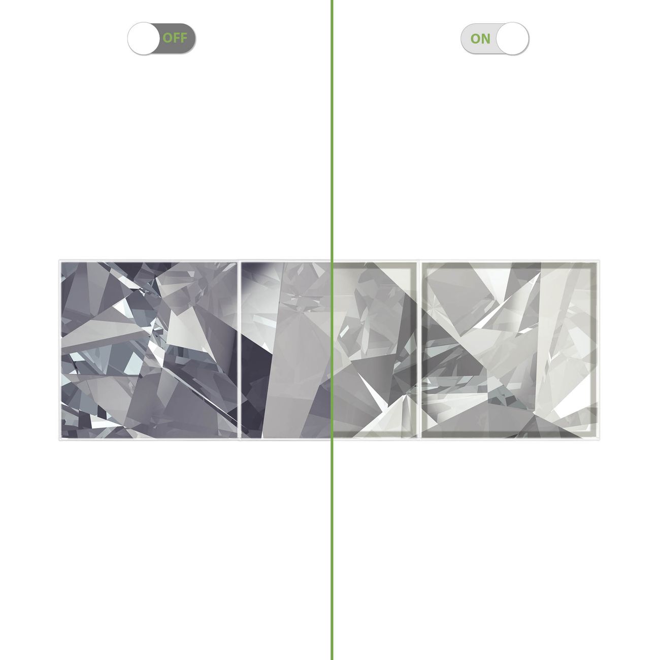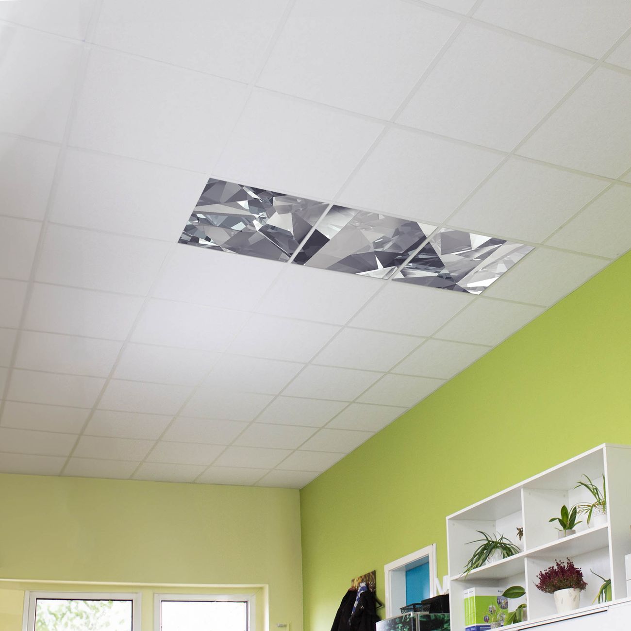 Entdecken Sie unsere vielseitigen Lichtdecken, hier in der Größe 186 x 62cm mit dem Motiv Motiv Facetten Monochrome - Ihre Beleuchtungslösung für jede Umgebung Beleuchten Sie Ihren Raum nicht nur, sondern schaffen Sie Atmosphäre! Die banjado Lichtdecke verwandelt jeden Ort, ob zu Hause, in Praxen, Büros oder Studios in eine Wohlfühloase. Unsere einzelnen Elemente haben eine genormte Einheitsgröße von 62 x 62cm und können somit in jede gängige Rasterdecken verbaut werden. So finden Sie Ihre passende Ausführung: Gern helfen wir Ihnen, die passende Ausführung zu wählen. Hierfür muss die aktuelle Gegebenheit Ihrer Decke oder Wand beachtet werden. Haben Sie bereits eine Rasterdecke (auch Odenwalddecke genannt)? Hier bestellen Sie lediglich das Motiv + Beleuchtungspanel, denn beides wird in die bereits vorhandene Decke eingelegt. Haben Sie eine glatte Decke mit Lichtauslass oder möchten die Lichtdecke an der Wand befestigen? Hier bestellen Sie bitte Motiv + Beleuchtungspanel + Deckenbefestigung, eine Aufbauanleitung liegt immer bei. Die Lichtdecke kann sowohl an der Decke als auch an der Wand montiert werden, perfekt für kreative Lichtakzente oder alternative Beleuchtungslösungen. Haben Sie bereits eine Lichtdecke und möchten nur das Motiv wechseln? Hier bestellen Sie bitte nur Motiv, der Wechsel ist denkbar einfach. Der Aufbau Ihrer banjado Lichtdecke gestaltet sich unkompliziert, dank einer verständlichen Anleitung, die Ihnen Schritt für Schritt durch den Montageprozess hilft. Für die endgültige Installation und den sicheren Anschluss empfehlen wir die Hinzuziehung eines Fachmanns, um die optimale Funktion und Sicherheit Ihrer Beleuchtung zu gewährleisten. Falls Sie einen Fachmann für die Installation benötigen, geben Sie uns gern Bescheid, wir vermitteln Ihnen gern einen geeigneten Ansprechpartner aus Ihrer Nähe. Steuerung: Steigern Sie Ihr Beleuchtungserlebnis mit der nahtlosen Integration in Ihr Smart Home. Durch die Kompatibilität mit der SmartLife App, Alexa und Google Assistant wird Ihr Smartphone zur zentralen Steuerungseinheit. Ihr Handy fungiert hierbei sozusagen als Fernbedienung. Legen Sie individuelle Lichtszenen in der App fest, die bei Aktivierung über den Wand-Ein-/Ausschalter immer wieder abgerufen werden können ohne Handy. Mit der Szenenfunktion in der Smart App können Sie die Beleuchtung personalisieren und steuern, sodass sie auf Ihre individuellen Bedürfnisse, Tagesrhythmus und Stimmung zugeschnitten ist. Beispielsweise können Sie sich in der Morgendämmerung durch ein sanftes Licht wecken lassen oder das Licht der Praxis werktags um 7 Uhr automatisch einschalten lassen. Dieses kann dann natürlich auch zu einer bestimmten Zeit automatisch ausgeschaltet werden. Motivwahl: Diese einzigartige Lichtdecke zeichnet sich durch ihre Fähigkeit aus, die Lichtfarbe je nach gewähltem Motiv anzupassen - ein Baum wirft ein sanftes grünes Licht, während eine Wolkendecke Ihren Raum in ein beruhigendes blaues Leuchten hüllt. Berücksichtigen Sie dies bitte bei Ihrer Motivauswahl. Sie können das Motiv jederzeit ohne großen Aufwand austauschen, ob nach Jahreszeit oder anderem Anlass, unsere Auswahl lässt kaum Wünsche offen. Wir fertigen Ihnen gern eine personalisierte Lichtdecke mit einem eigenen Motiv oder Logo oder Foto, schreiben Sie uns jederzeit an. Technische Daten: Das Motiv ist auf einer 4mm starken Acrylglas Scheibe aufgebracht, das Gesamtgewicht Ihrer Ausführung beträgt 6,8kg. Die Farbtemperatur lässt sich frei einstellen von 3000 bis 6000 Kelvin, damit können Sie stufenlos zwischen warmweiß, neutralweiß und kaltweiß wählen. Die Gesamtleistung bei Ihrer gewählten Ausführung beträgt 120W. Der Lichtstrom beträgt 3600 Lumen, die Nennspannung 230 V. Die Lichtdecke ist mit Schutzart IP20 für den Innenbereich konzipiert und sollte nicht im Nassbereich verwendet werden.