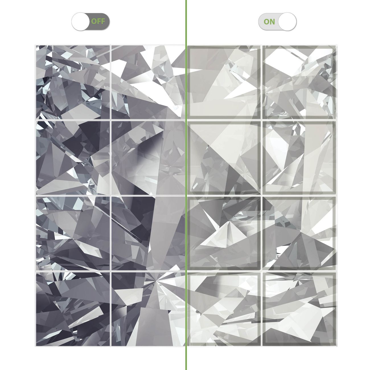 Entdecken Sie unsere vielseitigen Lichtdecken, hier in der Größe 248 x 248cm mit dem Motiv Motiv Facetten Monochrome - Ihre Beleuchtungslösung für jede Umgebung Beleuchten Sie Ihren Raum nicht nur, sondern schaffen Sie Atmosphäre! Die banjado Lichtdecke verwandelt jeden Ort, ob zu Hause, in Praxen, Büros oder Studios in eine Wohlfühloase. Unsere einzelnen Elemente haben eine genormte Einheitsgröße von 62 x 62cm und können somit in jede gängige Rasterdecken verbaut werden. So finden Sie Ihre passende Ausführung: Gern helfen wir Ihnen, die passende Ausführung zu wählen. Hierfür muss die aktuelle Gegebenheit Ihrer Decke oder Wand beachtet werden. Haben Sie bereits eine Rasterdecke (auch Odenwalddecke genannt)? Hier bestellen Sie lediglich das Motiv + Beleuchtungspanel, denn beides wird in die bereits vorhandene Decke eingelegt. Haben Sie eine glatte Decke mit Lichtauslass oder möchten die Lichtdecke an der Wand befestigen? Hier bestellen Sie bitte Motiv + Beleuchtungspanel + Deckenbefestigung, eine Aufbauanleitung liegt immer bei. Die Lichtdecke kann sowohl an der Decke als auch an der Wand montiert werden, perfekt für kreative Lichtakzente oder alternative Beleuchtungslösungen. Haben Sie bereits eine Lichtdecke und möchten nur das Motiv wechseln? Hier bestellen Sie bitte nur Motiv, der Wechsel ist denkbar einfach. Der Aufbau Ihrer banjado Lichtdecke gestaltet sich unkompliziert, dank einer verständlichen Anleitung, die Ihnen Schritt für Schritt durch den Montageprozess hilft. Für die endgültige Installation und den sicheren Anschluss empfehlen wir die Hinzuziehung eines Fachmanns, um die optimale Funktion und Sicherheit Ihrer Beleuchtung zu gewährleisten. Falls Sie einen Fachmann für die Installation benötigen, geben Sie uns gern Bescheid, wir vermitteln Ihnen gern einen geeigneten Ansprechpartner aus Ihrer Nähe. Steuerung: Steigern Sie Ihr Beleuchtungserlebnis mit der nahtlosen Integration in Ihr Smart Home. Durch die Kompatibilität mit der SmartLife App, Alexa und Google Assistant wird Ihr Smartphone zur zentralen Steuerungseinheit. Ihr Handy fungiert hierbei sozusagen als Fernbedienung. Legen Sie individuelle Lichtszenen in der App fest, die bei Aktivierung über den Wand-Ein-/Ausschalter immer wieder abgerufen werden können ohne Handy. Mit der Szenenfunktion in der Smart App können Sie die Beleuchtung personalisieren und steuern, sodass sie auf Ihre individuellen Bedürfnisse, Tagesrhythmus und Stimmung zugeschnitten ist. Beispielsweise können Sie sich in der Morgendämmerung durch ein sanftes Licht wecken lassen oder das Licht der Praxis werktags um 7 Uhr automatisch einschalten lassen. Dieses kann dann natürlich auch zu einer bestimmten Zeit automatisch ausgeschaltet werden. Motivwahl: Diese einzigartige Lichtdecke zeichnet sich durch ihre Fähigkeit aus, die Lichtfarbe je nach gewähltem Motiv anzupassen - ein Baum wirft ein sanftes grünes Licht, während eine Wolkendecke Ihren Raum in ein beruhigendes blaues Leuchten hüllt. Berücksichtigen Sie dies bitte bei Ihrer Motivauswahl. Sie können das Motiv jederzeit ohne großen Aufwand austauschen, ob nach Jahreszeit oder anderem Anlass, unsere Auswahl lässt kaum Wünsche offen. Wir fertigen Ihnen gern eine personalisierte Lichtdecke mit einem eigenen Motiv oder Logo oder Foto, schreiben Sie uns jederzeit an. Technische Daten: Das Motiv ist auf einer 4mm starken Acrylglas Scheibe aufgebracht, das Gesamtgewicht Ihrer Ausführung beträgt 78,9kg. Die Farbtemperatur lässt sich frei einstellen von 3000 bis 6000 Kelvin, damit können Sie stufenlos zwischen warmweiß, neutralweiß und kaltweiß wählen. Die Gesamtleistung bei Ihrer gewählten Ausführung beträgt 640W. Der Lichtstrom beträgt 3600 Lumen, die Nennspannung 230 V. Die Lichtdecke ist mit Schutzart IP20 für den Innenbereich konzipiert und sollte nicht im Nassbereich verwendet werden.