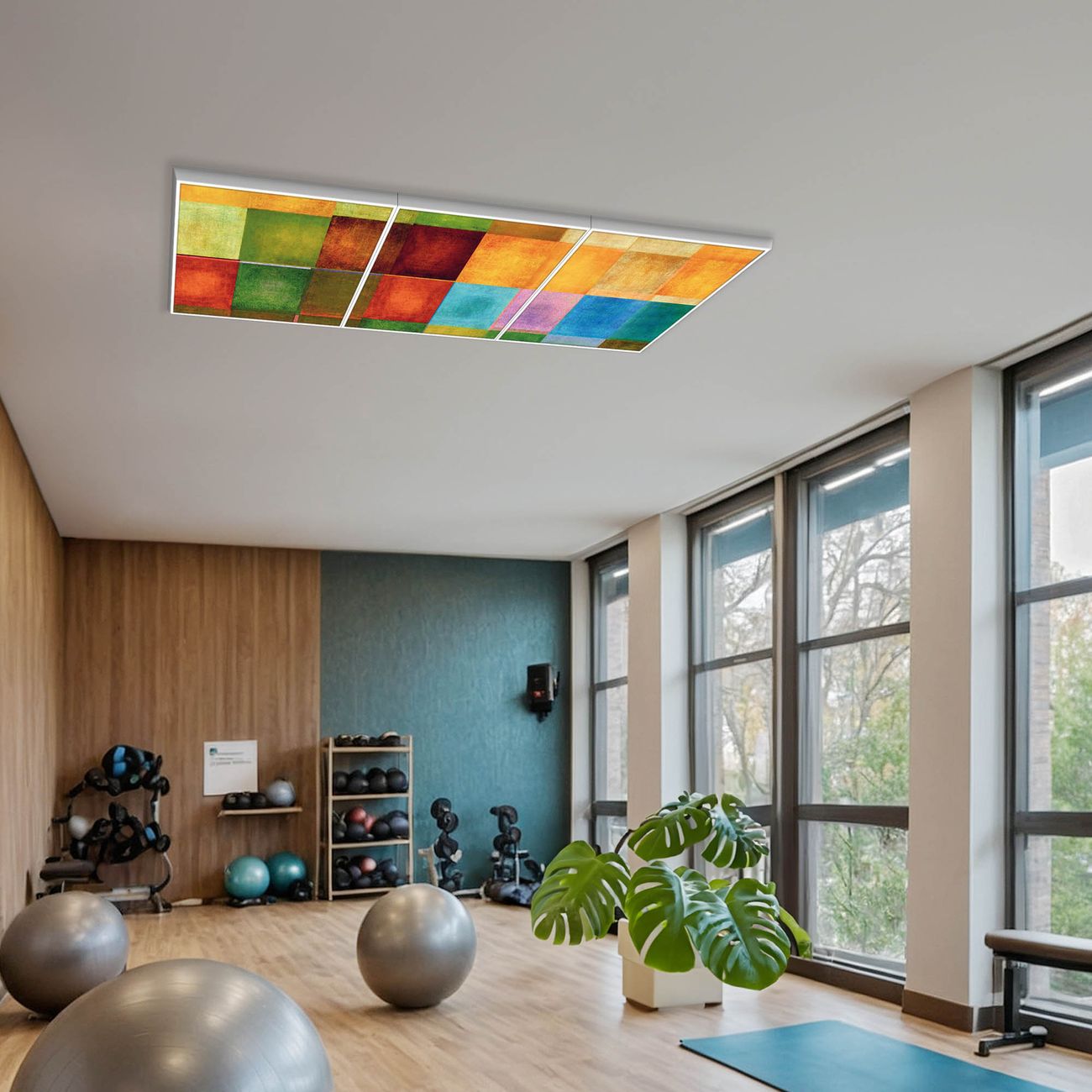 Entdecken Sie unsere vielseitigen Lichtdecken, hier in der Größe 186 x 62cm mit dem Motiv Motiv Farbkasten 2 - Ihre Beleuchtungslösung für jede Umgebung Beleuchten Sie Ihren Raum nicht nur, sondern schaffen Sie Atmosphäre! Die banjado Lichtdecke verwandelt jeden Ort, ob zu Hause, in Praxen, Büros oder Studios in eine Wohlfühloase. Unsere einzelnen Elemente haben eine genormte Einheitsgröße von 62 x 62cm und können somit in jede gängige Rasterdecken verbaut werden. So finden Sie Ihre passende Ausführung: Gern helfen wir Ihnen, die passende Ausführung zu wählen. Hierfür muss die aktuelle Gegebenheit Ihrer Decke oder Wand beachtet werden. Haben Sie bereits eine Rasterdecke (auch Odenwalddecke genannt)? Hier bestellen Sie lediglich das Motiv + Beleuchtungspanel, denn beides wird in die bereits vorhandene Decke eingelegt. Haben Sie eine glatte Decke mit Lichtauslass oder möchten die Lichtdecke an der Wand befestigen? Hier bestellen Sie bitte Motiv + Beleuchtungspanel + Deckenbefestigung, eine Aufbauanleitung liegt immer bei. Die Lichtdecke kann sowohl an der Decke als auch an der Wand montiert werden, perfekt für kreative Lichtakzente oder alternative Beleuchtungslösungen. Haben Sie bereits eine Lichtdecke und möchten nur das Motiv wechseln? Hier bestellen Sie bitte nur Motiv, der Wechsel ist denkbar einfach. Der Aufbau Ihrer banjado Lichtdecke gestaltet sich unkompliziert, dank einer verständlichen Anleitung, die Ihnen Schritt für Schritt durch den Montageprozess hilft. Für die endgültige Installation und den sicheren Anschluss empfehlen wir die Hinzuziehung eines Fachmanns, um die optimale Funktion und Sicherheit Ihrer Beleuchtung zu gewährleisten. Falls Sie einen Fachmann für die Installation benötigen, geben Sie uns gern Bescheid, wir vermitteln Ihnen gern einen geeigneten Ansprechpartner aus Ihrer Nähe. Steuerung: Steigern Sie Ihr Beleuchtungserlebnis mit der nahtlosen Integration in Ihr Smart Home. Durch die Kompatibilität mit der SmartLife App, Alexa und Google Assistant wird Ihr Smartphone zur zentralen Steuerungseinheit. Ihr Handy fungiert hierbei sozusagen als Fernbedienung. Legen Sie individuelle Lichtszenen in der App fest, die bei Aktivierung über den Wand-Ein-/Ausschalter immer wieder abgerufen werden können ohne Handy. Mit der Szenenfunktion in der Smart App können Sie die Beleuchtung personalisieren und steuern, sodass sie auf Ihre individuellen Bedürfnisse, Tagesrhythmus und Stimmung zugeschnitten ist. Beispielsweise können Sie sich in der Morgendämmerung durch ein sanftes Licht wecken lassen oder das Licht der Praxis werktags um 7 Uhr automatisch einschalten lassen. Dieses kann dann natürlich auch zu einer bestimmten Zeit automatisch ausgeschaltet werden. Motivwahl: Diese einzigartige Lichtdecke zeichnet sich durch ihre Fähigkeit aus, die Lichtfarbe je nach gewähltem Motiv anzupassen - ein Baum wirft ein sanftes grünes Licht, während eine Wolkendecke Ihren Raum in ein beruhigendes blaues Leuchten hüllt. Berücksichtigen Sie dies bitte bei Ihrer Motivauswahl. Sie können das Motiv jederzeit ohne großen Aufwand austauschen, ob nach Jahreszeit oder anderem Anlass, unsere Auswahl lässt kaum Wünsche offen. Wir fertigen Ihnen gern eine personalisierte Lichtdecke mit einem eigenen Motiv oder Logo oder Foto, schreiben Sie uns jederzeit an. Technische Daten: Das Motiv ist auf einer 4mm starken Acrylglas Scheibe aufgebracht, das Gesamtgewicht Ihrer Ausführung beträgt 14,8kg. Die Farbtemperatur lässt sich frei einstellen von 3000 bis 6000 Kelvin, damit können Sie stufenlos zwischen warmweiß, neutralweiß und kaltweiß wählen. Die Gesamtleistung bei Ihrer gewählten Ausführung beträgt 120W. Der Lichtstrom beträgt 3600 Lumen, die Nennspannung 230 V. Die Lichtdecke ist mit Schutzart IP20 für den Innenbereich konzipiert und sollte nicht im Nassbereich verwendet werden.