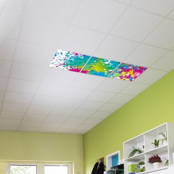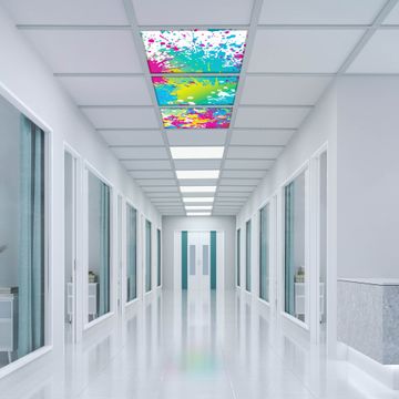 Entdecken Sie unsere vielseitigen Lichtdecken, hier in der Größe 186 x 62cm mit dem Motiv Motiv Farbspritzer - Ihre Beleuchtungslösung für jede Umgebung Beleuchten Sie Ihren Raum nicht nur, sondern schaffen Sie Atmosphäre! Die banjado Lichtdecke verwandelt jeden Ort, ob zu Hause, in Praxen, Büros oder Studios in eine Wohlfühloase. Unsere einzelnen Elemente haben eine genormte Einheitsgröße von 62 x 62cm und können somit in jede gängige Rasterdecken verbaut werden. So finden Sie Ihre passende Ausführung: Gern helfen wir Ihnen, die passende Ausführung zu wählen. Hierfür muss die aktuelle Gegebenheit Ihrer Decke oder Wand beachtet werden. Haben Sie bereits eine Rasterdecke (auch Odenwalddecke genannt)? Hier bestellen Sie lediglich das Motiv + Beleuchtungspanel, denn beides wird in die bereits vorhandene Decke eingelegt. Haben Sie eine glatte Decke mit Lichtauslass oder möchten die Lichtdecke an der Wand befestigen? Hier bestellen Sie bitte Motiv + Beleuchtungspanel + Deckenbefestigung, eine Aufbauanleitung liegt immer bei. Die Lichtdecke kann sowohl an der Decke als auch an der Wand montiert werden, perfekt für kreative Lichtakzente oder alternative Beleuchtungslösungen. Haben Sie bereits eine Lichtdecke und möchten nur das Motiv wechseln? Hier bestellen Sie bitte nur Motiv, der Wechsel ist denkbar einfach. Der Aufbau Ihrer banjado Lichtdecke gestaltet sich unkompliziert, dank einer verständlichen Anleitung, die Ihnen Schritt für Schritt durch den Montageprozess hilft. Für die endgültige Installation und den sicheren Anschluss empfehlen wir die Hinzuziehung eines Fachmanns, um die optimale Funktion und Sicherheit Ihrer Beleuchtung zu gewährleisten. Falls Sie einen Fachmann für die Installation benötigen, geben Sie uns gern Bescheid, wir vermitteln Ihnen gern einen geeigneten Ansprechpartner aus Ihrer Nähe. Steuerung: Steigern Sie Ihr Beleuchtungserlebnis mit der nahtlosen Integration in Ihr Smart Home. Durch die Kompatibilität mit der SmartLife App, Alexa und Google Assistant wird Ihr Smartphone zur zentralen Steuerungseinheit. Ihr Handy fungiert hierbei sozusagen als Fernbedienung. Legen Sie individuelle Lichtszenen in der App fest, die bei Aktivierung über den Wand-Ein-/Ausschalter immer wieder abgerufen werden können ohne Handy. Mit der Szenenfunktion in der Smart App können Sie die Beleuchtung personalisieren und steuern, sodass sie auf Ihre individuellen Bedürfnisse, Tagesrhythmus und Stimmung zugeschnitten ist. Beispielsweise können Sie sich in der Morgendämmerung durch ein sanftes Licht wecken lassen oder das Licht der Praxis werktags um 7 Uhr automatisch einschalten lassen. Dieses kann dann natürlich auch zu einer bestimmten Zeit automatisch ausgeschaltet werden. Motivwahl: Diese einzigartige Lichtdecke zeichnet sich durch ihre Fähigkeit aus, die Lichtfarbe je nach gewähltem Motiv anzupassen - ein Baum wirft ein sanftes grünes Licht, während eine Wolkendecke Ihren Raum in ein beruhigendes blaues Leuchten hüllt. Berücksichtigen Sie dies bitte bei Ihrer Motivauswahl. Sie können das Motiv jederzeit ohne großen Aufwand austauschen, ob nach Jahreszeit oder anderem Anlass, unsere Auswahl lässt kaum Wünsche offen. Wir fertigen Ihnen gern eine personalisierte Lichtdecke mit einem eigenen Motiv oder Logo oder Foto, schreiben Sie uns jederzeit an. Technische Daten: Das Motiv ist auf einer 4mm starken Acrylglas Scheibe aufgebracht, das Gesamtgewicht Ihrer Ausführung beträgt 6,8kg. Die Farbtemperatur lässt sich frei einstellen von 3000 bis 6000 Kelvin, damit können Sie stufenlos zwischen warmweiß, neutralweiß und kaltweiß wählen. Die Gesamtleistung bei Ihrer gewählten Ausführung beträgt 120W. Der Lichtstrom beträgt 3600 Lumen, die Nennspannung 230 V. Die Lichtdecke ist mit Schutzart IP20 für den Innenbereich konzipiert und sollte nicht im Nassbereich verwendet werden.