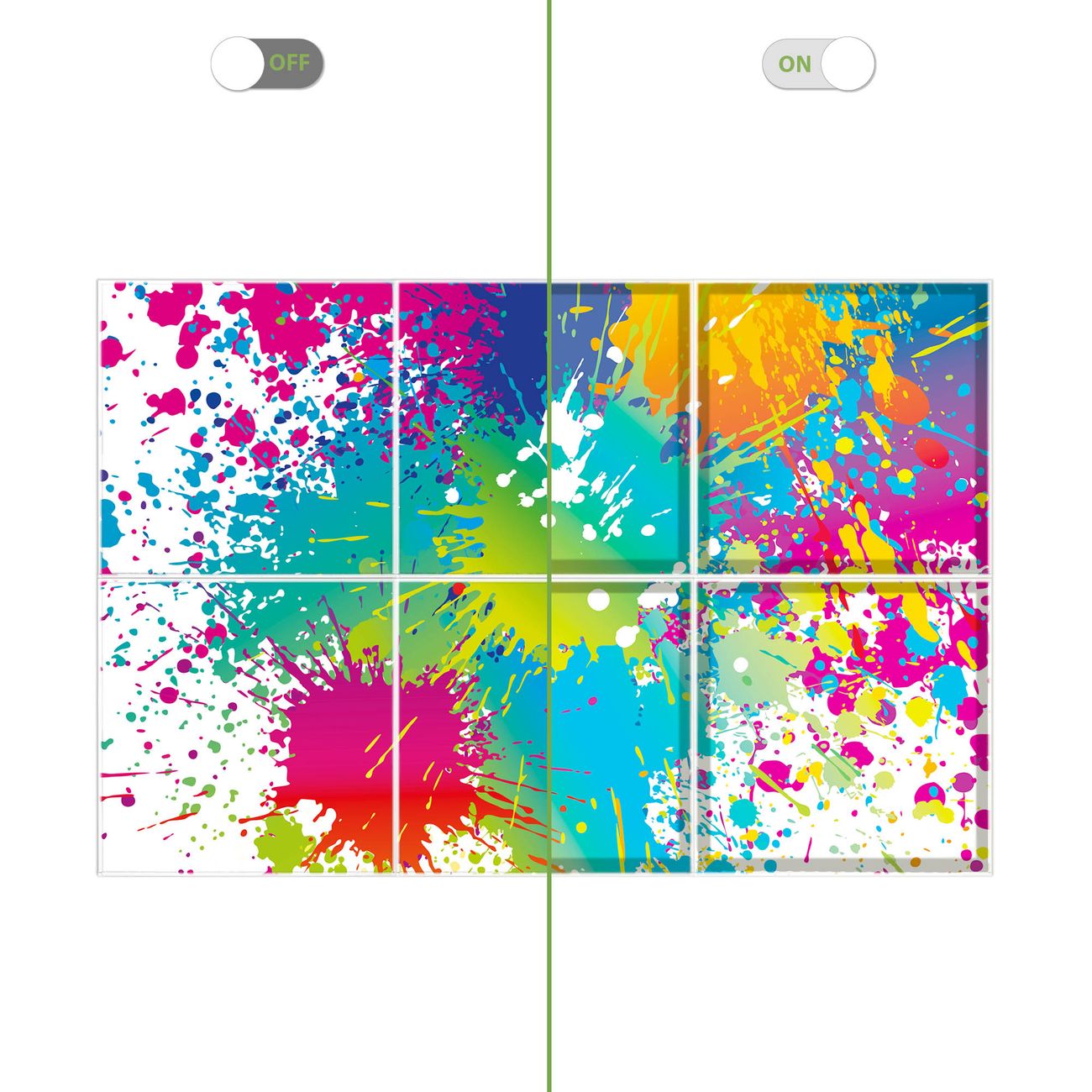 Entdecken Sie unsere vielseitigen Lichtdecken, hier in der Größe 186 x 124cm mit dem Motiv Motiv Farbspritzer - Ihre Beleuchtungslösung für jede Umgebung Beleuchten Sie Ihren Raum nicht nur, sondern schaffen Sie Atmosphäre! Die banjado Lichtdecke verwandelt jeden Ort, ob zu Hause, in Praxen, Büros oder Studios in eine Wohlfühloase. Unsere einzelnen Elemente haben eine genormte Einheitsgröße von 62 x 62cm und können somit in jede gängige Rasterdecken verbaut werden. So finden Sie Ihre passende Ausführung: Gern helfen wir Ihnen, die passende Ausführung zu wählen. Hierfür muss die aktuelle Gegebenheit Ihrer Decke oder Wand beachtet werden. Haben Sie bereits eine Rasterdecke (auch Odenwalddecke genannt)? Hier bestellen Sie lediglich das Motiv + Beleuchtungspanel, denn beides wird in die bereits vorhandene Decke eingelegt. Haben Sie eine glatte Decke mit Lichtauslass oder möchten die Lichtdecke an der Wand befestigen? Hier bestellen Sie bitte Motiv + Beleuchtungspanel + Deckenbefestigung, eine Aufbauanleitung liegt immer bei. Die Lichtdecke kann sowohl an der Decke als auch an der Wand montiert werden, perfekt für kreative Lichtakzente oder alternative Beleuchtungslösungen. Haben Sie bereits eine Lichtdecke und möchten nur das Motiv wechseln? Hier bestellen Sie bitte nur Motiv, der Wechsel ist denkbar einfach. Der Aufbau Ihrer banjado Lichtdecke gestaltet sich unkompliziert, dank einer verständlichen Anleitung, die Ihnen Schritt für Schritt durch den Montageprozess hilft. Für die endgültige Installation und den sicheren Anschluss empfehlen wir die Hinzuziehung eines Fachmanns, um die optimale Funktion und Sicherheit Ihrer Beleuchtung zu gewährleisten. Falls Sie einen Fachmann für die Installation benötigen, geben Sie uns gern Bescheid, wir vermitteln Ihnen gern einen geeigneten Ansprechpartner aus Ihrer Nähe. Steuerung: Steigern Sie Ihr Beleuchtungserlebnis mit der nahtlosen Integration in Ihr Smart Home. Durch die Kompatibilität mit der SmartLife App, Alexa und Google Assistant wird Ihr Smartphone zur zentralen Steuerungseinheit. Ihr Handy fungiert hierbei sozusagen als Fernbedienung. Legen Sie individuelle Lichtszenen in der App fest, die bei Aktivierung über den Wand-Ein-/Ausschalter immer wieder abgerufen werden können ohne Handy. Mit der Szenenfunktion in der Smart App können Sie die Beleuchtung personalisieren und steuern, sodass sie auf Ihre individuellen Bedürfnisse, Tagesrhythmus und Stimmung zugeschnitten ist. Beispielsweise können Sie sich in der Morgendämmerung durch ein sanftes Licht wecken lassen oder das Licht der Praxis werktags um 7 Uhr automatisch einschalten lassen. Dieses kann dann natürlich auch zu einer bestimmten Zeit automatisch ausgeschaltet werden. Motivwahl: Diese einzigartige Lichtdecke zeichnet sich durch ihre Fähigkeit aus, die Lichtfarbe je nach gewähltem Motiv anzupassen - ein Baum wirft ein sanftes grünes Licht, während eine Wolkendecke Ihren Raum in ein beruhigendes blaues Leuchten hüllt. Berücksichtigen Sie dies bitte bei Ihrer Motivauswahl. Sie können das Motiv jederzeit ohne großen Aufwand austauschen, ob nach Jahreszeit oder anderem Anlass, unsere Auswahl lässt kaum Wünsche offen. Wir fertigen Ihnen gern eine personalisierte Lichtdecke mit einem eigenen Motiv oder Logo oder Foto, schreiben Sie uns jederzeit an. Technische Daten: Das Motiv ist auf einer 4mm starken Acrylglas Scheibe aufgebracht, das Gesamtgewicht Ihrer Ausführung beträgt 13,6kg. Die Farbtemperatur lässt sich frei einstellen von 3000 bis 6000 Kelvin, damit können Sie stufenlos zwischen warmweiß, neutralweiß und kaltweiß wählen. Die Gesamtleistung bei Ihrer gewählten Ausführung beträgt 240W. Der Lichtstrom beträgt 3600 Lumen, die Nennspannung 230 V. Die Lichtdecke ist mit Schutzart IP20 für den Innenbereich konzipiert und sollte nicht im Nassbereich verwendet werden.