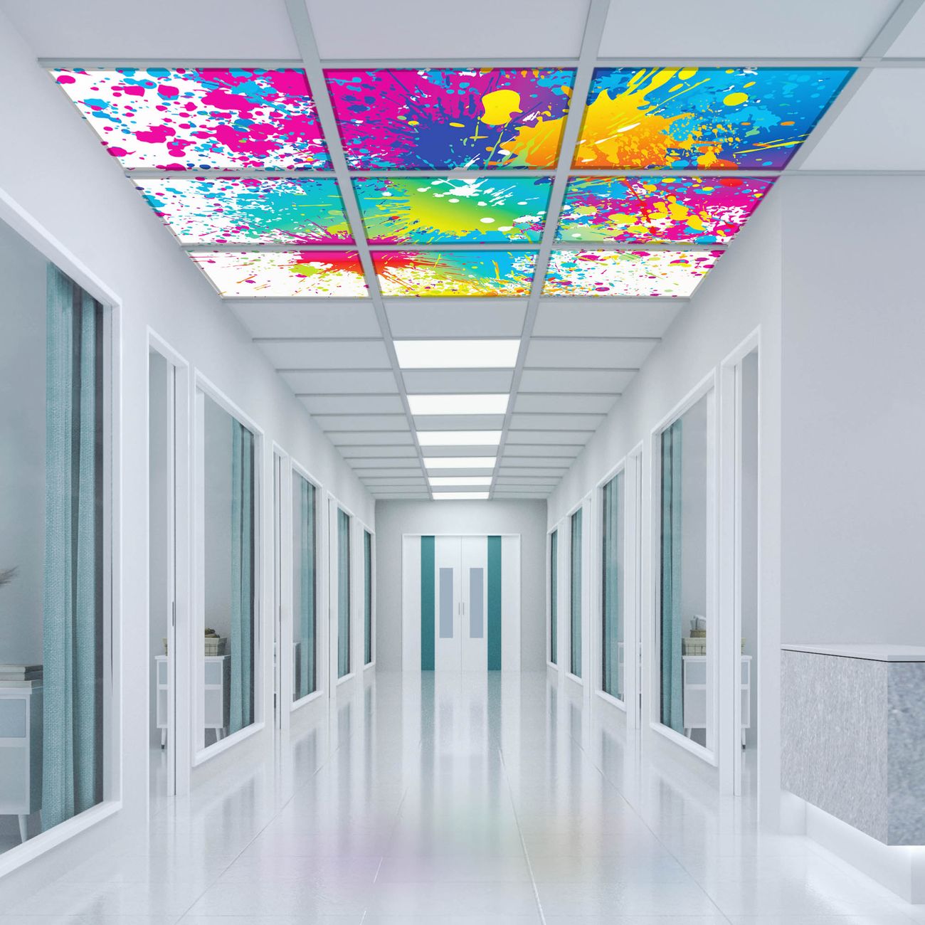 Entdecken Sie unsere vielseitigen Lichtdecken, hier in der Größe 186 x 186cm mit dem Motiv Motiv Farbspritzer - Ihre Beleuchtungslösung für jede Umgebung Beleuchten Sie Ihren Raum nicht nur, sondern schaffen Sie Atmosphäre! Die banjado Lichtdecke verwandelt jeden Ort, ob zu Hause, in Praxen, Büros oder Studios in eine Wohlfühloase. Unsere einzelnen Elemente haben eine genormte Einheitsgröße von 62 x 62cm und können somit in jede gängige Rasterdecken verbaut werden. So finden Sie Ihre passende Ausführung: Gern helfen wir Ihnen, die passende Ausführung zu wählen. Hierfür muss die aktuelle Gegebenheit Ihrer Decke oder Wand beachtet werden. Haben Sie bereits eine Rasterdecke (auch Odenwalddecke genannt)? Hier bestellen Sie lediglich das Motiv + Beleuchtungspanel, denn beides wird in die bereits vorhandene Decke eingelegt. Haben Sie eine glatte Decke mit Lichtauslass oder möchten die Lichtdecke an der Wand befestigen? Hier bestellen Sie bitte Motiv + Beleuchtungspanel + Deckenbefestigung, eine Aufbauanleitung liegt immer bei. Die Lichtdecke kann sowohl an der Decke als auch an der Wand montiert werden, perfekt für kreative Lichtakzente oder alternative Beleuchtungslösungen. Haben Sie bereits eine Lichtdecke und möchten nur das Motiv wechseln? Hier bestellen Sie bitte nur Motiv, der Wechsel ist denkbar einfach. Der Aufbau Ihrer banjado Lichtdecke gestaltet sich unkompliziert, dank einer verständlichen Anleitung, die Ihnen Schritt für Schritt durch den Montageprozess hilft. Für die endgültige Installation und den sicheren Anschluss empfehlen wir die Hinzuziehung eines Fachmanns, um die optimale Funktion und Sicherheit Ihrer Beleuchtung zu gewährleisten. Falls Sie einen Fachmann für die Installation benötigen, geben Sie uns gern Bescheid, wir vermitteln Ihnen gern einen geeigneten Ansprechpartner aus Ihrer Nähe. Steuerung: Steigern Sie Ihr Beleuchtungserlebnis mit der nahtlosen Integration in Ihr Smart Home. Durch die Kompatibilität mit der SmartLife App, Alexa und Google Assistant wird Ihr Smartphone zur zentralen Steuerungseinheit. Ihr Handy fungiert hierbei sozusagen als Fernbedienung. Legen Sie individuelle Lichtszenen in der App fest, die bei Aktivierung über den Wand-Ein-/Ausschalter immer wieder abgerufen werden können ohne Handy. Mit der Szenenfunktion in der Smart App können Sie die Beleuchtung personalisieren und steuern, sodass sie auf Ihre individuellen Bedürfnisse, Tagesrhythmus und Stimmung zugeschnitten ist. Beispielsweise können Sie sich in der Morgendämmerung durch ein sanftes Licht wecken lassen oder das Licht der Praxis werktags um 7 Uhr automatisch einschalten lassen. Dieses kann dann natürlich auch zu einer bestimmten Zeit automatisch ausgeschaltet werden. Motivwahl: Diese einzigartige Lichtdecke zeichnet sich durch ihre Fähigkeit aus, die Lichtfarbe je nach gewähltem Motiv anzupassen - ein Baum wirft ein sanftes grünes Licht, während eine Wolkendecke Ihren Raum in ein beruhigendes blaues Leuchten hüllt. Berücksichtigen Sie dies bitte bei Ihrer Motivauswahl. Sie können das Motiv jederzeit ohne großen Aufwand austauschen, ob nach Jahreszeit oder anderem Anlass, unsere Auswahl lässt kaum Wünsche offen. Wir fertigen Ihnen gern eine personalisierte Lichtdecke mit einem eigenen Motiv oder Logo oder Foto, schreiben Sie uns jederzeit an. Technische Daten: Das Motiv ist auf einer 4mm starken Acrylglas Scheibe aufgebracht, das Gesamtgewicht Ihrer Ausführung beträgt 39,9kg. Die Farbtemperatur lässt sich frei einstellen von 3000 bis 6000 Kelvin, damit können Sie stufenlos zwischen warmweiß, neutralweiß und kaltweiß wählen. Die Gesamtleistung bei Ihrer gewählten Ausführung beträgt 360W. Der Lichtstrom beträgt 3600 Lumen, die Nennspannung 230 V. Die Lichtdecke ist mit Schutzart IP20 für den Innenbereich konzipiert und sollte nicht im Nassbereich verwendet werden.