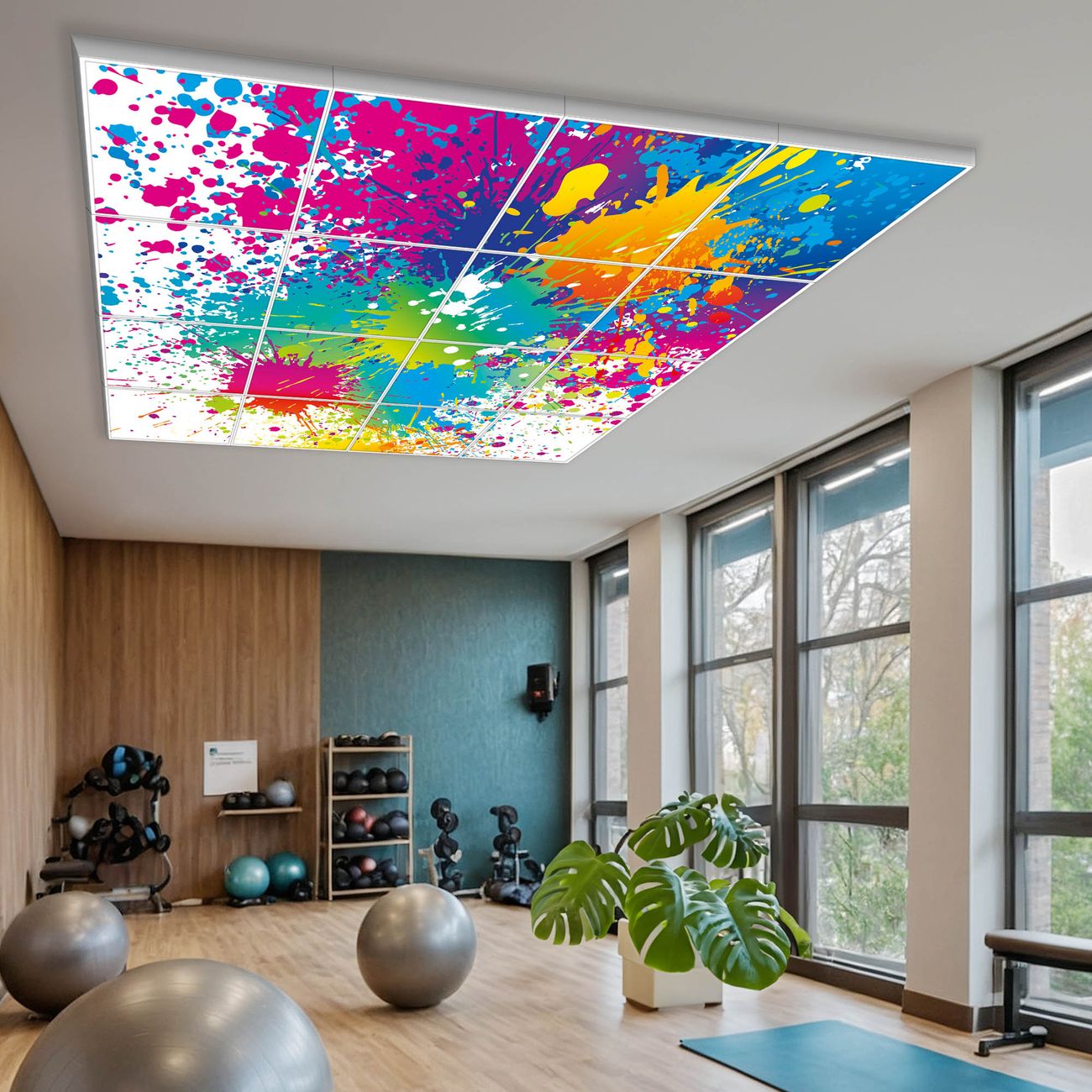 Entdecken Sie unsere vielseitigen Lichtdecken, hier in der Größe 248 x 248cm mit dem Motiv Motiv Farbspritzer - Ihre Beleuchtungslösung für jede Umgebung Beleuchten Sie Ihren Raum nicht nur, sondern schaffen Sie Atmosphäre! Die banjado Lichtdecke verwandelt jeden Ort, ob zu Hause, in Praxen, Büros oder Studios in eine Wohlfühloase. Unsere einzelnen Elemente haben eine genormte Einheitsgröße von 62 x 62cm und können somit in jede gängige Rasterdecken verbaut werden. So finden Sie Ihre passende Ausführung: Gern helfen wir Ihnen, die passende Ausführung zu wählen. Hierfür muss die aktuelle Gegebenheit Ihrer Decke oder Wand beachtet werden. Haben Sie bereits eine Rasterdecke (auch Odenwalddecke genannt)? Hier bestellen Sie lediglich das Motiv + Beleuchtungspanel, denn beides wird in die bereits vorhandene Decke eingelegt. Haben Sie eine glatte Decke mit Lichtauslass oder möchten die Lichtdecke an der Wand befestigen? Hier bestellen Sie bitte Motiv + Beleuchtungspanel + Deckenbefestigung, eine Aufbauanleitung liegt immer bei. Die Lichtdecke kann sowohl an der Decke als auch an der Wand montiert werden, perfekt für kreative Lichtakzente oder alternative Beleuchtungslösungen. Haben Sie bereits eine Lichtdecke und möchten nur das Motiv wechseln? Hier bestellen Sie bitte nur Motiv, der Wechsel ist denkbar einfach. Der Aufbau Ihrer banjado Lichtdecke gestaltet sich unkompliziert, dank einer verständlichen Anleitung, die Ihnen Schritt für Schritt durch den Montageprozess hilft. Für die endgültige Installation und den sicheren Anschluss empfehlen wir die Hinzuziehung eines Fachmanns, um die optimale Funktion und Sicherheit Ihrer Beleuchtung zu gewährleisten. Falls Sie einen Fachmann für die Installation benötigen, geben Sie uns gern Bescheid, wir vermitteln Ihnen gern einen geeigneten Ansprechpartner aus Ihrer Nähe. Steuerung: Steigern Sie Ihr Beleuchtungserlebnis mit der nahtlosen Integration in Ihr Smart Home. Durch die Kompatibilität mit der SmartLife App, Alexa und Google Assistant wird Ihr Smartphone zur zentralen Steuerungseinheit. Ihr Handy fungiert hierbei sozusagen als Fernbedienung. Legen Sie individuelle Lichtszenen in der App fest, die bei Aktivierung über den Wand-Ein-/Ausschalter immer wieder abgerufen werden können ohne Handy. Mit der Szenenfunktion in der Smart App können Sie die Beleuchtung personalisieren und steuern, sodass sie auf Ihre individuellen Bedürfnisse, Tagesrhythmus und Stimmung zugeschnitten ist. Beispielsweise können Sie sich in der Morgendämmerung durch ein sanftes Licht wecken lassen oder das Licht der Praxis werktags um 7 Uhr automatisch einschalten lassen. Dieses kann dann natürlich auch zu einer bestimmten Zeit automatisch ausgeschaltet werden. Motivwahl: Diese einzigartige Lichtdecke zeichnet sich durch ihre Fähigkeit aus, die Lichtfarbe je nach gewähltem Motiv anzupassen - ein Baum wirft ein sanftes grünes Licht, während eine Wolkendecke Ihren Raum in ein beruhigendes blaues Leuchten hüllt. Berücksichtigen Sie dies bitte bei Ihrer Motivauswahl. Sie können das Motiv jederzeit ohne großen Aufwand austauschen, ob nach Jahreszeit oder anderem Anlass, unsere Auswahl lässt kaum Wünsche offen. Wir fertigen Ihnen gern eine personalisierte Lichtdecke mit einem eigenen Motiv oder Logo oder Foto, schreiben Sie uns jederzeit an. Technische Daten: Das Motiv ist auf einer 4mm starken Acrylglas Scheibe aufgebracht, das Gesamtgewicht Ihrer Ausführung beträgt 78,9kg. Die Farbtemperatur lässt sich frei einstellen von 3000 bis 6000 Kelvin, damit können Sie stufenlos zwischen warmweiß, neutralweiß und kaltweiß wählen. Die Gesamtleistung bei Ihrer gewählten Ausführung beträgt 640W. Der Lichtstrom beträgt 3600 Lumen, die Nennspannung 230 V. Die Lichtdecke ist mit Schutzart IP20 für den Innenbereich konzipiert und sollte nicht im Nassbereich verwendet werden.