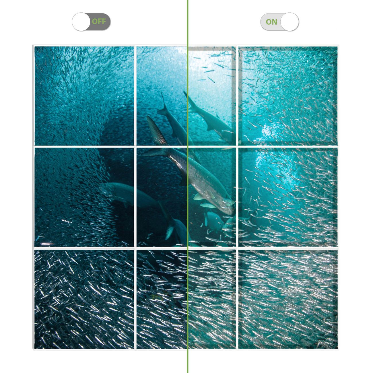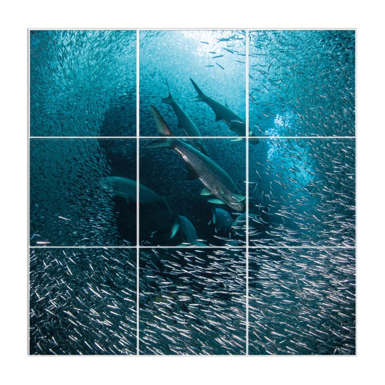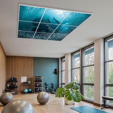 Entdecken Sie unsere vielseitigen Lichtdecken, hier in der Größe 186 x 186cm mit dem Motiv Motiv Fische im Meer - Ihre Beleuchtungslösung für jede Umgebung Beleuchten Sie Ihren Raum nicht nur, sondern schaffen Sie Atmosphäre! Die banjado Lichtdecke verwandelt jeden Ort, ob zu Hause, in Praxen, Büros oder Studios in eine Wohlfühloase. Unsere einzelnen Elemente haben eine genormte Einheitsgröße von 62 x 62cm und können somit in jede gängige Rasterdecken verbaut werden. So finden Sie Ihre passende Ausführung: Gern helfen wir Ihnen, die passende Ausführung zu wählen. Hierfür muss die aktuelle Gegebenheit Ihrer Decke oder Wand beachtet werden. Haben Sie bereits eine Rasterdecke (auch Odenwalddecke genannt)? Hier bestellen Sie lediglich das Motiv + Beleuchtungspanel, denn beides wird in die bereits vorhandene Decke eingelegt. Haben Sie eine glatte Decke mit Lichtauslass oder möchten die Lichtdecke an der Wand befestigen? Hier bestellen Sie bitte Motiv + Beleuchtungspanel + Deckenbefestigung, eine Aufbauanleitung liegt immer bei. Die Lichtdecke kann sowohl an der Decke als auch an der Wand montiert werden, perfekt für kreative Lichtakzente oder alternative Beleuchtungslösungen. Haben Sie bereits eine Lichtdecke und möchten nur das Motiv wechseln? Hier bestellen Sie bitte nur Motiv, der Wechsel ist denkbar einfach. Der Aufbau Ihrer banjado Lichtdecke gestaltet sich unkompliziert, dank einer verständlichen Anleitung, die Ihnen Schritt für Schritt durch den Montageprozess hilft. Für die endgültige Installation und den sicheren Anschluss empfehlen wir die Hinzuziehung eines Fachmanns, um die optimale Funktion und Sicherheit Ihrer Beleuchtung zu gewährleisten. Falls Sie einen Fachmann für die Installation benötigen, geben Sie uns gern Bescheid, wir vermitteln Ihnen gern einen geeigneten Ansprechpartner aus Ihrer Nähe. Steuerung: Steigern Sie Ihr Beleuchtungserlebnis mit der nahtlosen Integration in Ihr Smart Home. Durch die Kompatibilität mit der SmartLife App, Alexa und Google Assistant wird Ihr Smartphone zur zentralen Steuerungseinheit. Ihr Handy fungiert hierbei sozusagen als Fernbedienung. Legen Sie individuelle Lichtszenen in der App fest, die bei Aktivierung über den Wand-Ein-/Ausschalter immer wieder abgerufen werden können ohne Handy. Mit der Szenenfunktion in der Smart App können Sie die Beleuchtung personalisieren und steuern, sodass sie auf Ihre individuellen Bedürfnisse, Tagesrhythmus und Stimmung zugeschnitten ist. Beispielsweise können Sie sich in der Morgendämmerung durch ein sanftes Licht wecken lassen oder das Licht der Praxis werktags um 7 Uhr automatisch einschalten lassen. Dieses kann dann natürlich auch zu einer bestimmten Zeit automatisch ausgeschaltet werden. Motivwahl: Diese einzigartige Lichtdecke zeichnet sich durch ihre Fähigkeit aus, die Lichtfarbe je nach gewähltem Motiv anzupassen - ein Baum wirft ein sanftes grünes Licht, während eine Wolkendecke Ihren Raum in ein beruhigendes blaues Leuchten hüllt. Berücksichtigen Sie dies bitte bei Ihrer Motivauswahl. Sie können das Motiv jederzeit ohne großen Aufwand austauschen, ob nach Jahreszeit oder anderem Anlass, unsere Auswahl lässt kaum Wünsche offen. Wir fertigen Ihnen gern eine personalisierte Lichtdecke mit einem eigenen Motiv oder Logo oder Foto, schreiben Sie uns jederzeit an. Technische Daten: Das Motiv ist auf einer 4mm starken Acrylglas Scheibe aufgebracht, das Gesamtgewicht Ihrer Ausführung beträgt 44,4kg. Die Farbtemperatur lässt sich frei einstellen von 3000 bis 6000 Kelvin, damit können Sie stufenlos zwischen warmweiß, neutralweiß und kaltweiß wählen. Die Gesamtleistung bei Ihrer gewählten Ausführung beträgt 360W. Der Lichtstrom beträgt 3600 Lumen, die Nennspannung 230 V. Die Lichtdecke ist mit Schutzart IP20 für den Innenbereich konzipiert und sollte nicht im Nassbereich verwendet werden.