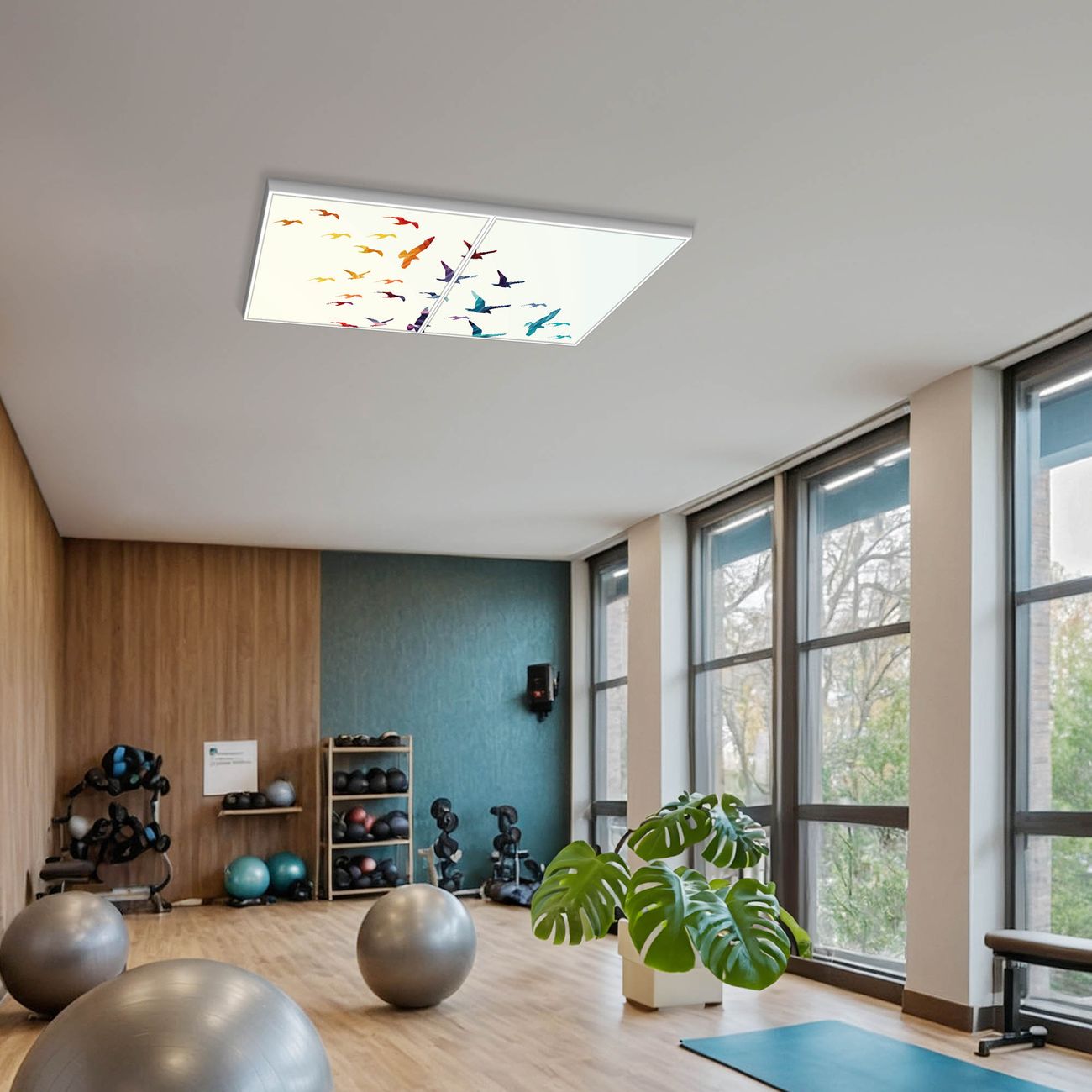 Entdecken Sie unsere vielseitigen Lichtdecken, hier in der Größe 124 x 62cm mit dem Motiv Motiv Fliegende Vögel - Ihre Beleuchtungslösung für jede Umgebung Beleuchten Sie Ihren Raum nicht nur, sondern schaffen Sie Atmosphäre! Die banjado Lichtdecke verwandelt jeden Ort, ob zu Hause, in Praxen, Büros oder Studios in eine Wohlfühloase. Unsere einzelnen Elemente haben eine genormte Einheitsgröße von 62 x 62cm und können somit in jede gängige Rasterdecken verbaut werden. So finden Sie Ihre passende Ausführung: Gern helfen wir Ihnen, die passende Ausführung zu wählen. Hierfür muss die aktuelle Gegebenheit Ihrer Decke oder Wand beachtet werden. Haben Sie bereits eine Rasterdecke (auch Odenwalddecke genannt)? Hier bestellen Sie lediglich das Motiv + Beleuchtungspanel, denn beides wird in die bereits vorhandene Decke eingelegt. Haben Sie eine glatte Decke mit Lichtauslass oder möchten die Lichtdecke an der Wand befestigen? Hier bestellen Sie bitte Motiv + Beleuchtungspanel + Deckenbefestigung, eine Aufbauanleitung liegt immer bei. Die Lichtdecke kann sowohl an der Decke als auch an der Wand montiert werden, perfekt für kreative Lichtakzente oder alternative Beleuchtungslösungen. Haben Sie bereits eine Lichtdecke und möchten nur das Motiv wechseln? Hier bestellen Sie bitte nur Motiv, der Wechsel ist denkbar einfach. Der Aufbau Ihrer banjado Lichtdecke gestaltet sich unkompliziert, dank einer verständlichen Anleitung, die Ihnen Schritt für Schritt durch den Montageprozess hilft. Für die endgültige Installation und den sicheren Anschluss empfehlen wir die Hinzuziehung eines Fachmanns, um die optimale Funktion und Sicherheit Ihrer Beleuchtung zu gewährleisten. Falls Sie einen Fachmann für die Installation benötigen, geben Sie uns gern Bescheid, wir vermitteln Ihnen gern einen geeigneten Ansprechpartner aus Ihrer Nähe. Steuerung: Steigern Sie Ihr Beleuchtungserlebnis mit der nahtlosen Integration in Ihr Smart Home. Durch die Kompatibilität mit der SmartLife App, Alexa und Google Assistant wird Ihr Smartphone zur zentralen Steuerungseinheit. Ihr Handy fungiert hierbei sozusagen als Fernbedienung. Legen Sie individuelle Lichtszenen in der App fest, die bei Aktivierung über den Wand-Ein-/Ausschalter immer wieder abgerufen werden können ohne Handy. Mit der Szenenfunktion in der Smart App können Sie die Beleuchtung personalisieren und steuern, sodass sie auf Ihre individuellen Bedürfnisse, Tagesrhythmus und Stimmung zugeschnitten ist. Beispielsweise können Sie sich in der Morgendämmerung durch ein sanftes Licht wecken lassen oder das Licht der Praxis werktags um 7 Uhr automatisch einschalten lassen. Dieses kann dann natürlich auch zu einer bestimmten Zeit automatisch ausgeschaltet werden. Motivwahl: Diese einzigartige Lichtdecke zeichnet sich durch ihre Fähigkeit aus, die Lichtfarbe je nach gewähltem Motiv anzupassen - ein Baum wirft ein sanftes grünes Licht, während eine Wolkendecke Ihren Raum in ein beruhigendes blaues Leuchten hüllt. Berücksichtigen Sie dies bitte bei Ihrer Motivauswahl. Sie können das Motiv jederzeit ohne großen Aufwand austauschen, ob nach Jahreszeit oder anderem Anlass, unsere Auswahl lässt kaum Wünsche offen. Wir fertigen Ihnen gern eine personalisierte Lichtdecke mit einem eigenen Motiv oder Logo oder Foto, schreiben Sie uns jederzeit an. Technische Daten: Das Motiv ist auf einer 4mm starken Acrylglas Scheibe aufgebracht, das Gesamtgewicht Ihrer Ausführung beträgt 9,9kg. Die Farbtemperatur lässt sich frei einstellen von 3000 bis 6000 Kelvin, damit können Sie stufenlos zwischen warmweiß, neutralweiß und kaltweiß wählen. Die Gesamtleistung bei Ihrer gewählten Ausführung beträgt 80W. Der Lichtstrom beträgt 3600 Lumen, die Nennspannung 230 V. Die Lichtdecke ist mit Schutzart IP20 für den Innenbereich konzipiert und sollte nicht im Nassbereich verwendet werden.