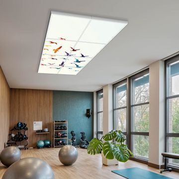 Entdecken Sie unsere vielseitigen Lichtdecken, hier in der Größe 124 x 248cm mit dem Motiv Motiv Fliegende Vögel - Ihre Beleuchtungslösung für jede Umgebung Beleuchten Sie Ihren Raum nicht nur, sondern schaffen Sie Atmosphäre! Die banjado Lichtdecke verwandelt jeden Ort, ob zu Hause, in Praxen, Büros oder Studios in eine Wohlfühloase. Unsere einzelnen Elemente haben eine genormte Einheitsgröße von 62 x 62cm und können somit in jede gängige Rasterdecken verbaut werden. So finden Sie Ihre passende Ausführung: Gern helfen wir Ihnen, die passende Ausführung zu wählen. Hierfür muss die aktuelle Gegebenheit Ihrer Decke oder Wand beachtet werden. Haben Sie bereits eine Rasterdecke (auch Odenwalddecke genannt)? Hier bestellen Sie lediglich das Motiv + Beleuchtungspanel, denn beides wird in die bereits vorhandene Decke eingelegt. Haben Sie eine glatte Decke mit Lichtauslass oder möchten die Lichtdecke an der Wand befestigen? Hier bestellen Sie bitte Motiv + Beleuchtungspanel + Deckenbefestigung, eine Aufbauanleitung liegt immer bei. Die Lichtdecke kann sowohl an der Decke als auch an der Wand montiert werden, perfekt für kreative Lichtakzente oder alternative Beleuchtungslösungen. Haben Sie bereits eine Lichtdecke und möchten nur das Motiv wechseln? Hier bestellen Sie bitte nur Motiv, der Wechsel ist denkbar einfach. Der Aufbau Ihrer banjado Lichtdecke gestaltet sich unkompliziert, dank einer verständlichen Anleitung, die Ihnen Schritt für Schritt durch den Montageprozess hilft. Für die endgültige Installation und den sicheren Anschluss empfehlen wir die Hinzuziehung eines Fachmanns, um die optimale Funktion und Sicherheit Ihrer Beleuchtung zu gewährleisten. Falls Sie einen Fachmann für die Installation benötigen, geben Sie uns gern Bescheid, wir vermitteln Ihnen gern einen geeigneten Ansprechpartner aus Ihrer Nähe. Steuerung: Steigern Sie Ihr Beleuchtungserlebnis mit der nahtlosen Integration in Ihr Smart Home. Durch die Kompatibilität mit der SmartLife App, Alexa und Google Assistant wird Ihr Smartphone zur zentralen Steuerungseinheit. Ihr Handy fungiert hierbei sozusagen als Fernbedienung. Legen Sie individuelle Lichtszenen in der App fest, die bei Aktivierung über den Wand-Ein-/Ausschalter immer wieder abgerufen werden können ohne Handy. Mit der Szenenfunktion in der Smart App können Sie die Beleuchtung personalisieren und steuern, sodass sie auf Ihre individuellen Bedürfnisse, Tagesrhythmus und Stimmung zugeschnitten ist. Beispielsweise können Sie sich in der Morgendämmerung durch ein sanftes Licht wecken lassen oder das Licht der Praxis werktags um 7 Uhr automatisch einschalten lassen. Dieses kann dann natürlich auch zu einer bestimmten Zeit automatisch ausgeschaltet werden. Motivwahl: Diese einzigartige Lichtdecke zeichnet sich durch ihre Fähigkeit aus, die Lichtfarbe je nach gewähltem Motiv anzupassen - ein Baum wirft ein sanftes grünes Licht, während eine Wolkendecke Ihren Raum in ein beruhigendes blaues Leuchten hüllt. Berücksichtigen Sie dies bitte bei Ihrer Motivauswahl. Sie können das Motiv jederzeit ohne großen Aufwand austauschen, ob nach Jahreszeit oder anderem Anlass, unsere Auswahl lässt kaum Wünsche offen. Wir fertigen Ihnen gern eine personalisierte Lichtdecke mit einem eigenen Motiv oder Logo oder Foto, schreiben Sie uns jederzeit an. Technische Daten: Das Motiv ist auf einer 4mm starken Acrylglas Scheibe aufgebracht, das Gesamtgewicht Ihrer Ausführung beträgt 39,4kg. Die Farbtemperatur lässt sich frei einstellen von 3000 bis 6000 Kelvin, damit können Sie stufenlos zwischen warmweiß, neutralweiß und kaltweiß wählen. Die Gesamtleistung bei Ihrer gewählten Ausführung beträgt 320W. Der Lichtstrom beträgt 3600 Lumen, die Nennspannung 230 V. Die Lichtdecke ist mit Schutzart IP20 für den Innenbereich konzipiert und sollte nicht im Nassbereich verwendet werden.