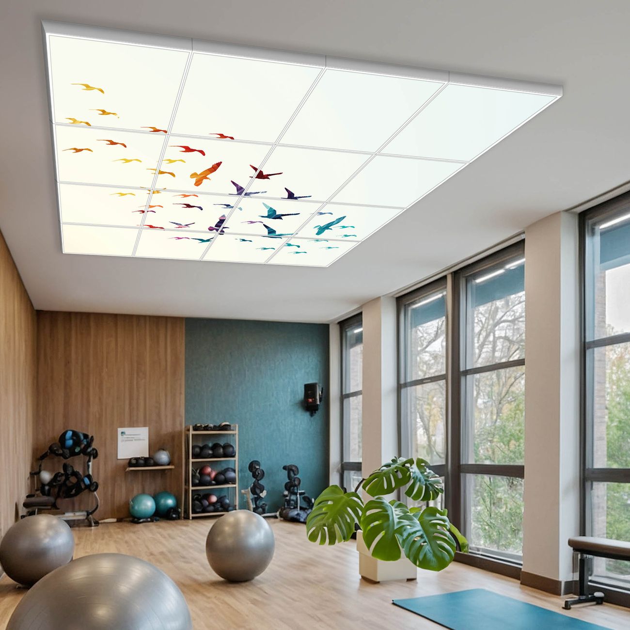 Entdecken Sie unsere vielseitigen Lichtdecken, hier in der Größe 248 x 248cm mit dem Motiv Motiv Fliegende Vögel - Ihre Beleuchtungslösung für jede Umgebung Beleuchten Sie Ihren Raum nicht nur, sondern schaffen Sie Atmosphäre! Die banjado Lichtdecke verwandelt jeden Ort, ob zu Hause, in Praxen, Büros oder Studios in eine Wohlfühloase. Unsere einzelnen Elemente haben eine genormte Einheitsgröße von 62 x 62cm und können somit in jede gängige Rasterdecken verbaut werden. So finden Sie Ihre passende Ausführung: Gern helfen wir Ihnen, die passende Ausführung zu wählen. Hierfür muss die aktuelle Gegebenheit Ihrer Decke oder Wand beachtet werden. Haben Sie bereits eine Rasterdecke (auch Odenwalddecke genannt)? Hier bestellen Sie lediglich das Motiv + Beleuchtungspanel, denn beides wird in die bereits vorhandene Decke eingelegt. Haben Sie eine glatte Decke mit Lichtauslass oder möchten die Lichtdecke an der Wand befestigen? Hier bestellen Sie bitte Motiv + Beleuchtungspanel + Deckenbefestigung, eine Aufbauanleitung liegt immer bei. Die Lichtdecke kann sowohl an der Decke als auch an der Wand montiert werden, perfekt für kreative Lichtakzente oder alternative Beleuchtungslösungen. Haben Sie bereits eine Lichtdecke und möchten nur das Motiv wechseln? Hier bestellen Sie bitte nur Motiv, der Wechsel ist denkbar einfach. Der Aufbau Ihrer banjado Lichtdecke gestaltet sich unkompliziert, dank einer verständlichen Anleitung, die Ihnen Schritt für Schritt durch den Montageprozess hilft. Für die endgültige Installation und den sicheren Anschluss empfehlen wir die Hinzuziehung eines Fachmanns, um die optimale Funktion und Sicherheit Ihrer Beleuchtung zu gewährleisten. Falls Sie einen Fachmann für die Installation benötigen, geben Sie uns gern Bescheid, wir vermitteln Ihnen gern einen geeigneten Ansprechpartner aus Ihrer Nähe. Steuerung: Steigern Sie Ihr Beleuchtungserlebnis mit der nahtlosen Integration in Ihr Smart Home. Durch die Kompatibilität mit der SmartLife App, Alexa und Google Assistant wird Ihr Smartphone zur zentralen Steuerungseinheit. Ihr Handy fungiert hierbei sozusagen als Fernbedienung. Legen Sie individuelle Lichtszenen in der App fest, die bei Aktivierung über den Wand-Ein-/Ausschalter immer wieder abgerufen werden können ohne Handy. Mit der Szenenfunktion in der Smart App können Sie die Beleuchtung personalisieren und steuern, sodass sie auf Ihre individuellen Bedürfnisse, Tagesrhythmus und Stimmung zugeschnitten ist. Beispielsweise können Sie sich in der Morgendämmerung durch ein sanftes Licht wecken lassen oder das Licht der Praxis werktags um 7 Uhr automatisch einschalten lassen. Dieses kann dann natürlich auch zu einer bestimmten Zeit automatisch ausgeschaltet werden. Motivwahl: Diese einzigartige Lichtdecke zeichnet sich durch ihre Fähigkeit aus, die Lichtfarbe je nach gewähltem Motiv anzupassen - ein Baum wirft ein sanftes grünes Licht, während eine Wolkendecke Ihren Raum in ein beruhigendes blaues Leuchten hüllt. Berücksichtigen Sie dies bitte bei Ihrer Motivauswahl. Sie können das Motiv jederzeit ohne großen Aufwand austauschen, ob nach Jahreszeit oder anderem Anlass, unsere Auswahl lässt kaum Wünsche offen. Wir fertigen Ihnen gern eine personalisierte Lichtdecke mit einem eigenen Motiv oder Logo oder Foto, schreiben Sie uns jederzeit an. Technische Daten: Das Motiv ist auf einer 4mm starken Acrylglas Scheibe aufgebracht, das Gesamtgewicht Ihrer Ausführung beträgt 78,9kg. Die Farbtemperatur lässt sich frei einstellen von 3000 bis 6000 Kelvin, damit können Sie stufenlos zwischen warmweiß, neutralweiß und kaltweiß wählen. Die Gesamtleistung bei Ihrer gewählten Ausführung beträgt 640W. Der Lichtstrom beträgt 3600 Lumen, die Nennspannung 230 V. Die Lichtdecke ist mit Schutzart IP20 für den Innenbereich konzipiert und sollte nicht im Nassbereich verwendet werden.