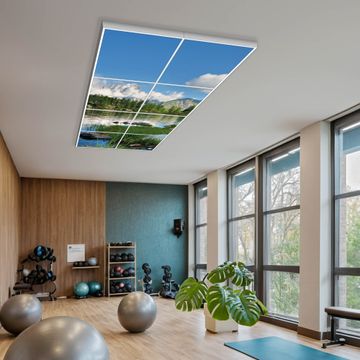 Entdecken Sie unsere vielseitigen Lichtdecken, hier in der Größe 124 x 248cm mit dem Motiv Motiv Gebirgssee - Ihre Beleuchtungslösung für jede Umgebung Beleuchten Sie Ihren Raum nicht nur, sondern schaffen Sie Atmosphäre! Die banjado Lichtdecke verwandelt jeden Ort, ob zu Hause, in Praxen, Büros oder Studios in eine Wohlfühloase. Unsere einzelnen Elemente haben eine genormte Einheitsgröße von 62 x 62cm und können somit in jede gängige Rasterdecken verbaut werden. So finden Sie Ihre passende Ausführung: Gern helfen wir Ihnen, die passende Ausführung zu wählen. Hierfür muss die aktuelle Gegebenheit Ihrer Decke oder Wand beachtet werden. Haben Sie bereits eine Rasterdecke (auch Odenwalddecke genannt)? Hier bestellen Sie lediglich das Motiv + Beleuchtungspanel, denn beides wird in die bereits vorhandene Decke eingelegt. Haben Sie eine glatte Decke mit Lichtauslass oder möchten die Lichtdecke an der Wand befestigen? Hier bestellen Sie bitte Motiv + Beleuchtungspanel + Deckenbefestigung, eine Aufbauanleitung liegt immer bei. Die Lichtdecke kann sowohl an der Decke als auch an der Wand montiert werden, perfekt für kreative Lichtakzente oder alternative Beleuchtungslösungen. Haben Sie bereits eine Lichtdecke und möchten nur das Motiv wechseln? Hier bestellen Sie bitte nur Motiv, der Wechsel ist denkbar einfach. Der Aufbau Ihrer banjado Lichtdecke gestaltet sich unkompliziert, dank einer verständlichen Anleitung, die Ihnen Schritt für Schritt durch den Montageprozess hilft. Für die endgültige Installation und den sicheren Anschluss empfehlen wir die Hinzuziehung eines Fachmanns, um die optimale Funktion und Sicherheit Ihrer Beleuchtung zu gewährleisten. Falls Sie einen Fachmann für die Installation benötigen, geben Sie uns gern Bescheid, wir vermitteln Ihnen gern einen geeigneten Ansprechpartner aus Ihrer Nähe. Steuerung: Steigern Sie Ihr Beleuchtungserlebnis mit der nahtlosen Integration in Ihr Smart Home. Durch die Kompatibilität mit der SmartLife App, Alexa und Google Assistant wird Ihr Smartphone zur zentralen Steuerungseinheit. Ihr Handy fungiert hierbei sozusagen als Fernbedienung. Legen Sie individuelle Lichtszenen in der App fest, die bei Aktivierung über den Wand-Ein-/Ausschalter immer wieder abgerufen werden können ohne Handy. Mit der Szenenfunktion in der Smart App können Sie die Beleuchtung personalisieren und steuern, sodass sie auf Ihre individuellen Bedürfnisse, Tagesrhythmus und Stimmung zugeschnitten ist. Beispielsweise können Sie sich in der Morgendämmerung durch ein sanftes Licht wecken lassen oder das Licht der Praxis werktags um 7 Uhr automatisch einschalten lassen. Dieses kann dann natürlich auch zu einer bestimmten Zeit automatisch ausgeschaltet werden. Motivwahl: Diese einzigartige Lichtdecke zeichnet sich durch ihre Fähigkeit aus, die Lichtfarbe je nach gewähltem Motiv anzupassen - ein Baum wirft ein sanftes grünes Licht, während eine Wolkendecke Ihren Raum in ein beruhigendes blaues Leuchten hüllt. Berücksichtigen Sie dies bitte bei Ihrer Motivauswahl. Sie können das Motiv jederzeit ohne großen Aufwand austauschen, ob nach Jahreszeit oder anderem Anlass, unsere Auswahl lässt kaum Wünsche offen. Wir fertigen Ihnen gern eine personalisierte Lichtdecke mit einem eigenen Motiv oder Logo oder Foto, schreiben Sie uns jederzeit an. Technische Daten: Das Motiv ist auf einer 4mm starken Acrylglas Scheibe aufgebracht, das Gesamtgewicht Ihrer Ausführung beträgt 39,4kg. Die Farbtemperatur lässt sich frei einstellen von 3000 bis 6000 Kelvin, damit können Sie stufenlos zwischen warmweiß, neutralweiß und kaltweiß wählen. Die Gesamtleistung bei Ihrer gewählten Ausführung beträgt 320W. Der Lichtstrom beträgt 3600 Lumen, die Nennspannung 230 V. Die Lichtdecke ist mit Schutzart IP20 für den Innenbereich konzipiert und sollte nicht im Nassbereich verwendet werden.