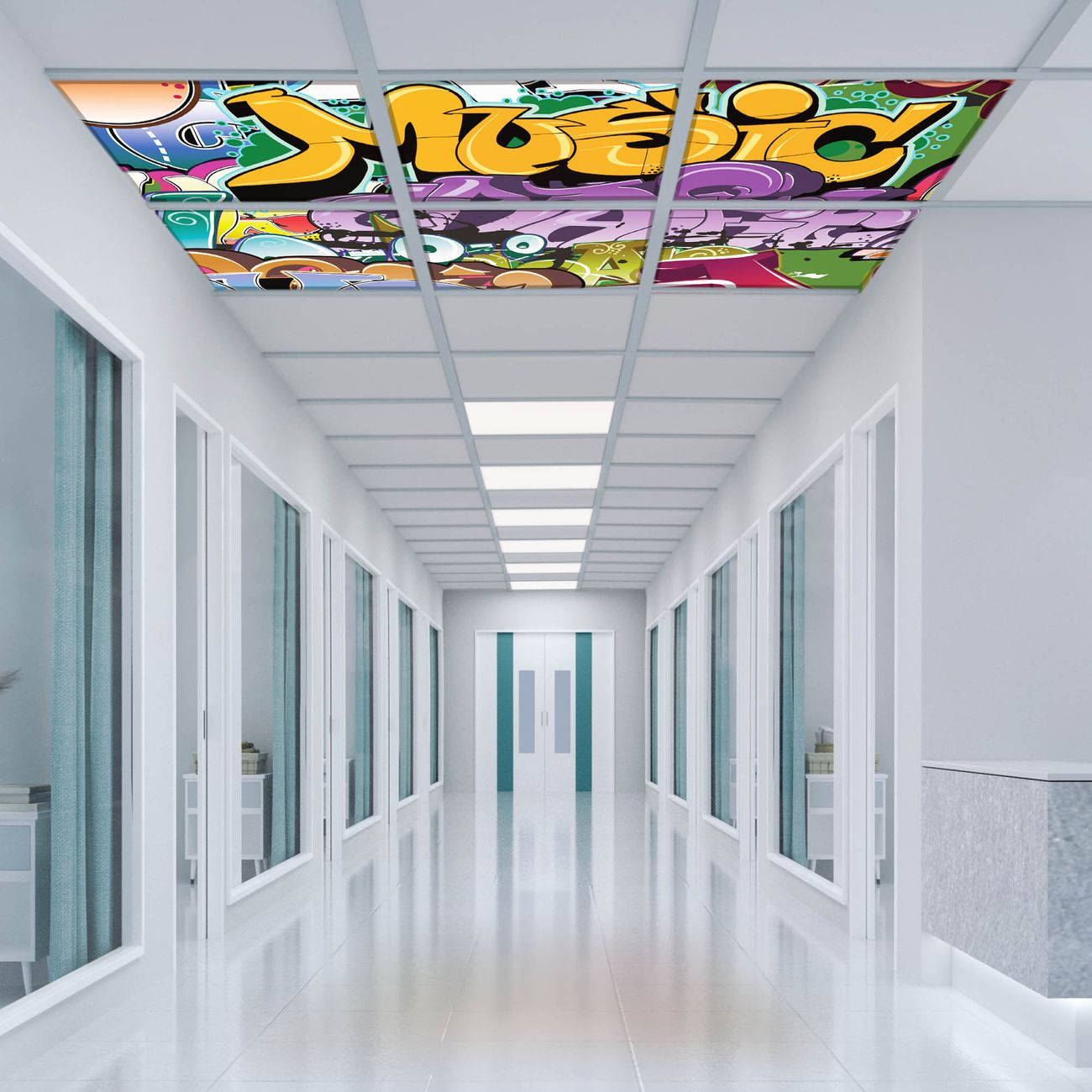 Entdecken Sie unsere vielseitigen Lichtdecken, hier in der Größe 186 x 124cm mit dem Motiv Motiv Graffiti - Ihre Beleuchtungslösung für jede Umgebung Beleuchten Sie Ihren Raum nicht nur, sondern schaffen Sie Atmosphäre! Die banjado Lichtdecke verwandelt jeden Ort, ob zu Hause, in Praxen, Büros oder Studios in eine Wohlfühloase. Unsere einzelnen Elemente haben eine genormte Einheitsgröße von 62 x 62cm und können somit in jede gängige Rasterdecken verbaut werden. So finden Sie Ihre passende Ausführung: Gern helfen wir Ihnen, die passende Ausführung zu wählen. Hierfür muss die aktuelle Gegebenheit Ihrer Decke oder Wand beachtet werden. Haben Sie bereits eine Rasterdecke (auch Odenwalddecke genannt)? Hier bestellen Sie lediglich das Motiv + Beleuchtungspanel, denn beides wird in die bereits vorhandene Decke eingelegt. Haben Sie eine glatte Decke mit Lichtauslass oder möchten die Lichtdecke an der Wand befestigen? Hier bestellen Sie bitte Motiv + Beleuchtungspanel + Deckenbefestigung, eine Aufbauanleitung liegt immer bei. Die Lichtdecke kann sowohl an der Decke als auch an der Wand montiert werden, perfekt für kreative Lichtakzente oder alternative Beleuchtungslösungen. Haben Sie bereits eine Lichtdecke und möchten nur das Motiv wechseln? Hier bestellen Sie bitte nur Motiv, der Wechsel ist denkbar einfach. Der Aufbau Ihrer banjado Lichtdecke gestaltet sich unkompliziert, dank einer verständlichen Anleitung, die Ihnen Schritt für Schritt durch den Montageprozess hilft. Für die endgültige Installation und den sicheren Anschluss empfehlen wir die Hinzuziehung eines Fachmanns, um die optimale Funktion und Sicherheit Ihrer Beleuchtung zu gewährleisten. Falls Sie einen Fachmann für die Installation benötigen, geben Sie uns gern Bescheid, wir vermitteln Ihnen gern einen geeigneten Ansprechpartner aus Ihrer Nähe. Steuerung: Steigern Sie Ihr Beleuchtungserlebnis mit der nahtlosen Integration in Ihr Smart Home. Durch die Kompatibilität mit der SmartLife App, Alexa und Google Assistant wird Ihr Smartphone zur zentralen Steuerungseinheit. Ihr Handy fungiert hierbei sozusagen als Fernbedienung. Legen Sie individuelle Lichtszenen in der App fest, die bei Aktivierung über den Wand-Ein-/Ausschalter immer wieder abgerufen werden können ohne Handy. Mit der Szenenfunktion in der Smart App können Sie die Beleuchtung personalisieren und steuern, sodass sie auf Ihre individuellen Bedürfnisse, Tagesrhythmus und Stimmung zugeschnitten ist. Beispielsweise können Sie sich in der Morgendämmerung durch ein sanftes Licht wecken lassen oder das Licht der Praxis werktags um 7 Uhr automatisch einschalten lassen. Dieses kann dann natürlich auch zu einer bestimmten Zeit automatisch ausgeschaltet werden. Motivwahl: Diese einzigartige Lichtdecke zeichnet sich durch ihre Fähigkeit aus, die Lichtfarbe je nach gewähltem Motiv anzupassen - ein Baum wirft ein sanftes grünes Licht, während eine Wolkendecke Ihren Raum in ein beruhigendes blaues Leuchten hüllt. Berücksichtigen Sie dies bitte bei Ihrer Motivauswahl. Sie können das Motiv jederzeit ohne großen Aufwand austauschen, ob nach Jahreszeit oder anderem Anlass, unsere Auswahl lässt kaum Wünsche offen. Wir fertigen Ihnen gern eine personalisierte Lichtdecke mit einem eigenen Motiv oder Logo oder Foto, schreiben Sie uns jederzeit an. Technische Daten: Das Motiv ist auf einer 4mm starken Acrylglas Scheibe aufgebracht, das Gesamtgewicht Ihrer Ausführung beträgt 26,6kg. Die Farbtemperatur lässt sich frei einstellen von 3000 bis 6000 Kelvin, damit können Sie stufenlos zwischen warmweiß, neutralweiß und kaltweiß wählen. Die Gesamtleistung bei Ihrer gewählten Ausführung beträgt 240W. Der Lichtstrom beträgt 3600 Lumen, die Nennspannung 230 V. Die Lichtdecke ist mit Schutzart IP20 für den Innenbereich konzipiert und sollte nicht im Nassbereich verwendet werden.